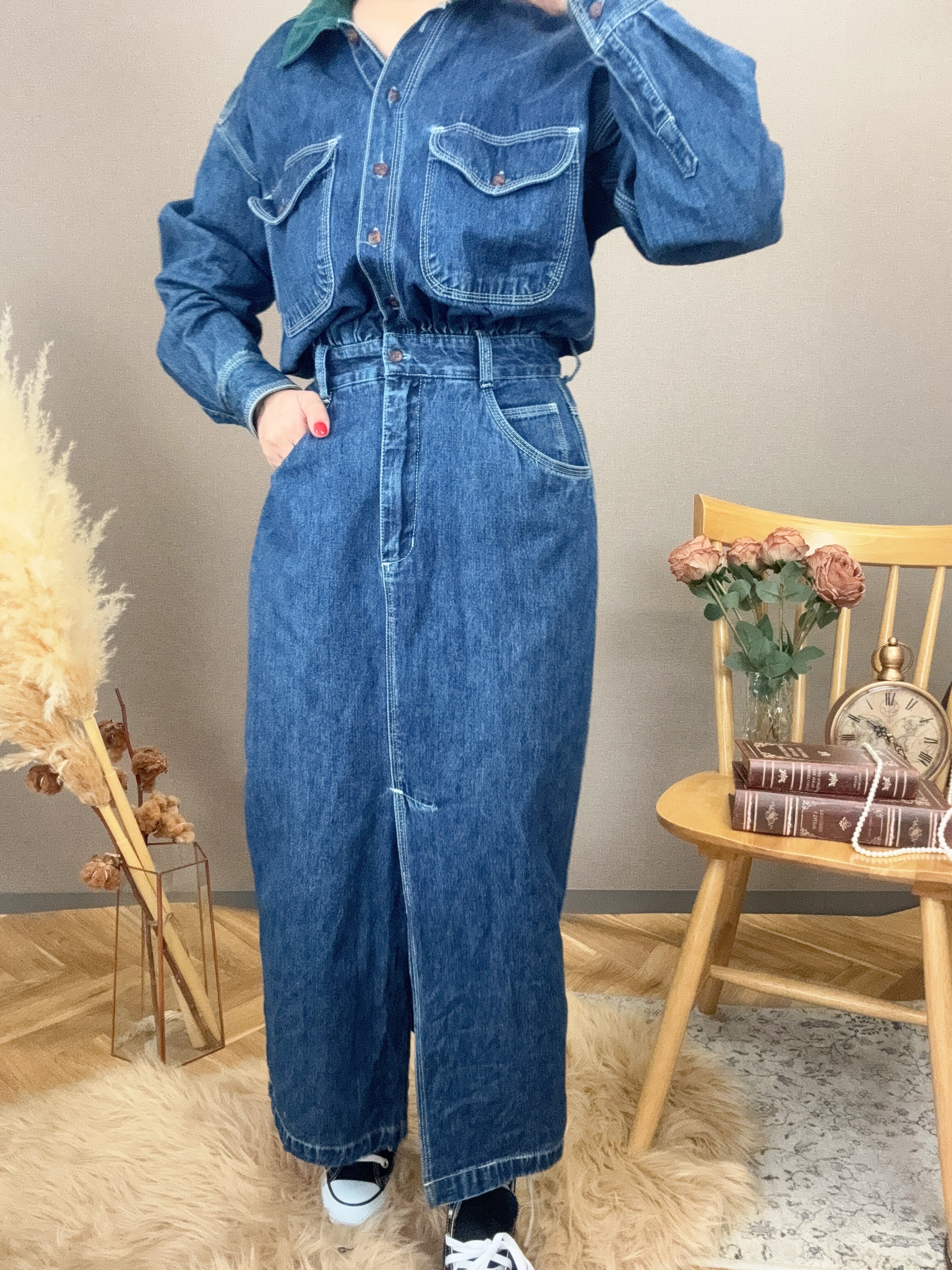 デニム素材にグリーンのコーデュロイ襟が映えるヴィンテージシャツワンピース。