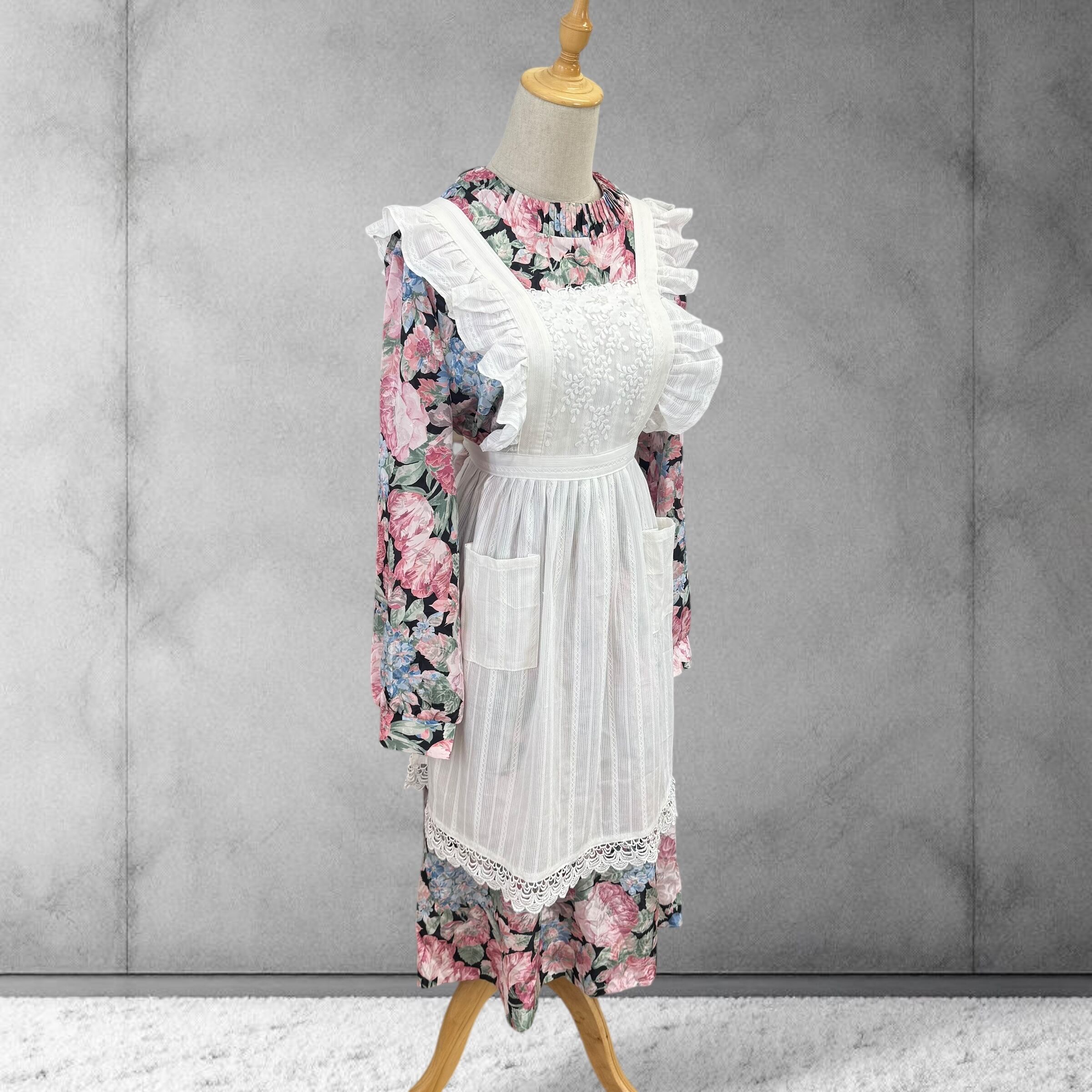 ふんわりフリルと繊細レースが可憐なホワイトのピナフォアエプロン。