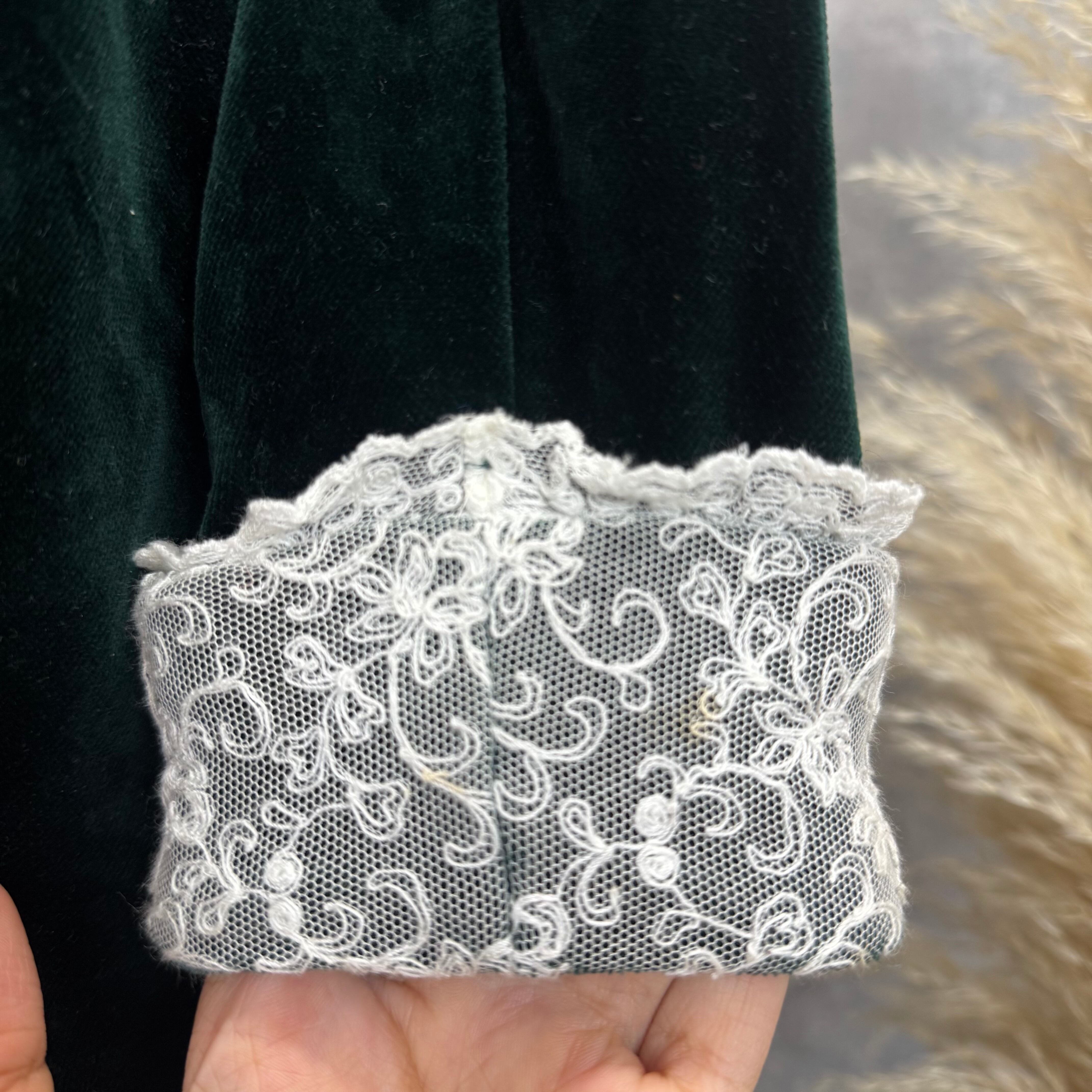 光の加減で深いフォレストグリーンからやわらかなグリーンまで表情を変える、ベルベット調の美しい生地感が魅力です。
