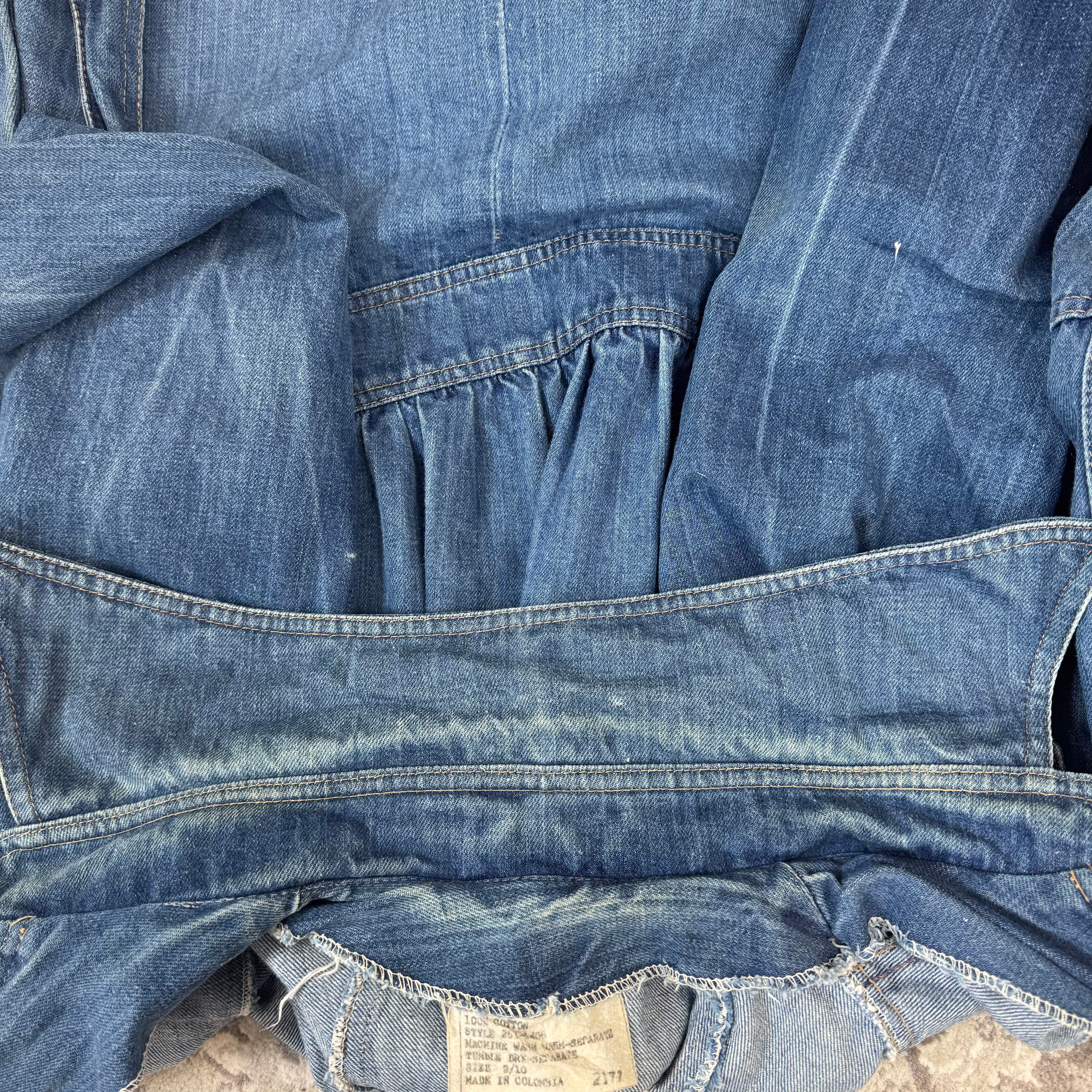 襟部分に折り目、スカート裾付近に白っぽい色抜けがございますが、デニムならではの経年変化としてお楽しみいただけます。