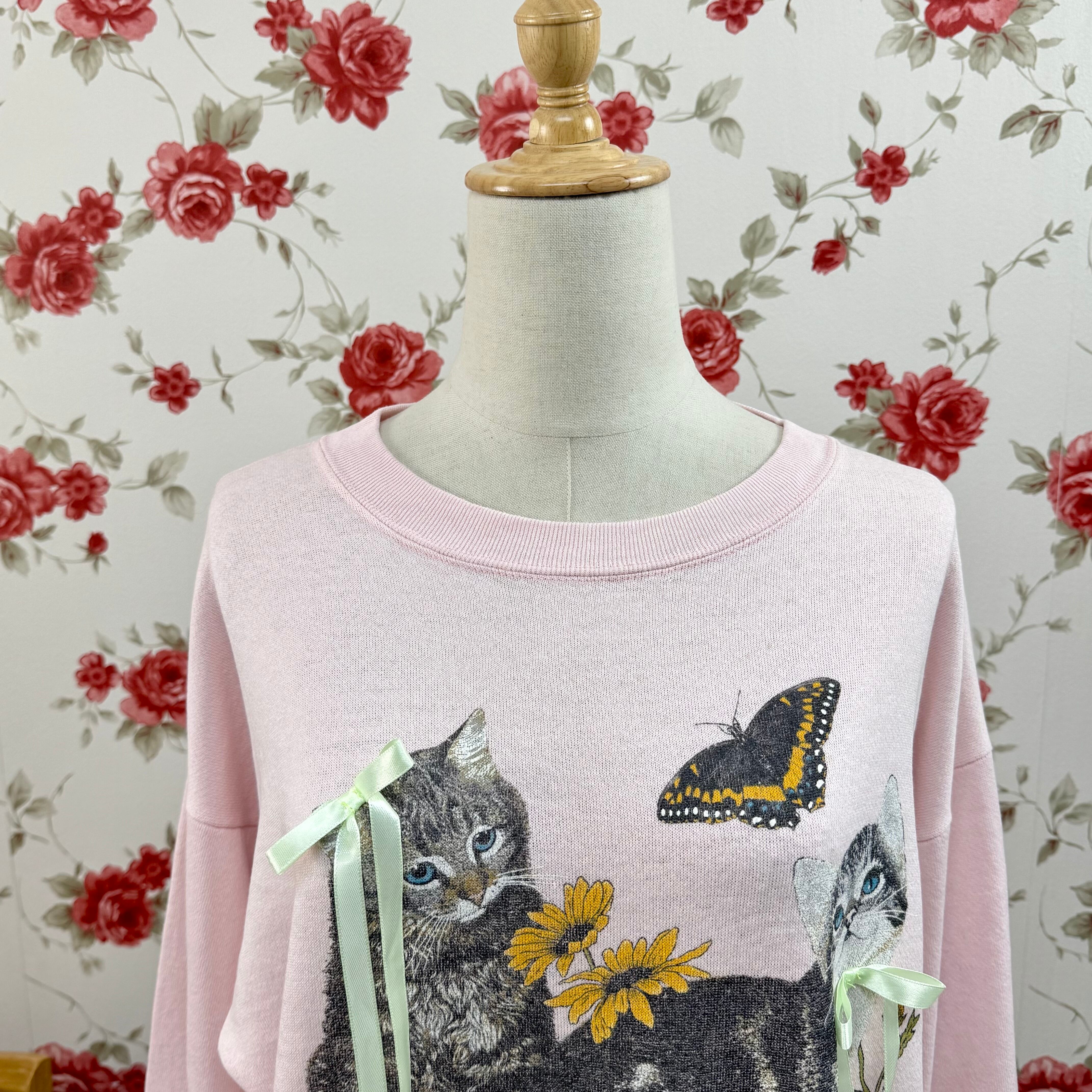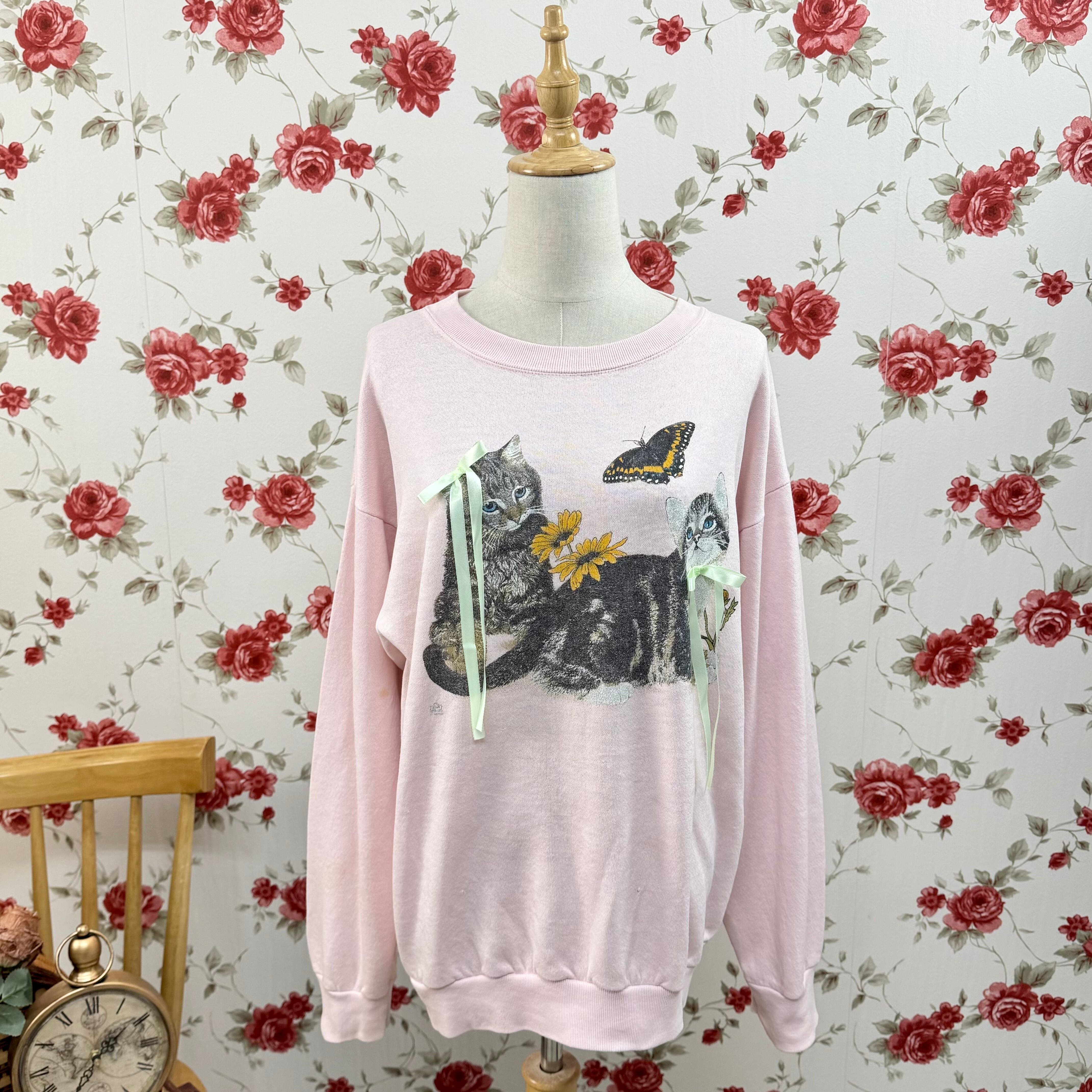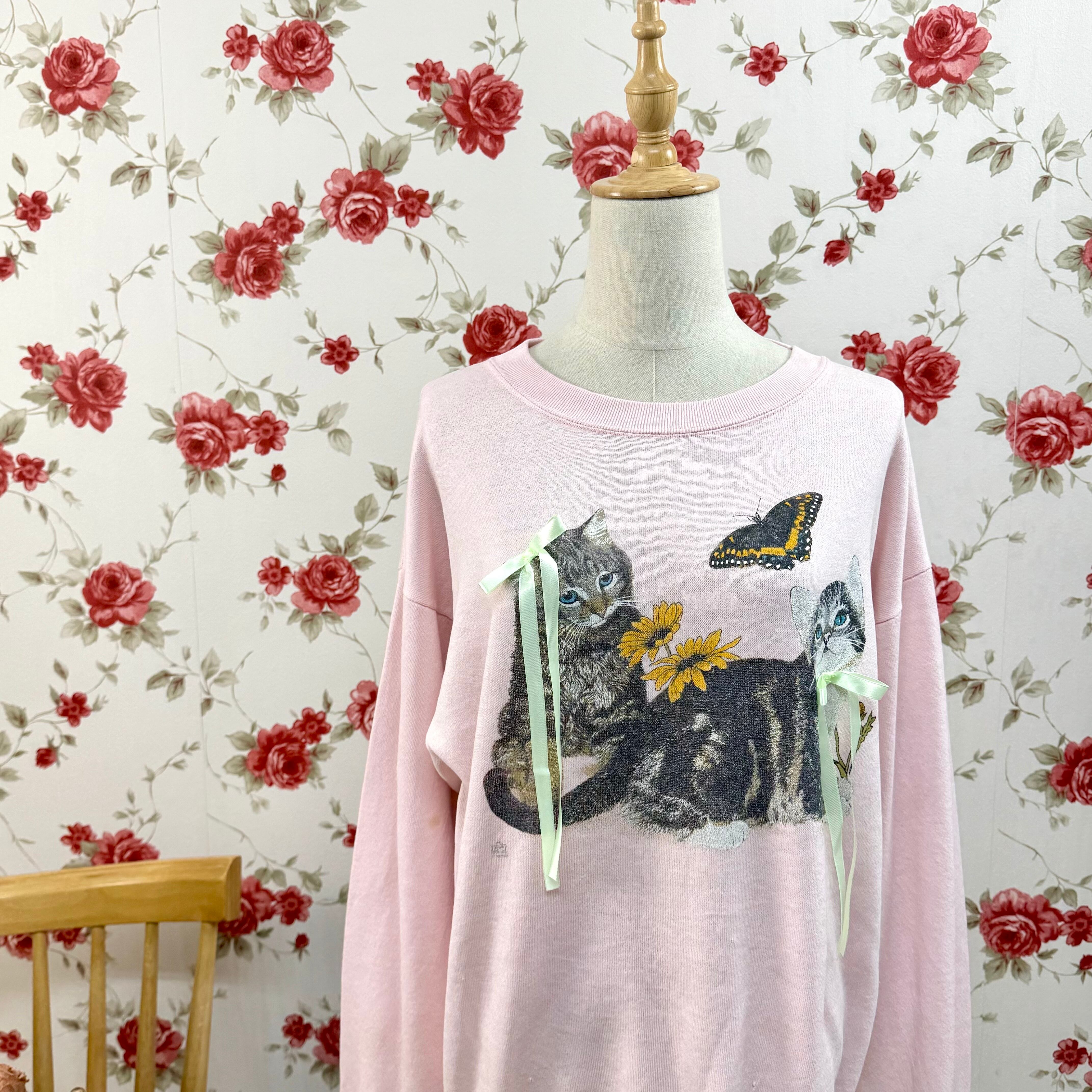USA製 COTTON GROVE 猫と蝶プリント スウェット ピンク ヴィンテージ ゆるだぼ アニマルデザイン レトロ トレーナー