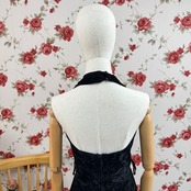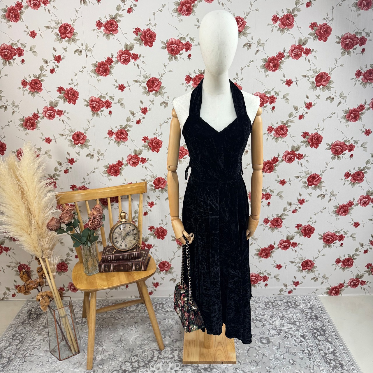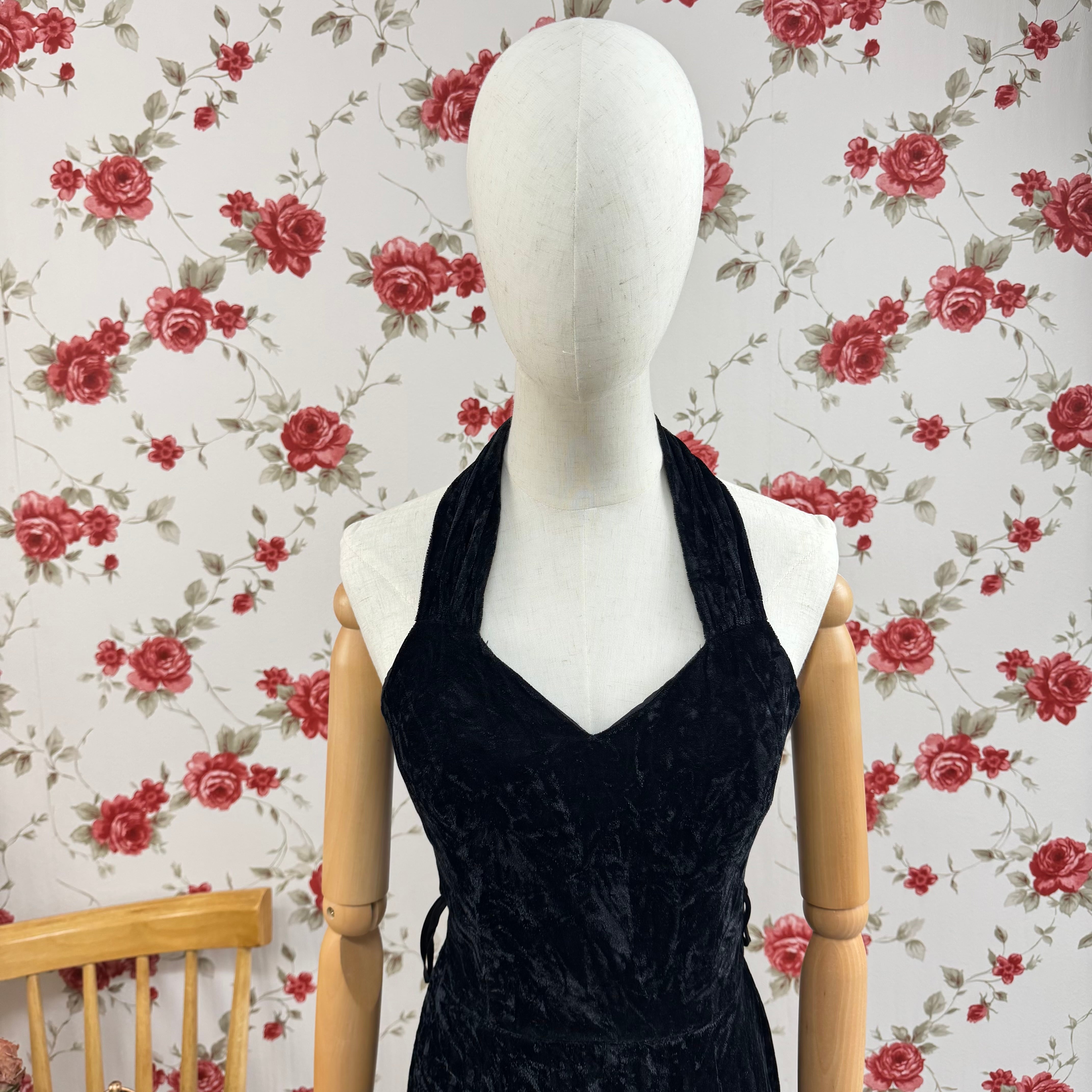 USAヴィンテージ Cheryl Kaye ベロアドレス バックシャン ブラック ベルベット ハルターネック ロングワンピース エレガント パーティー 古着