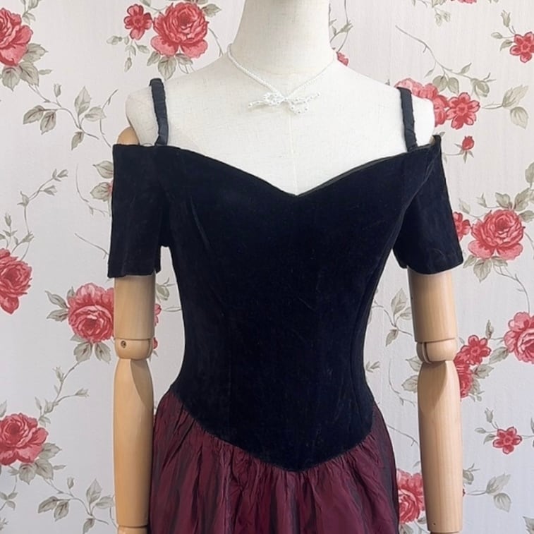 スカート部分には光沢のあるワインレッドのタフタ素材を使用した、英国製ヴィンテージドレス。