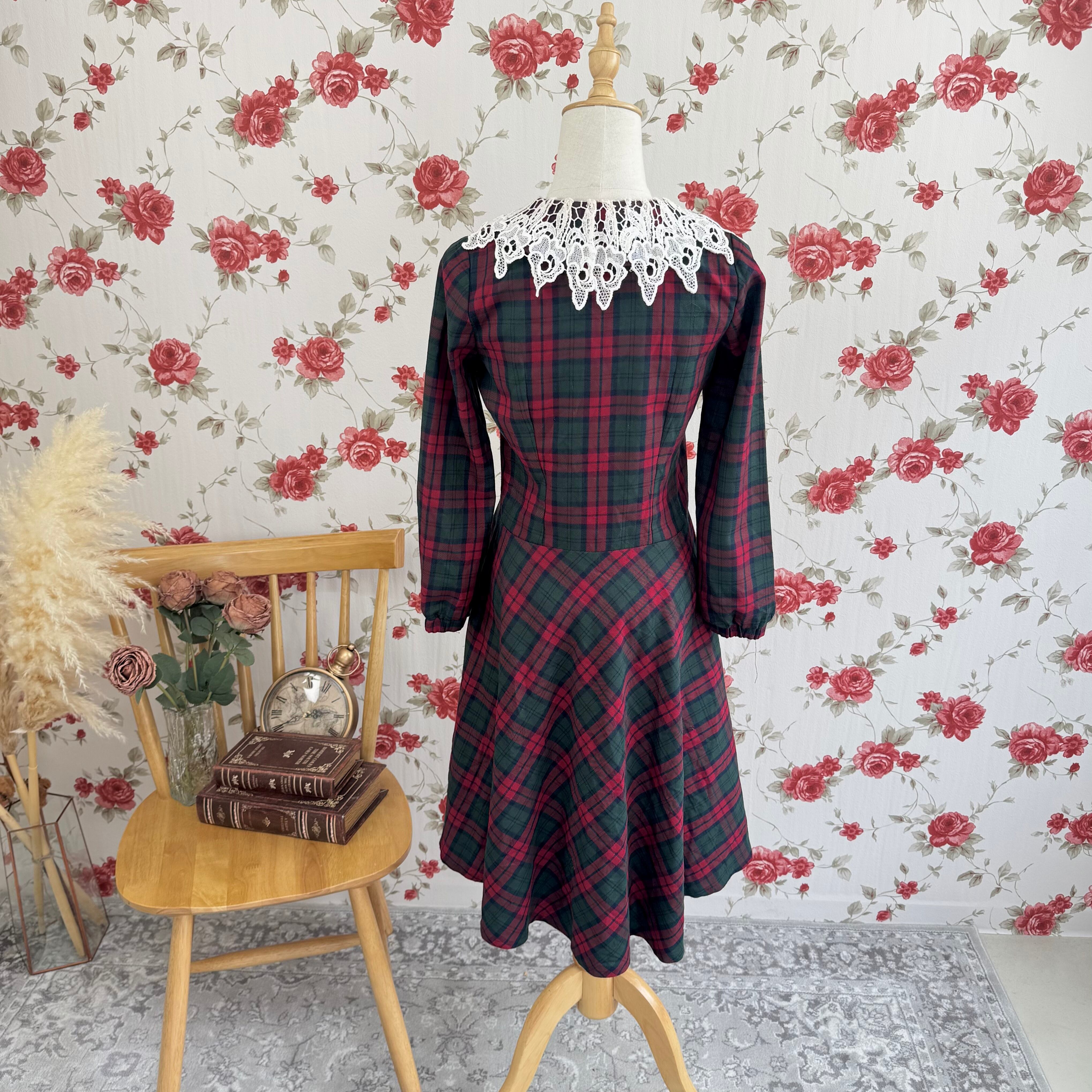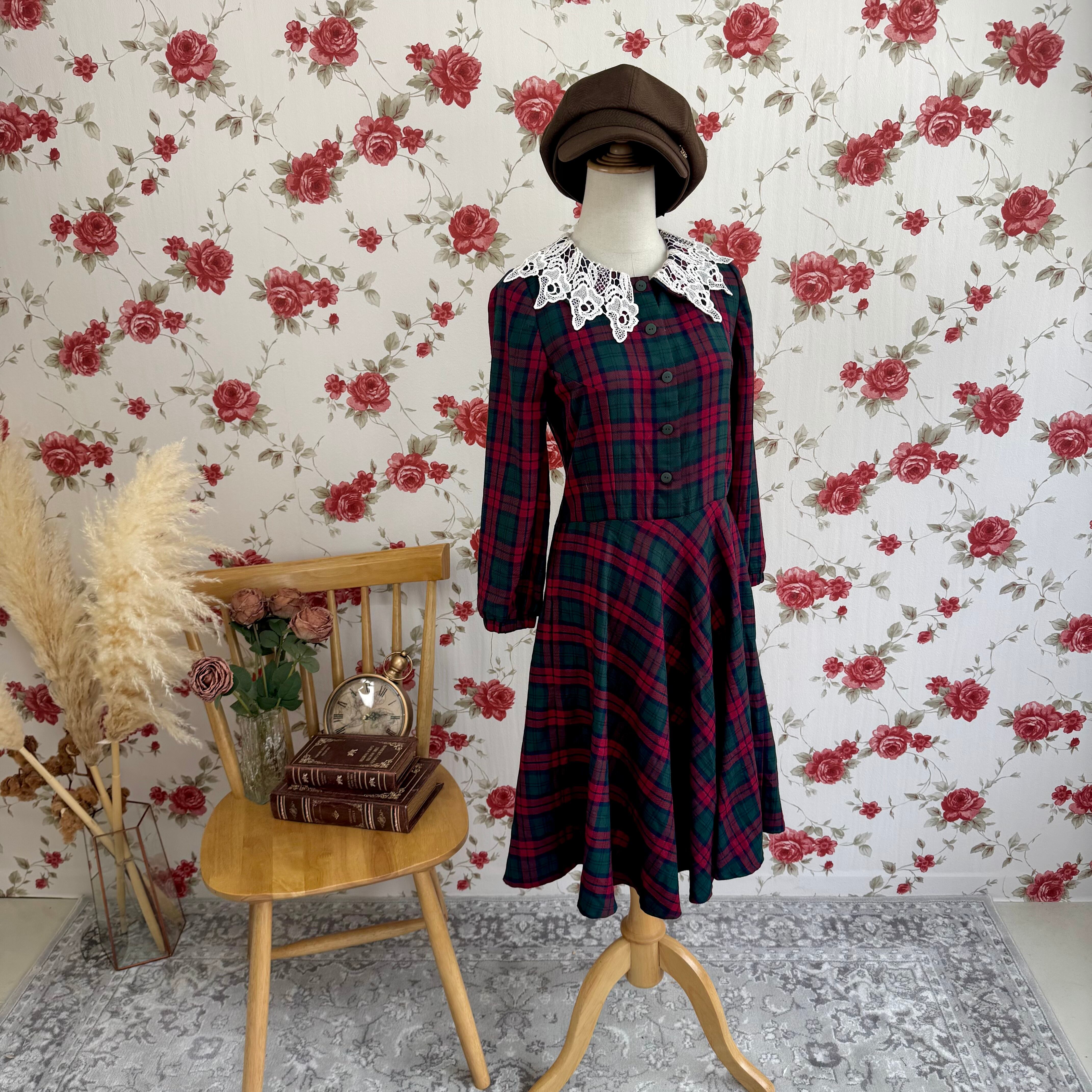 レトロなチェック柄と繊細なレース襟が目を惹く、クラシカルなヴィンテージワンピース。