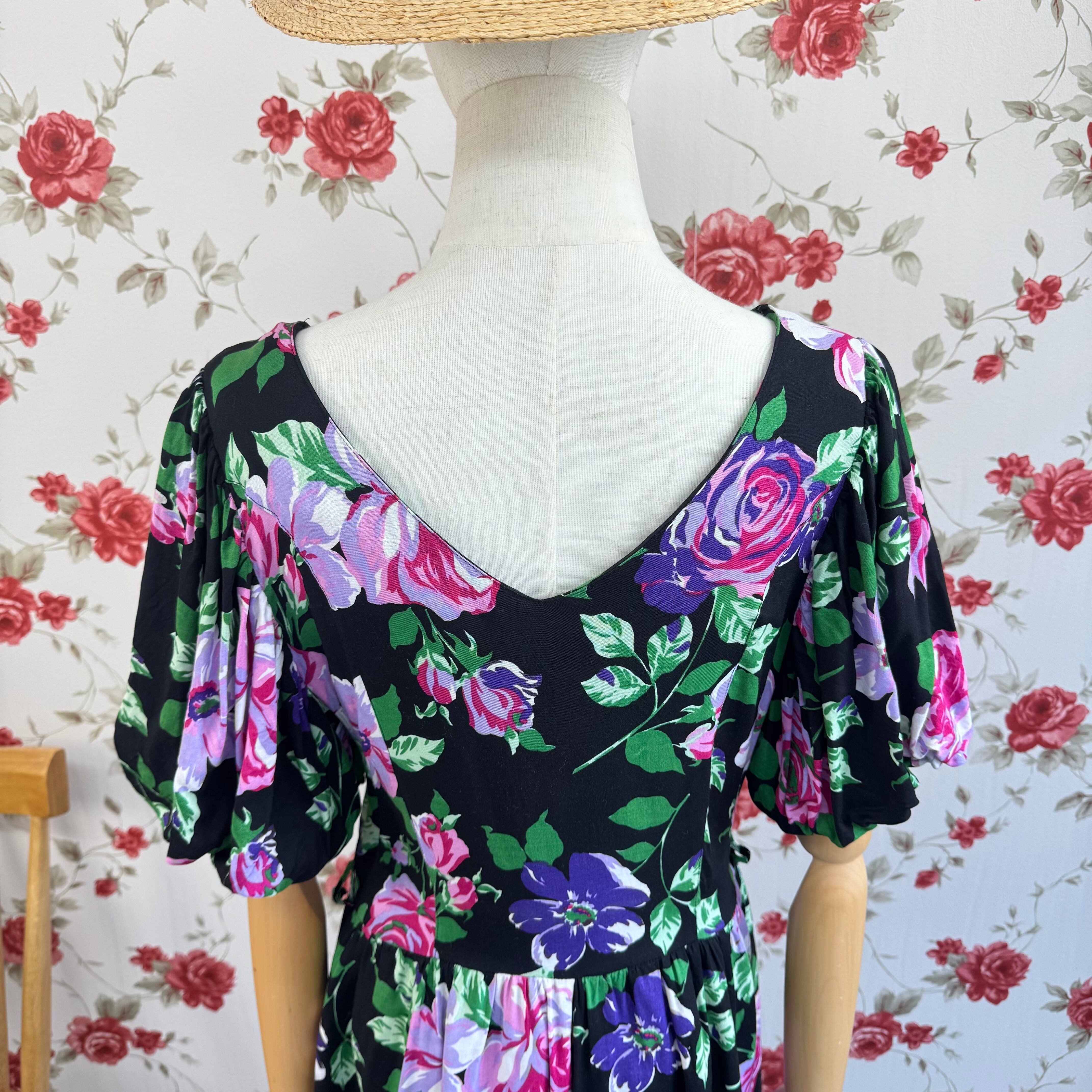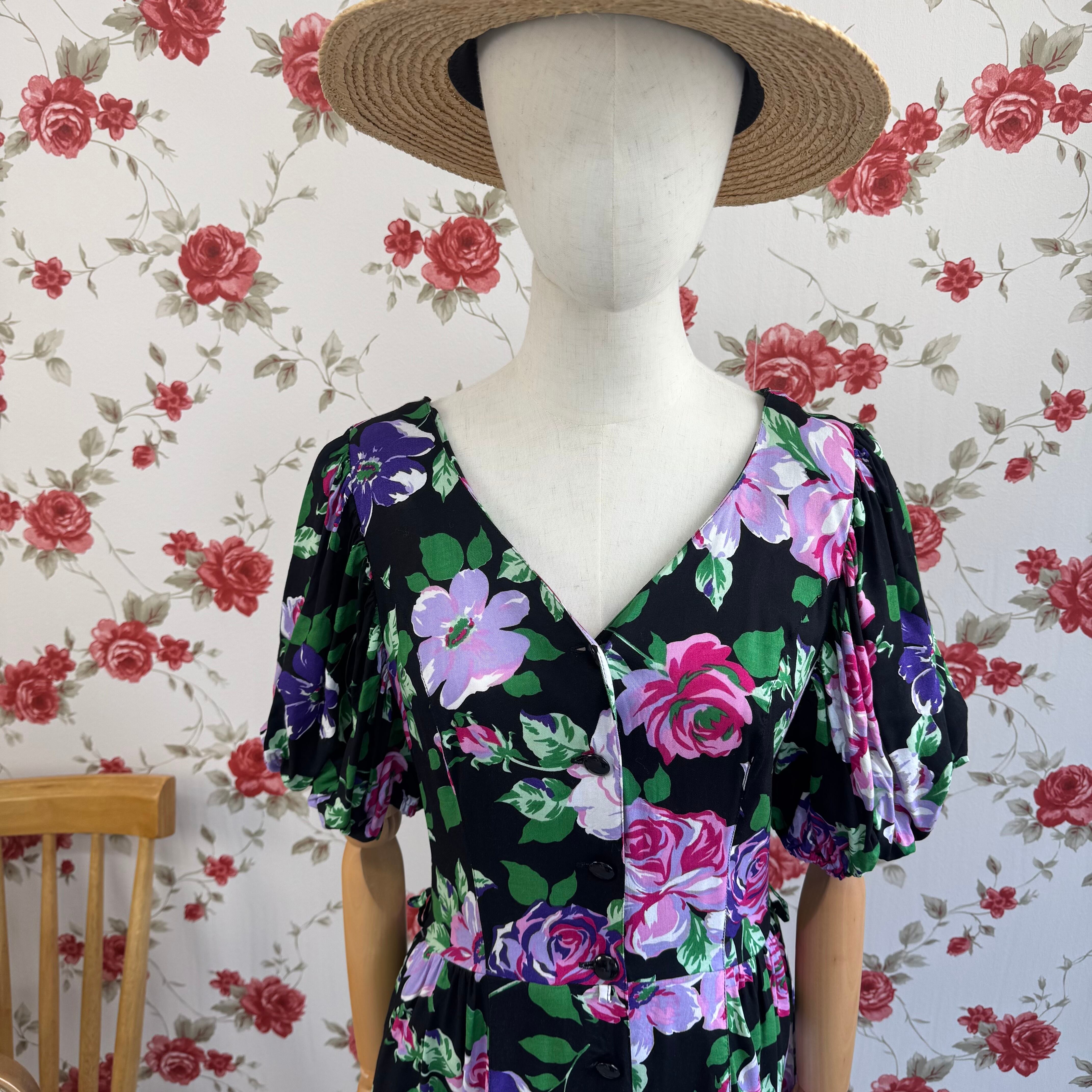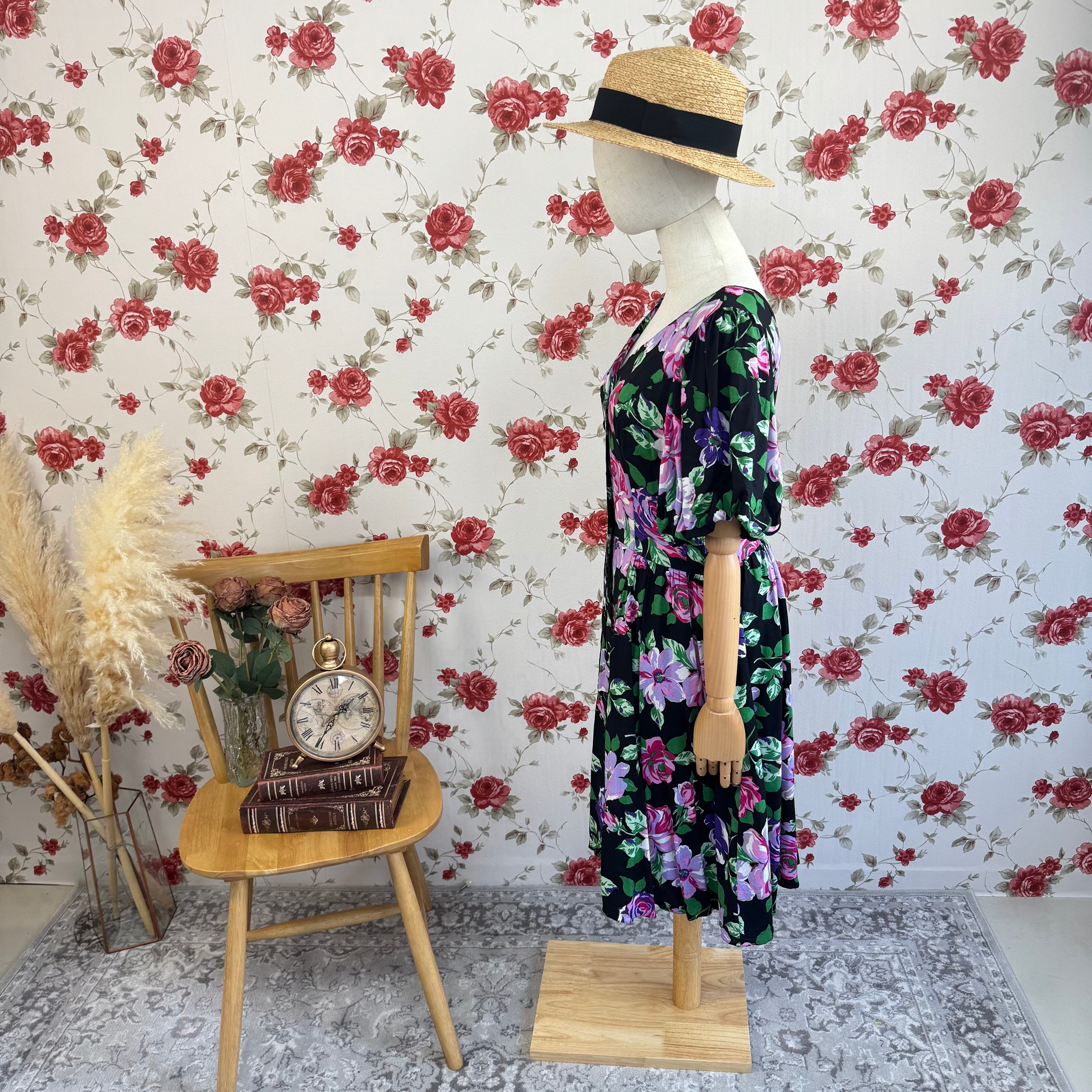 黒地に鮮やかなパープルやピンクのフラワープリントが映える華やかなヴィンテージワンピース。