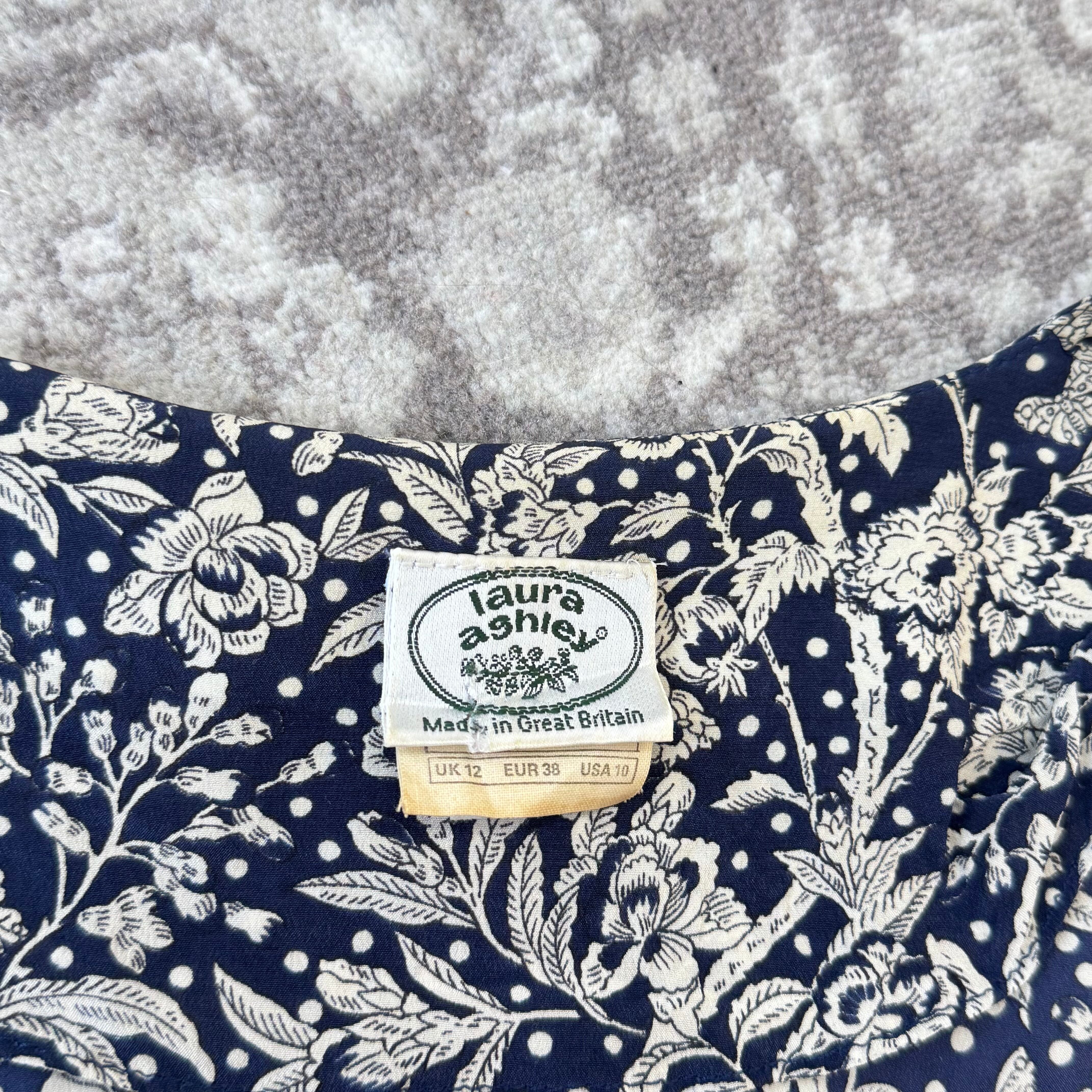 上品なネイビー地にアイボリーのボタニカル柄とドットを散りばめた、クラシカルな印象のLaura Ashley(ローラアシュレイ)イギリス製ヴィンテージドレス。