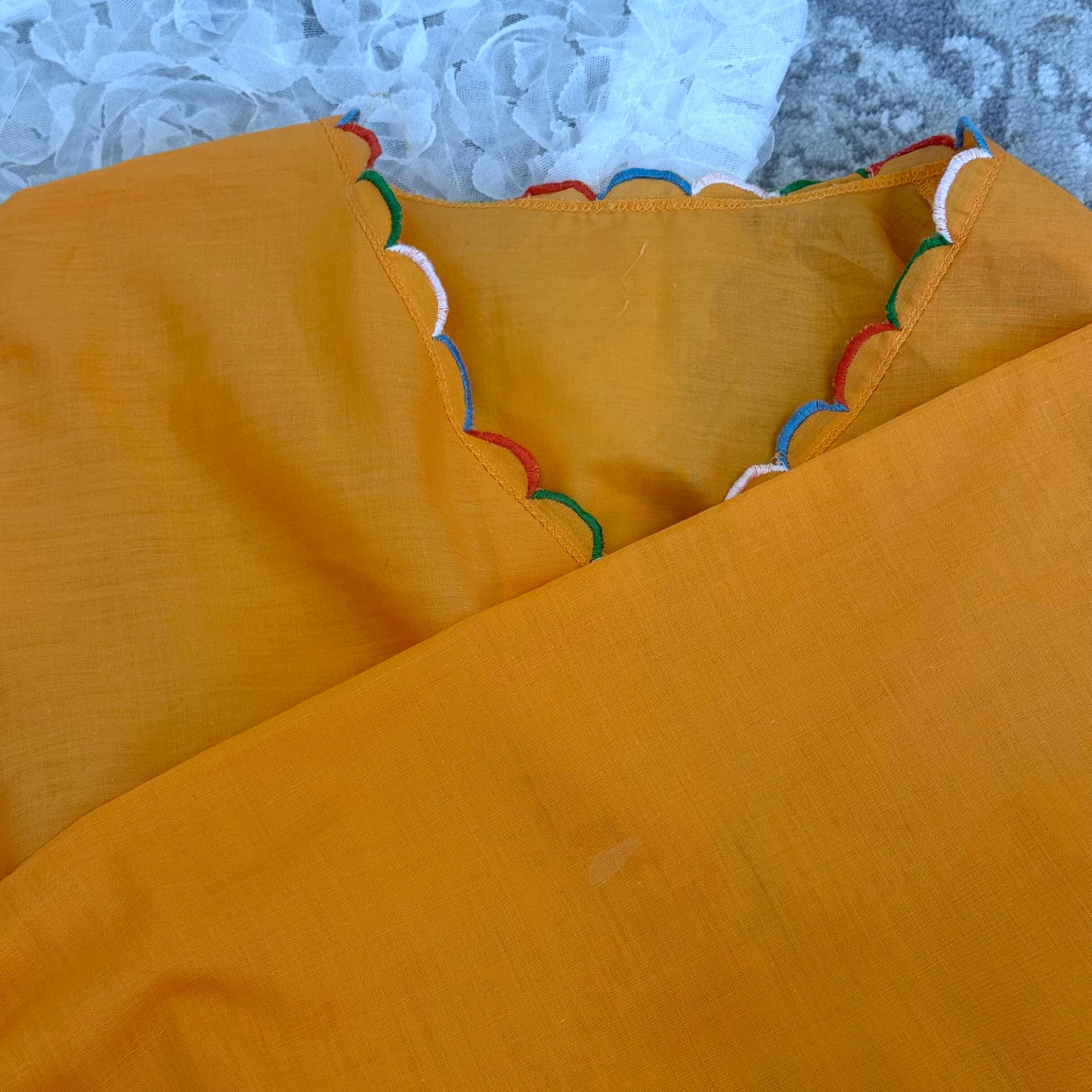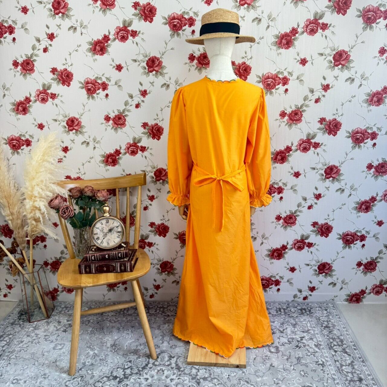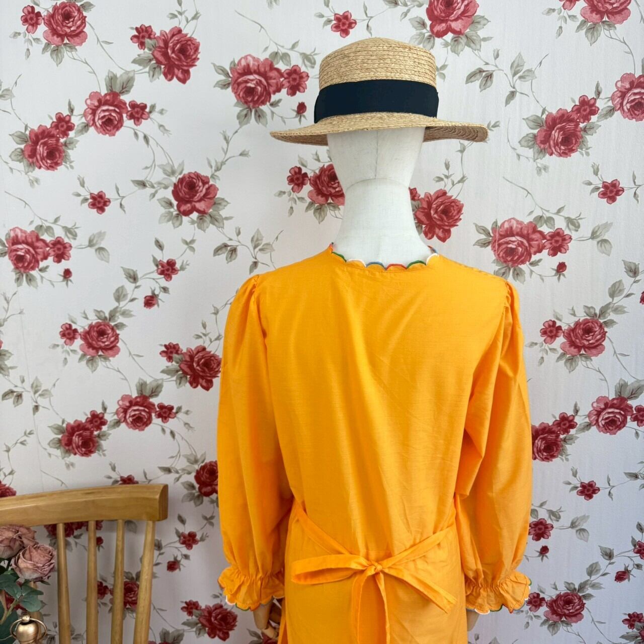 鮮やかなビタミンオレンジに、70年代らしいカラフルなお花の刺繍が映える一点物ワンピース。