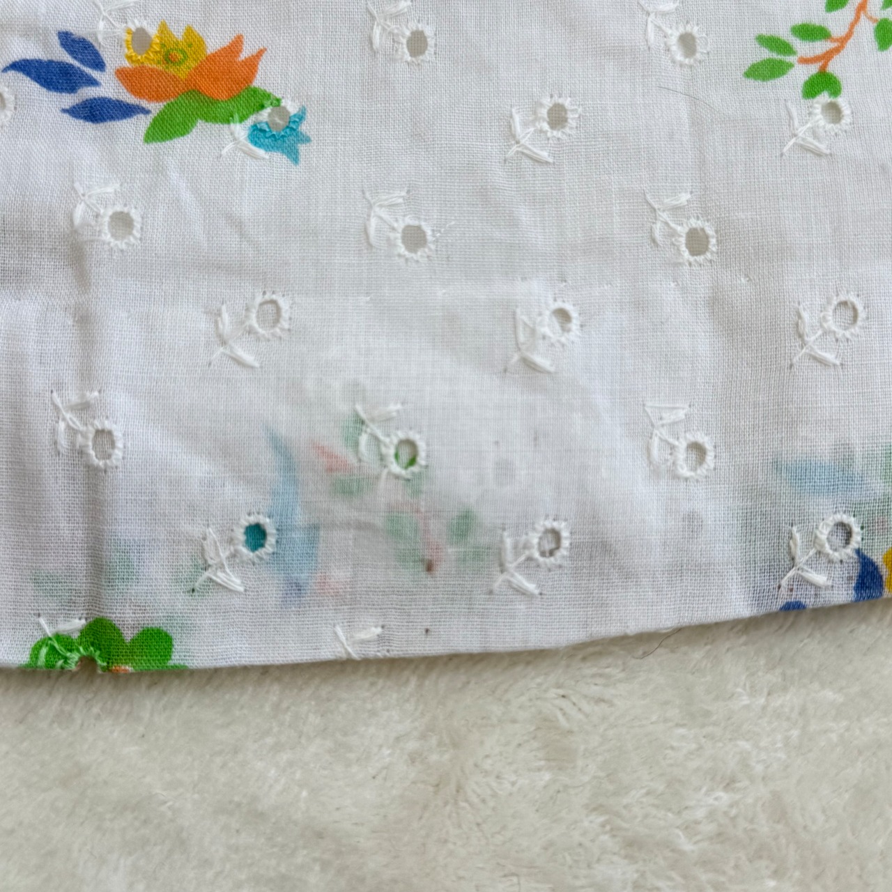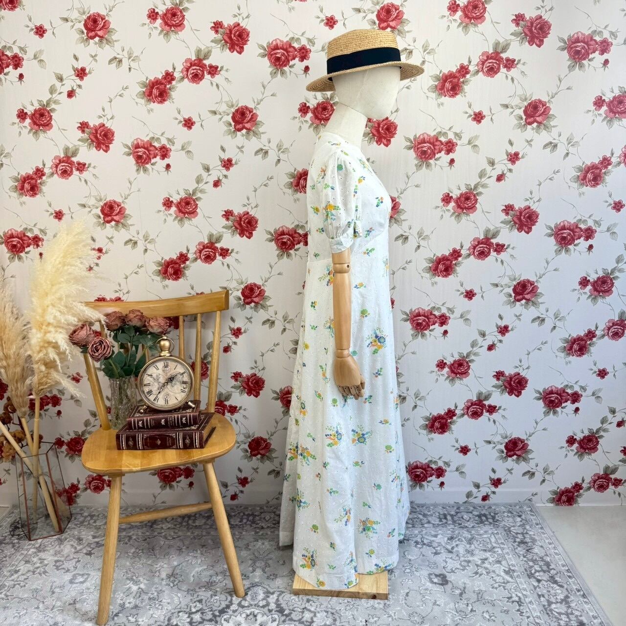 ホワイトのアイレット刺繍生地に、レトロな花柄を合わせた爽やかで可憐な雰囲気のヴィンテージワンピース。