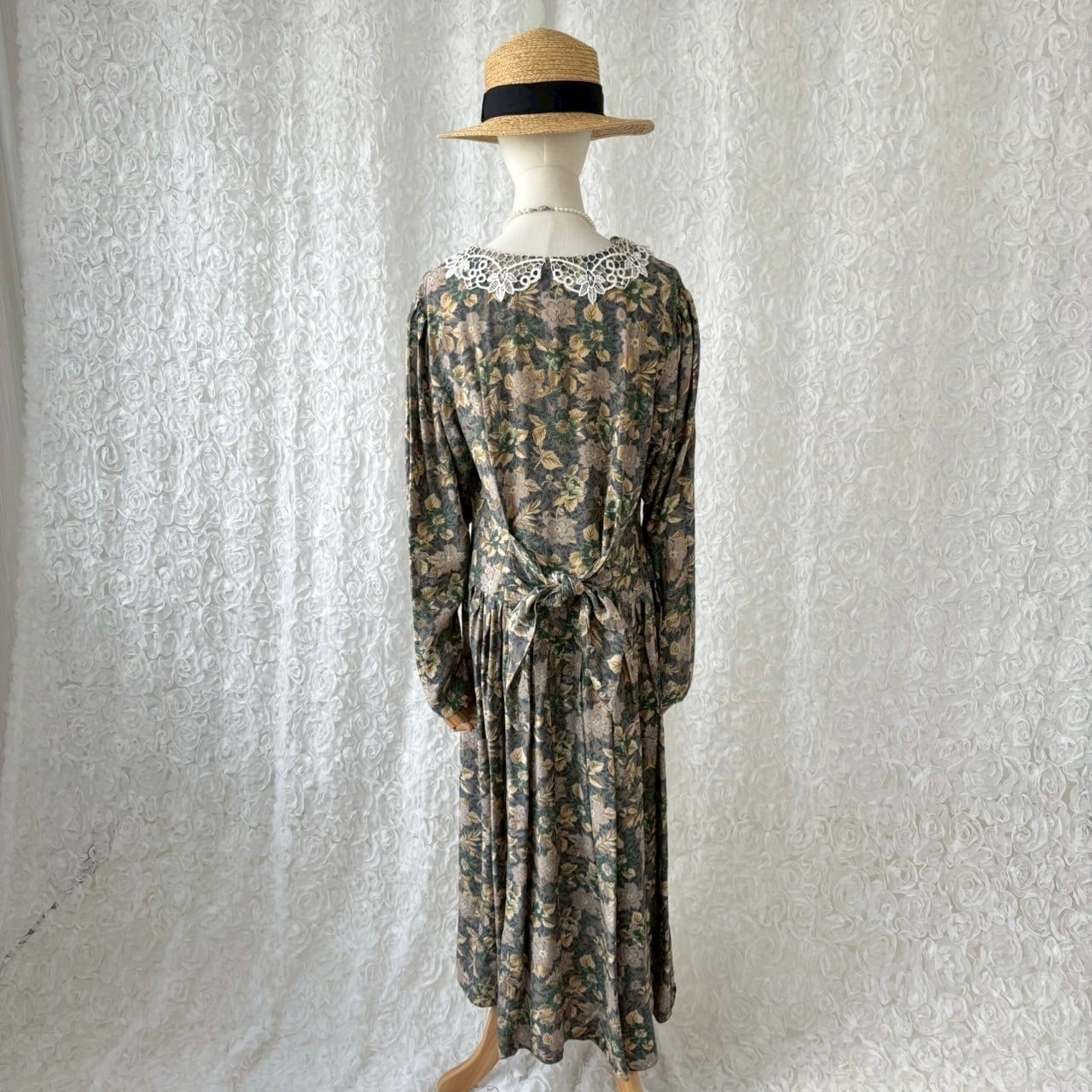 ヨーロッパ製 レース襟 フラワープリント ワンピース ヴィンテージ 長袖 レトロ ニュアンスカラー 花柄 総柄 100%レーヨン