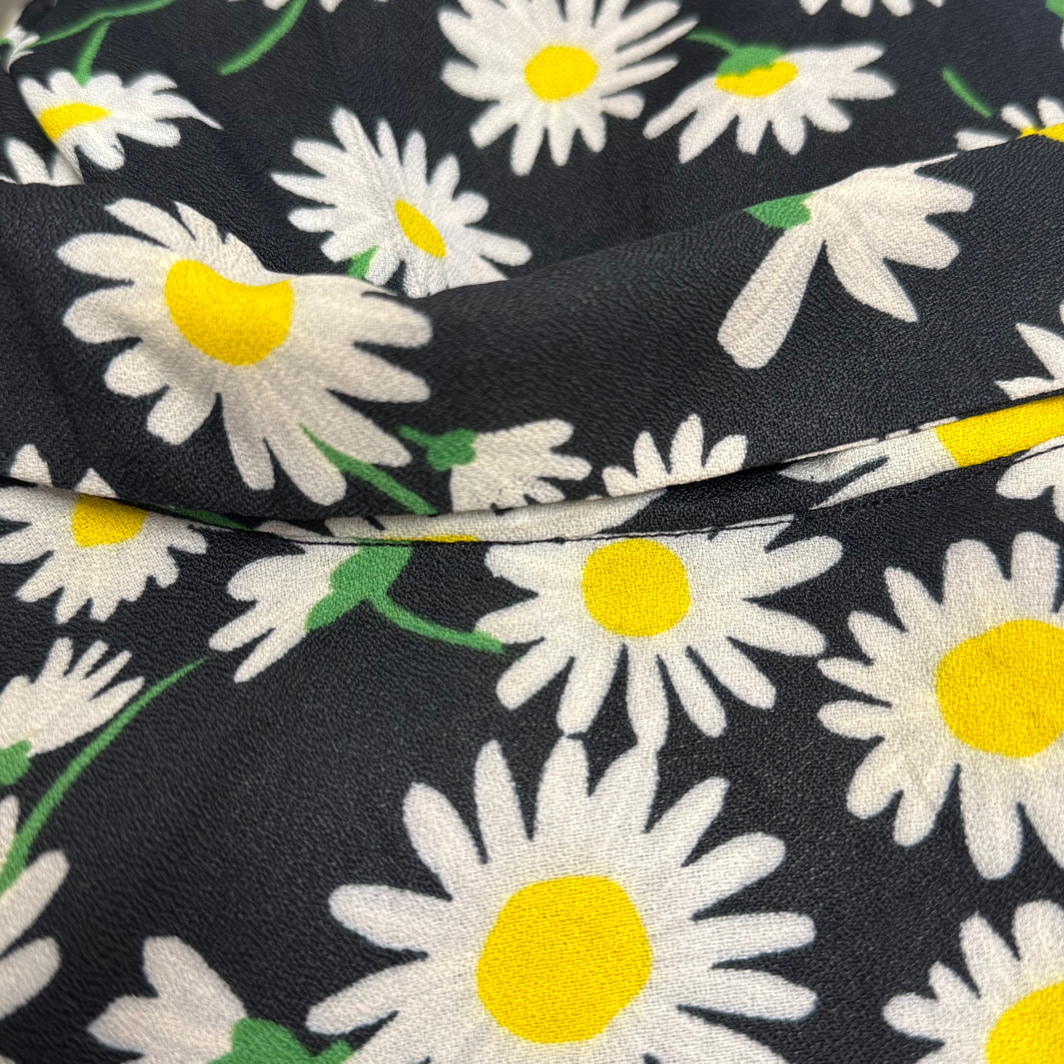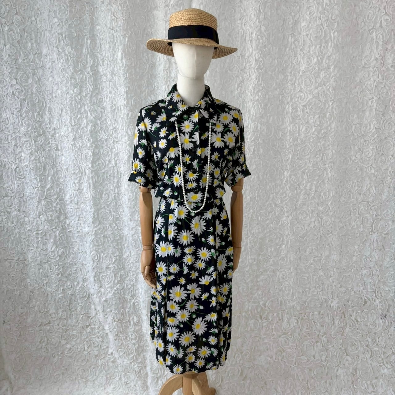 SAINT LAURENT rive gaucheらしいモード感のあるブラックベースに、マーガレット柄が映えるヴィンテージワンピース。