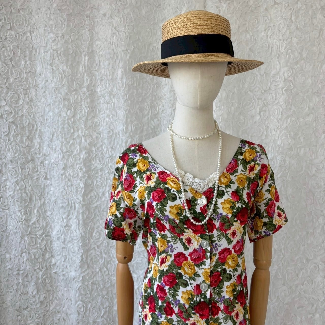赤×イエローの華やかなフラワープリントが印象的な、ヴィンテージムード漂うロングワンピース。