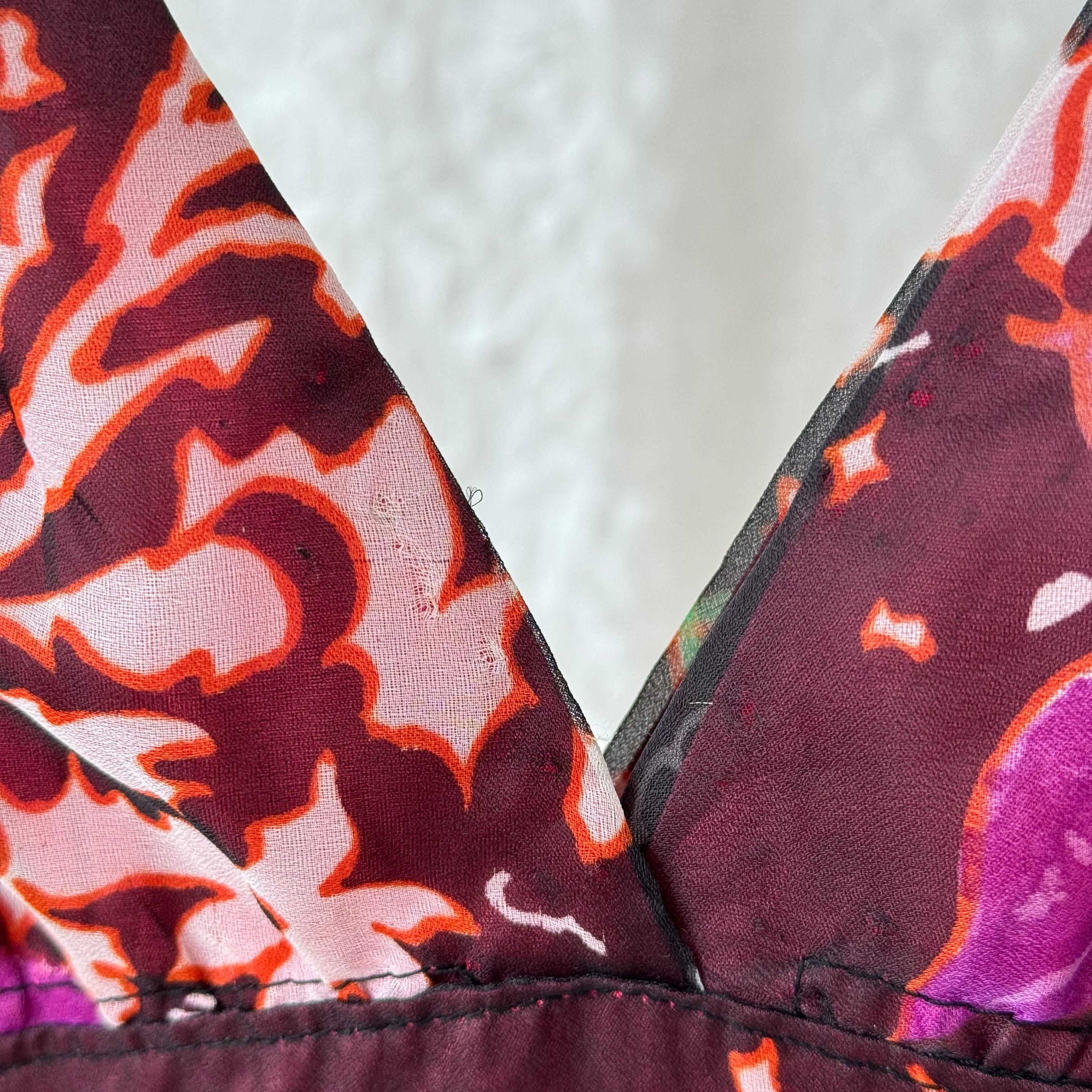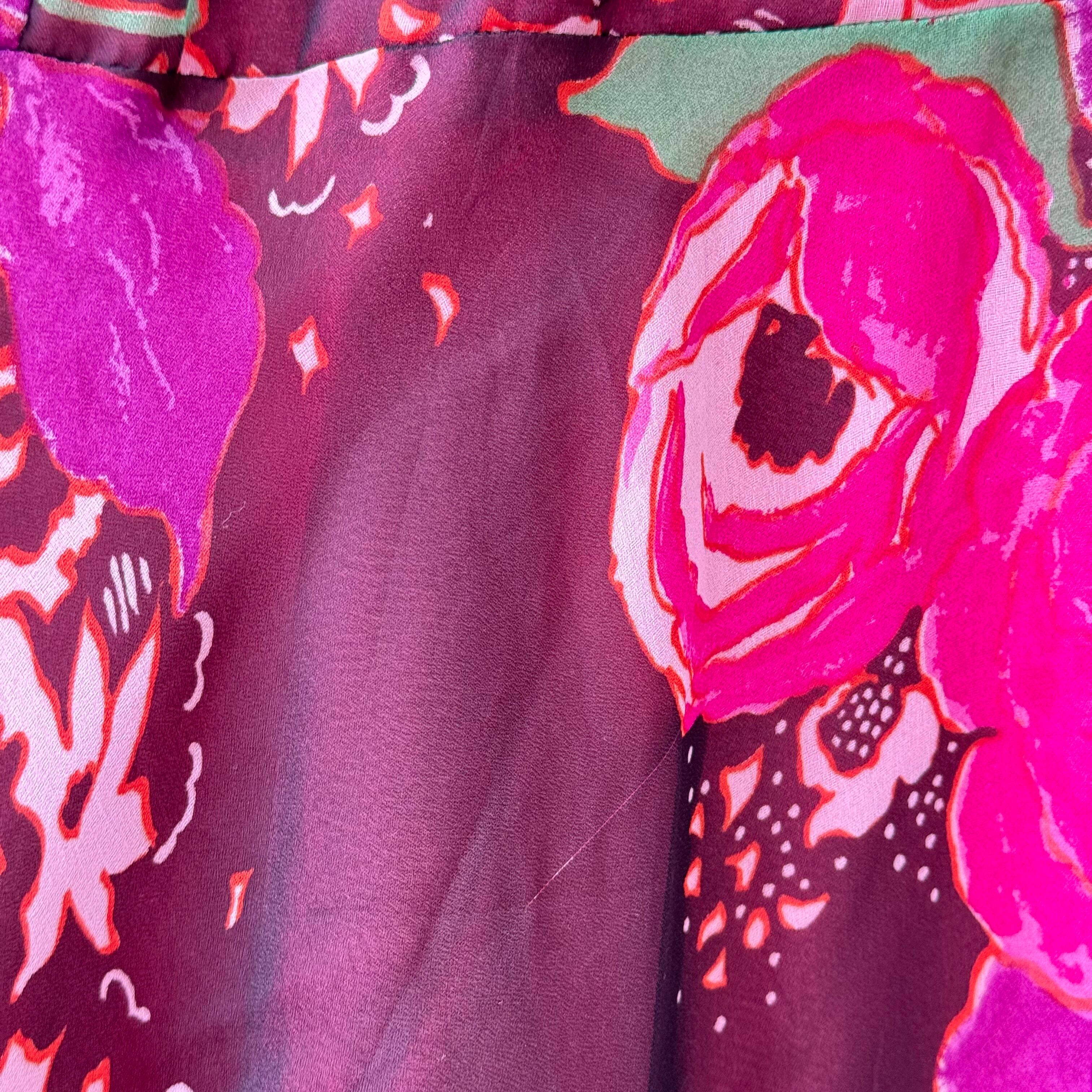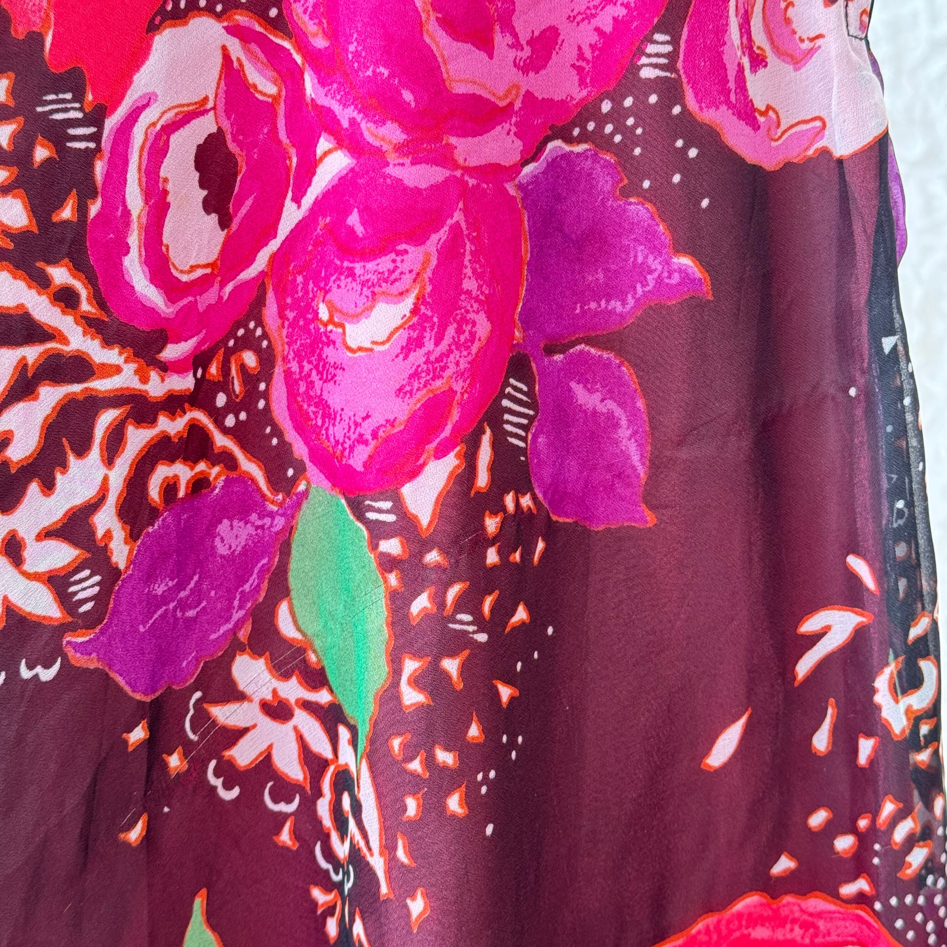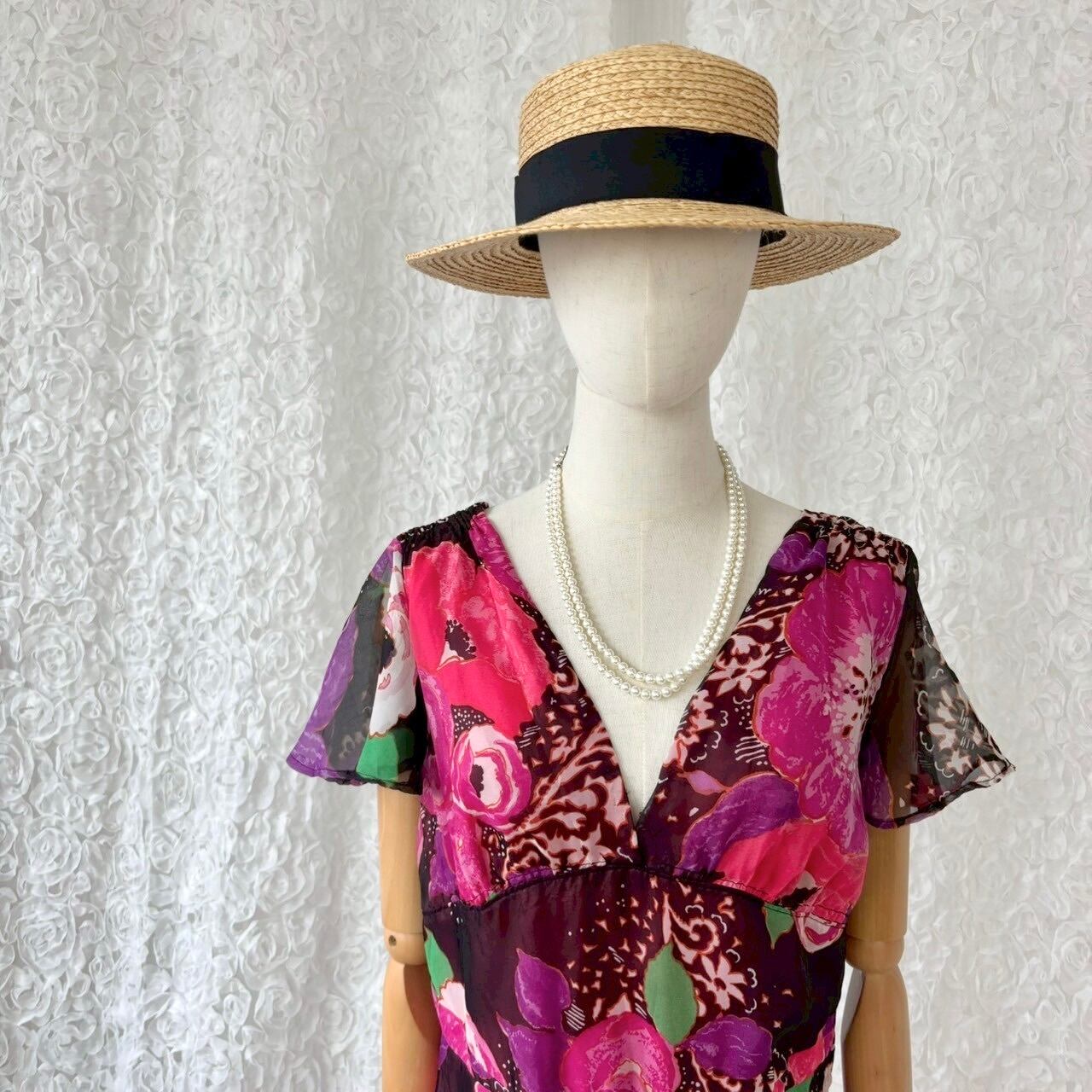 深みのあるボルドー×ピンクの花柄が印象的な、シフォン素材のロングワンピース。