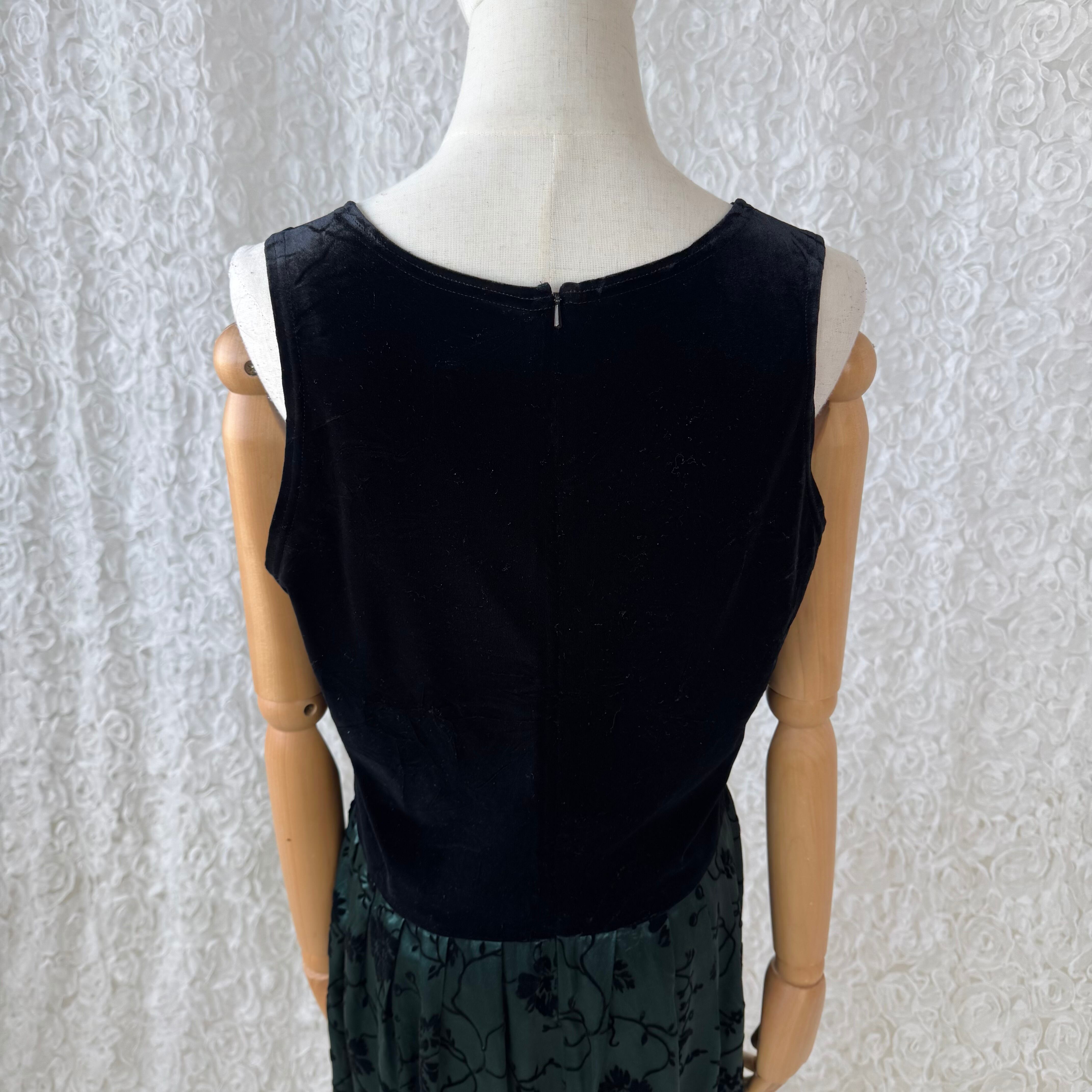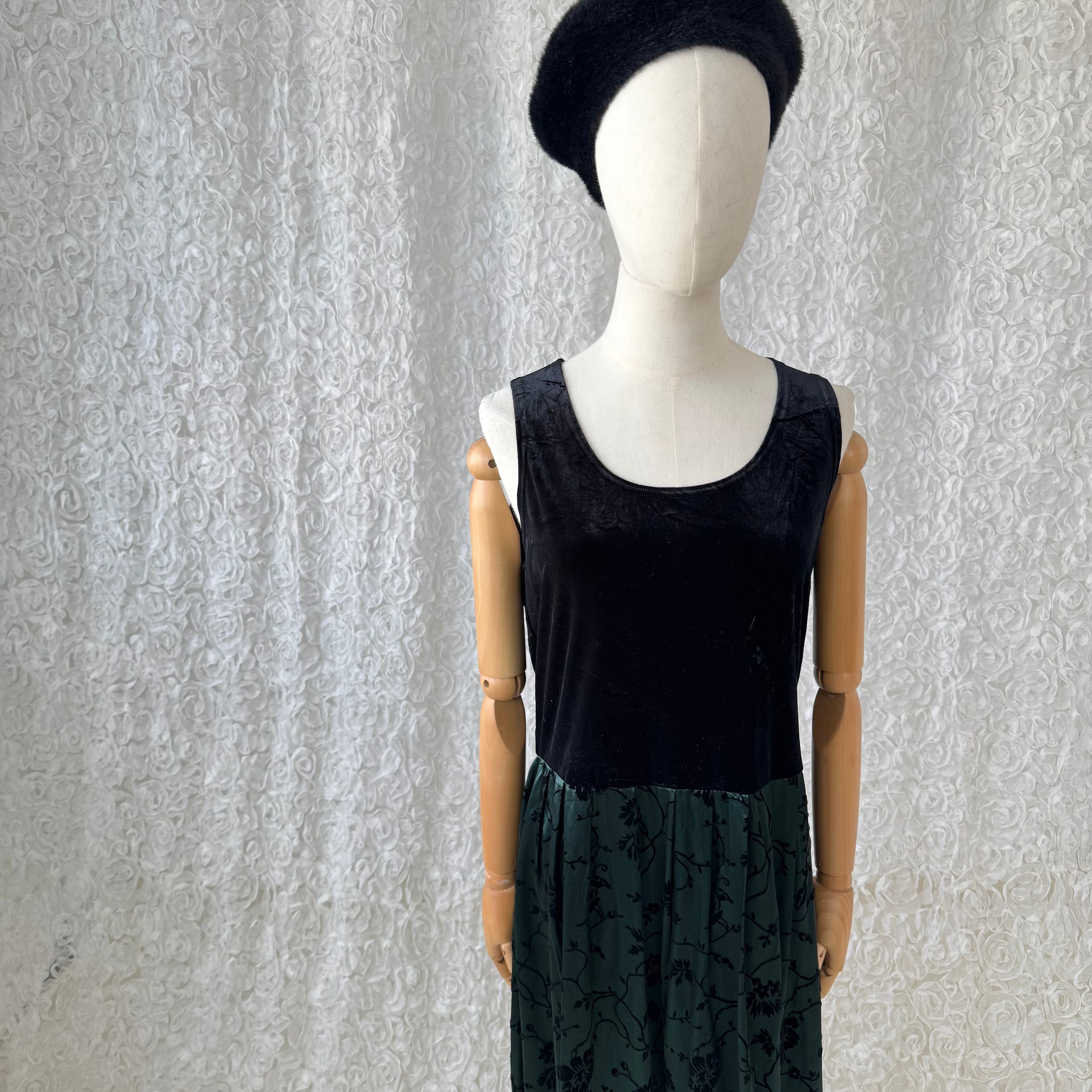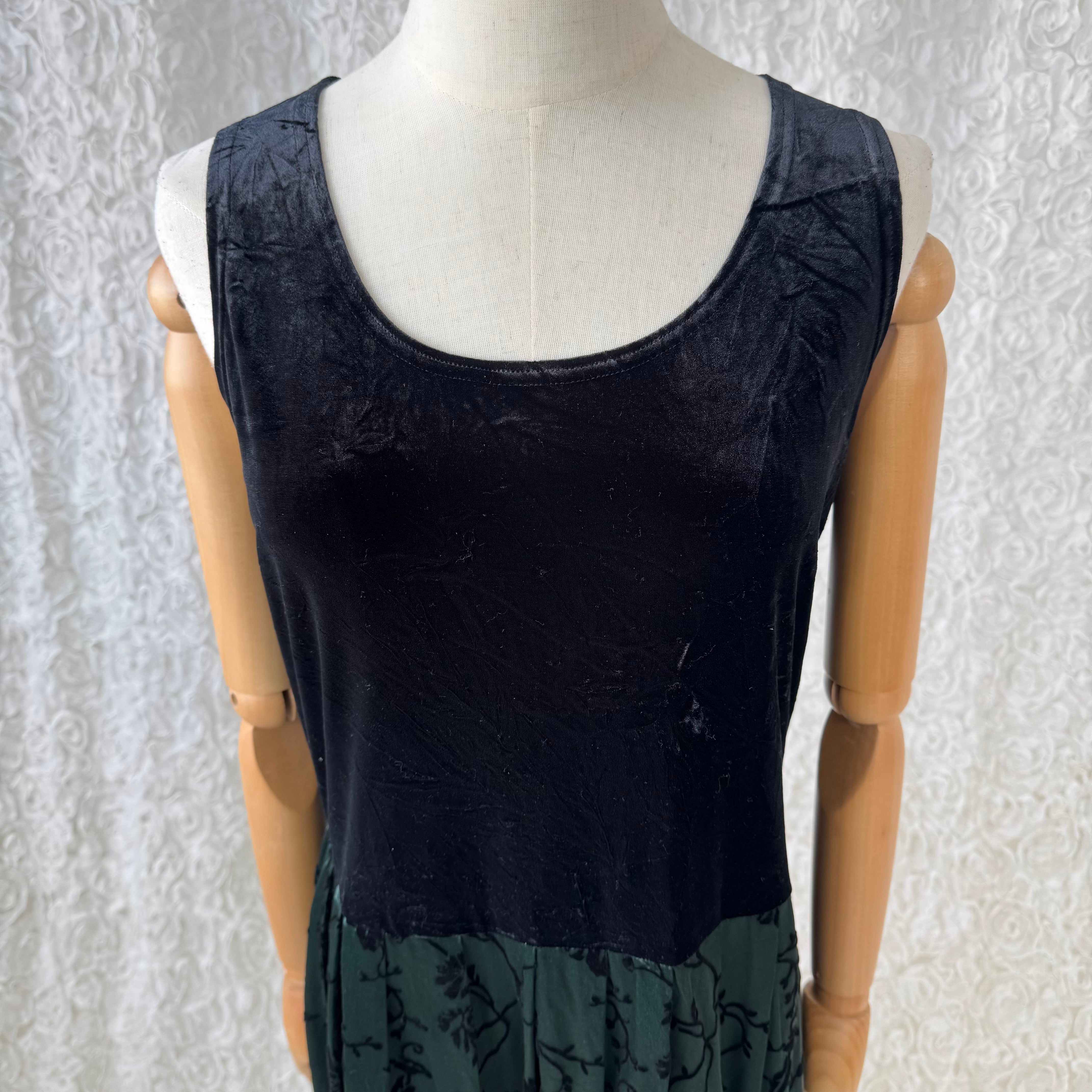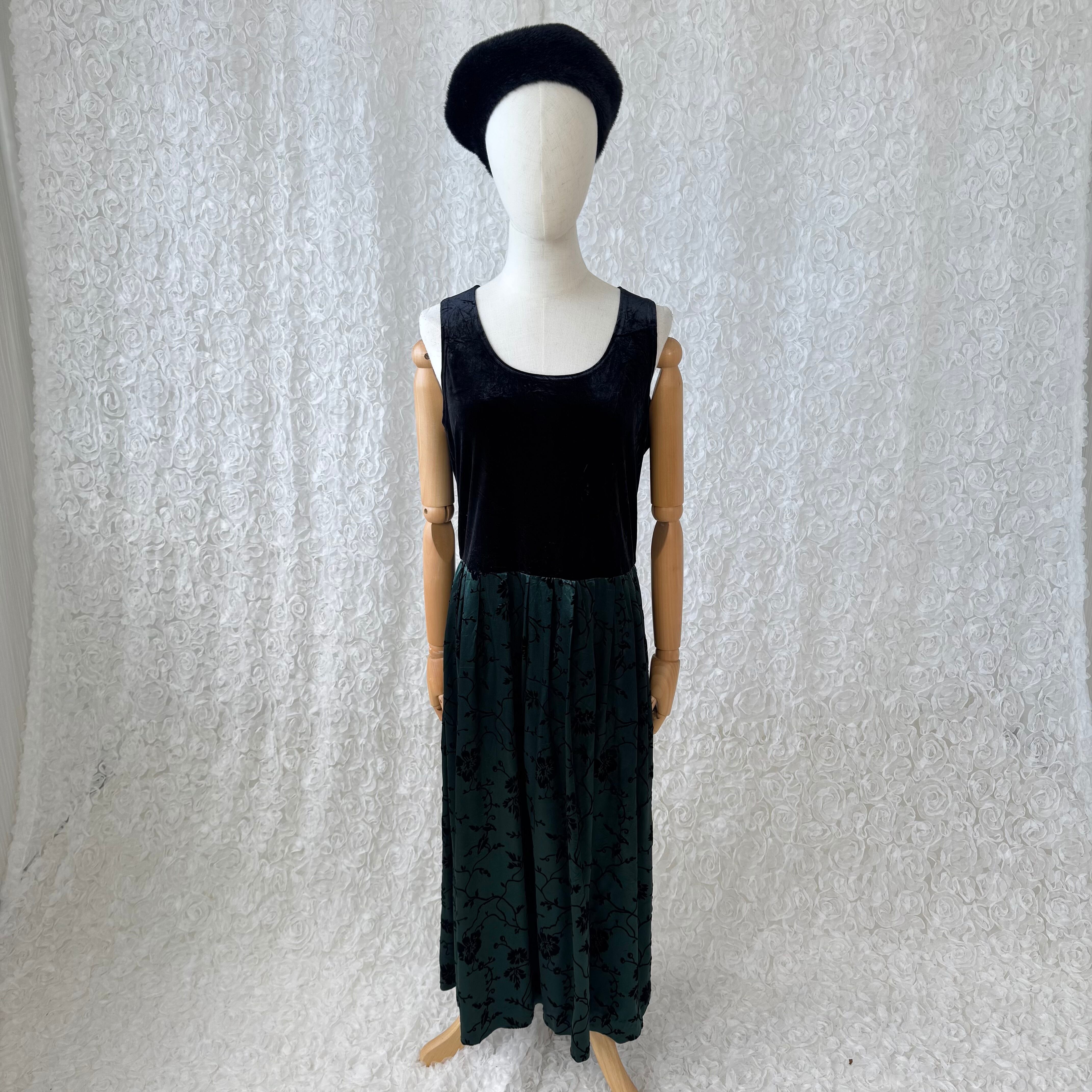 Karin Stevens 切替デザイン ベルベットxフロッキープリント ロングワンピース ブラック×グリーン USAヴィンテージ