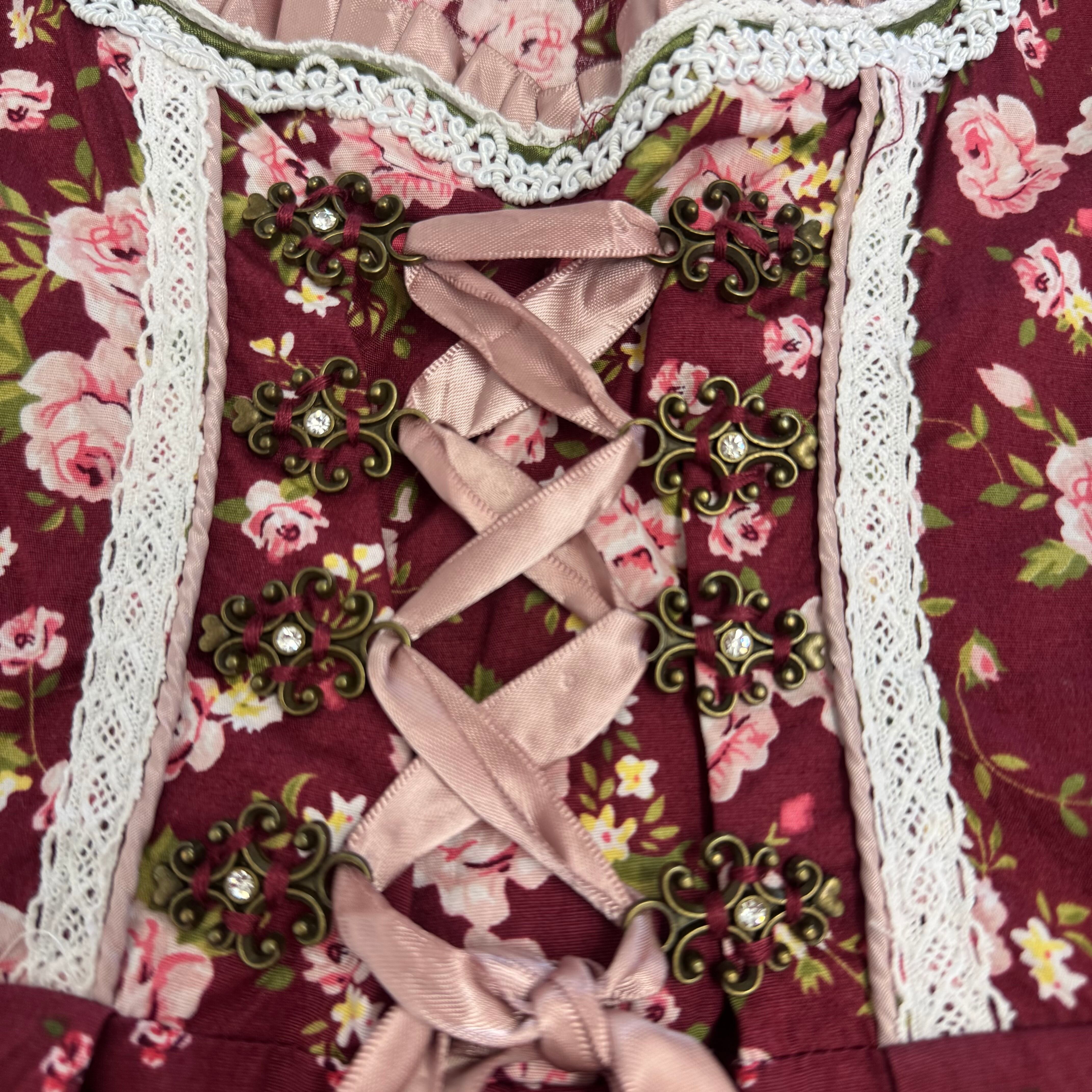 花柄プリントにレーストリム、フロントの編み上げリボンが目を惹くチロリアン風デザインのワンピース。