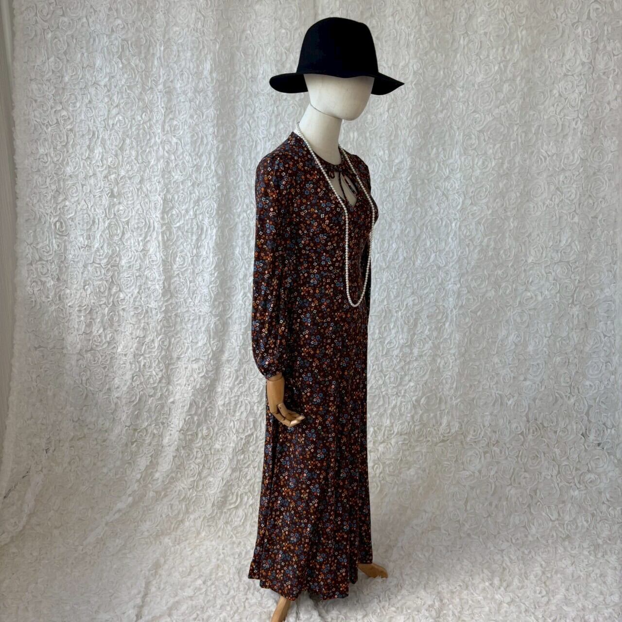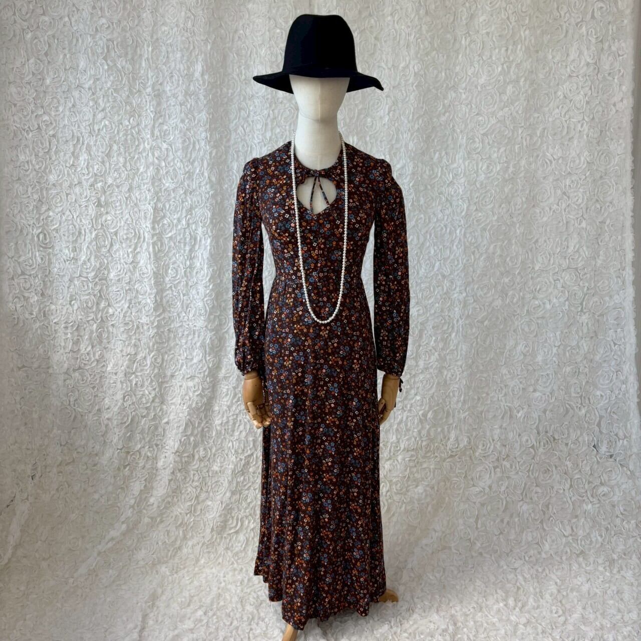 USA古着 小花柄 ロングワンピース ティアドロップカット ブラウン系|70s風 レトロ 花柄 バックファスナー ヴィンテージワンピース