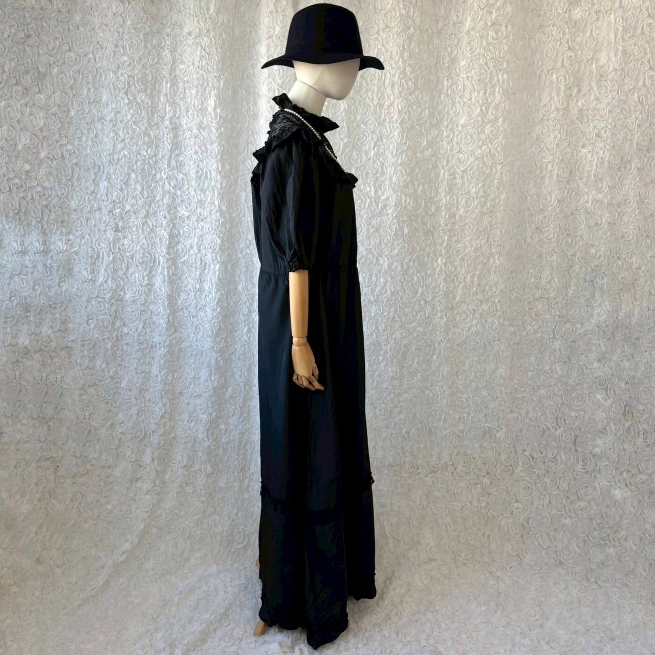 ヨーロッパ古着 C&A ブラック レース切替 ロングワンピース|ヴィンテージ フリル パフスリーブ ゴシック クラシカル