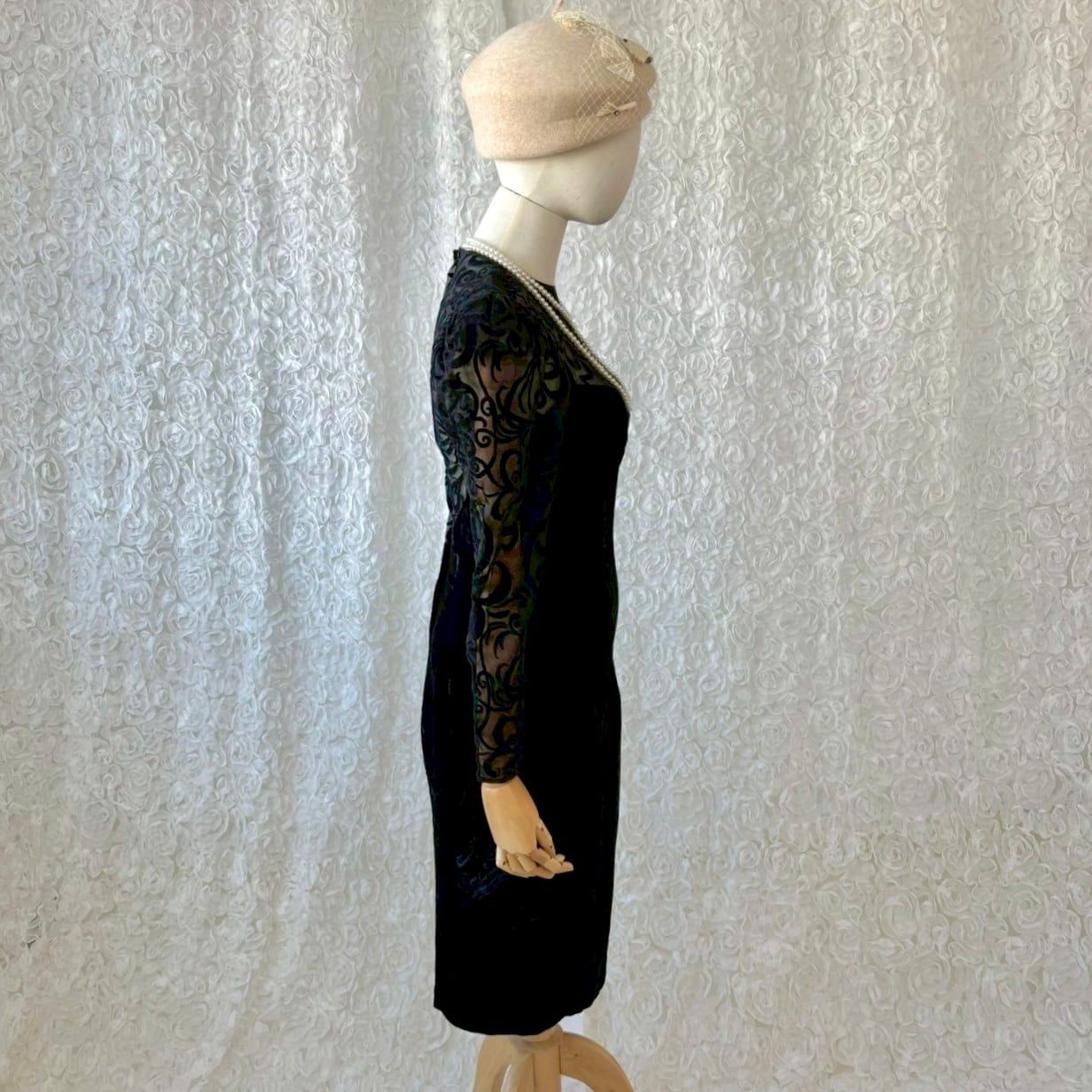 シアー感のある総レースに、立体的なフロッキー模様が美しいブラックベルベットドレス。