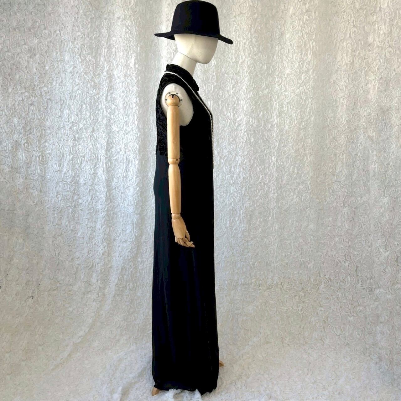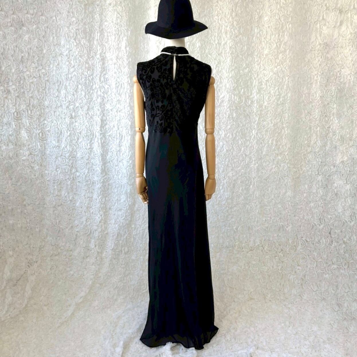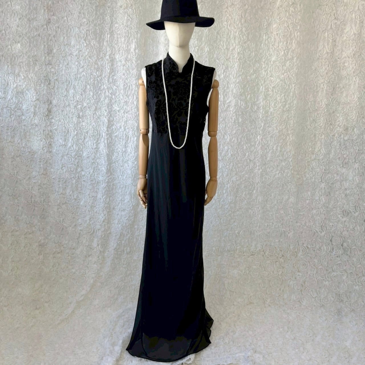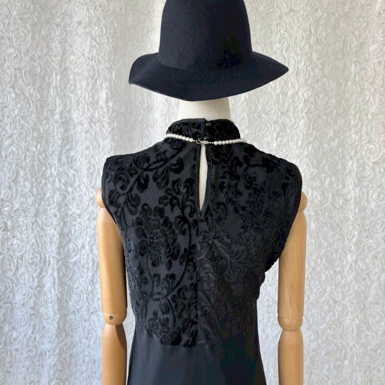 ヴィンテージ AIGO フロッキーベロア チャイナ風 ノースリーブロングドレス ブラックドレス