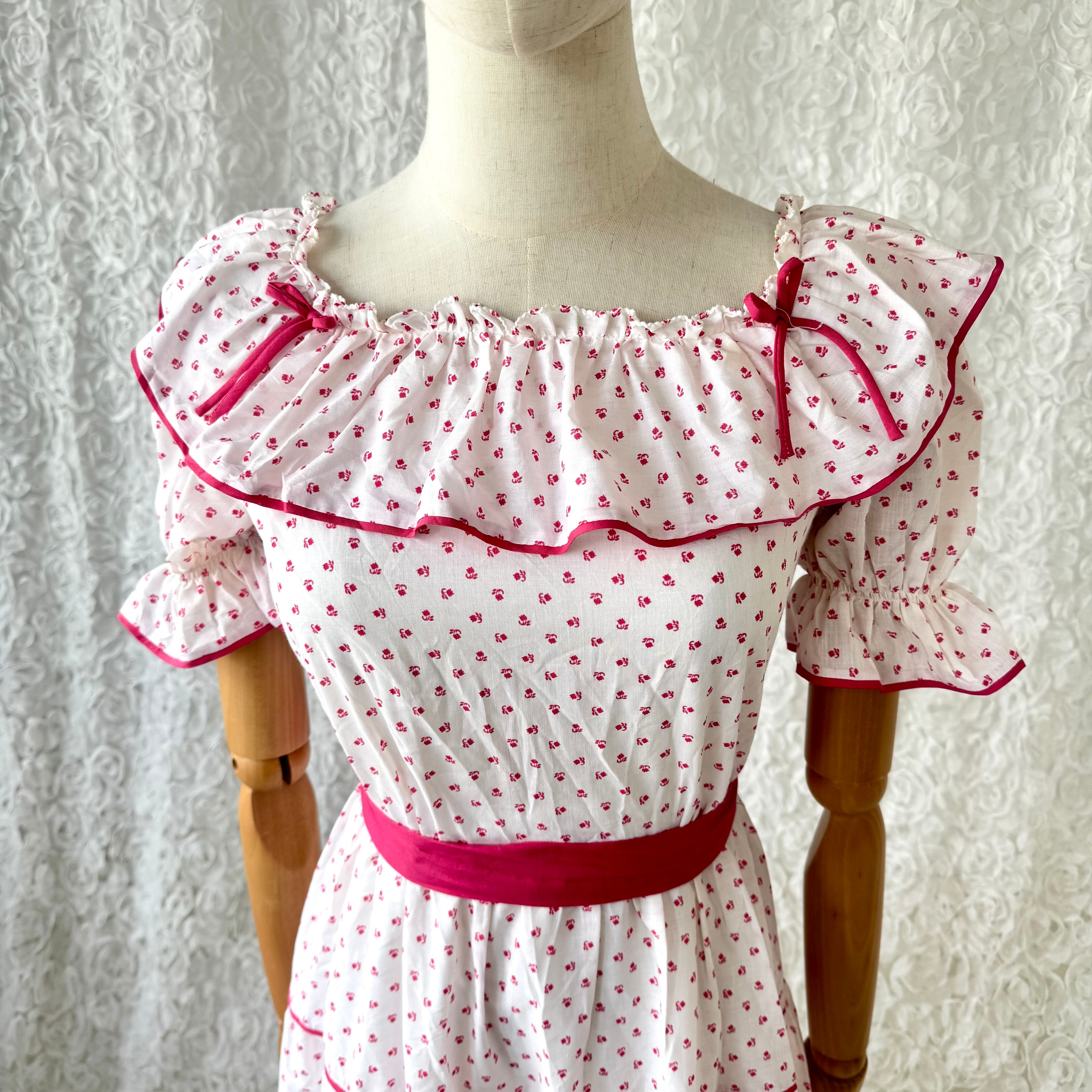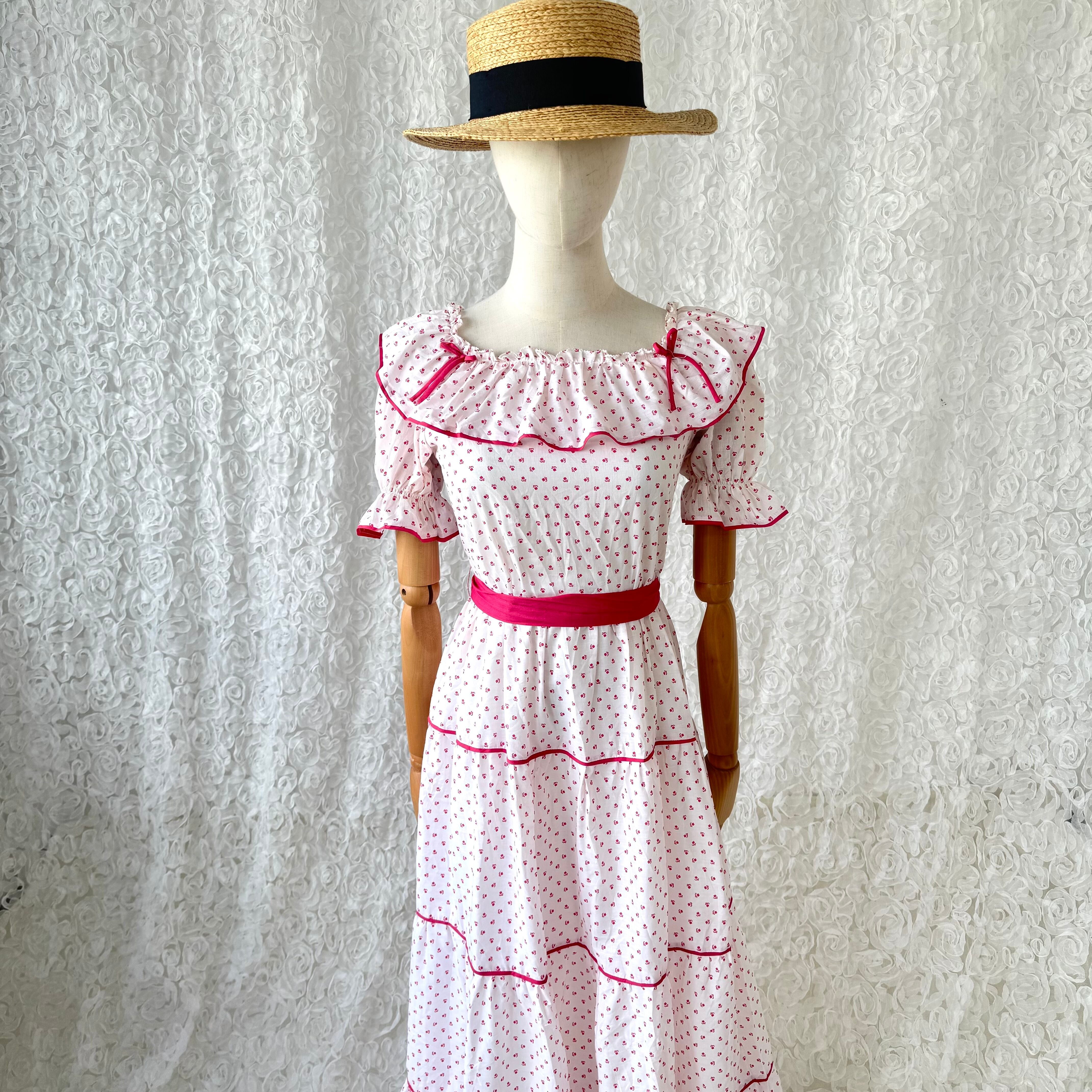 ヨーロッパ古着 80s 90s 小花柄 フリル ロングワンピース オフショルダー風 パフスリーブ ウエストリボン紐付き ユーロヴィンテージ