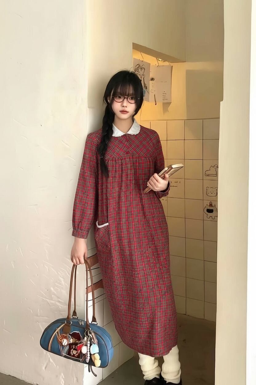 タータンチェック柄に白いレース襟を合わせたデザイン。