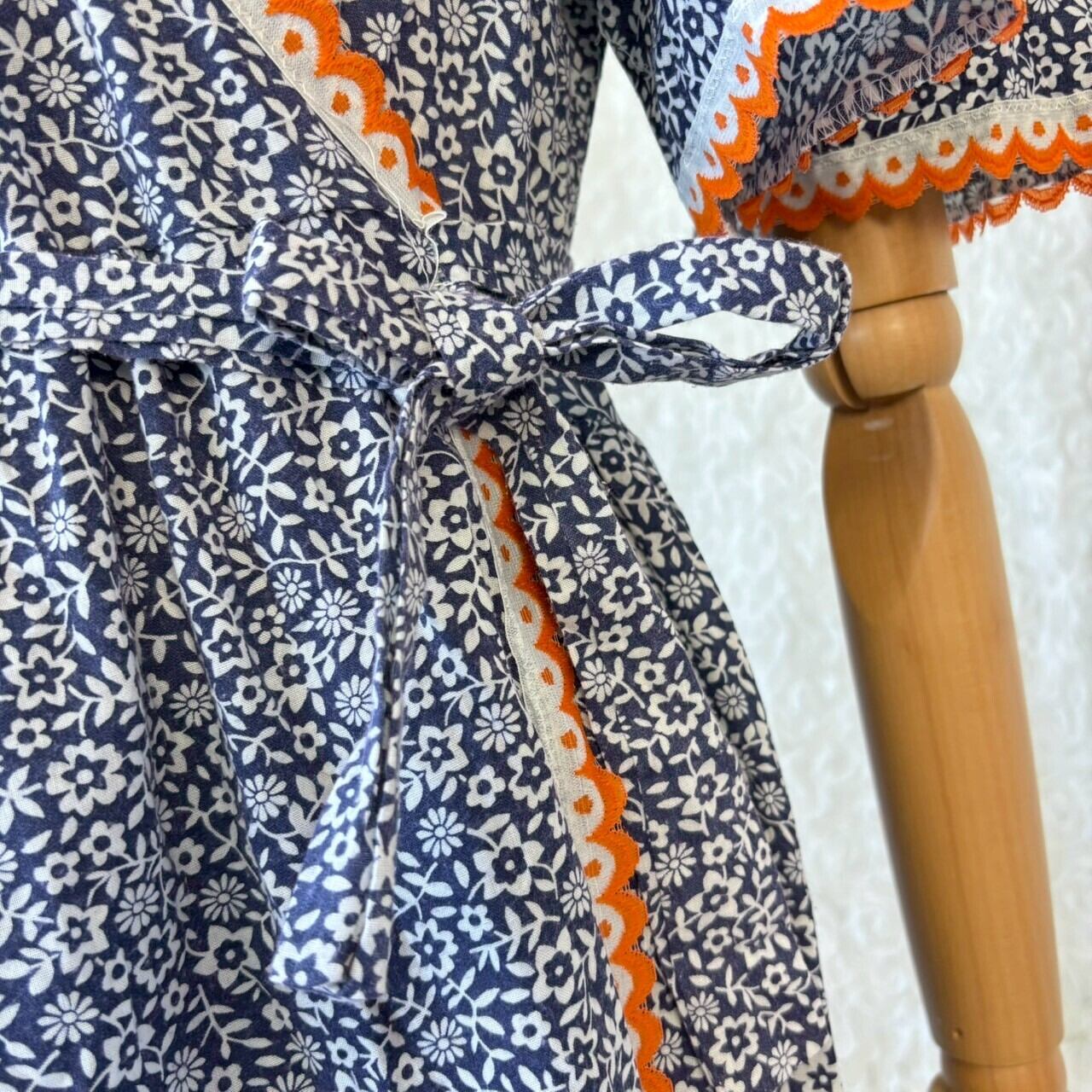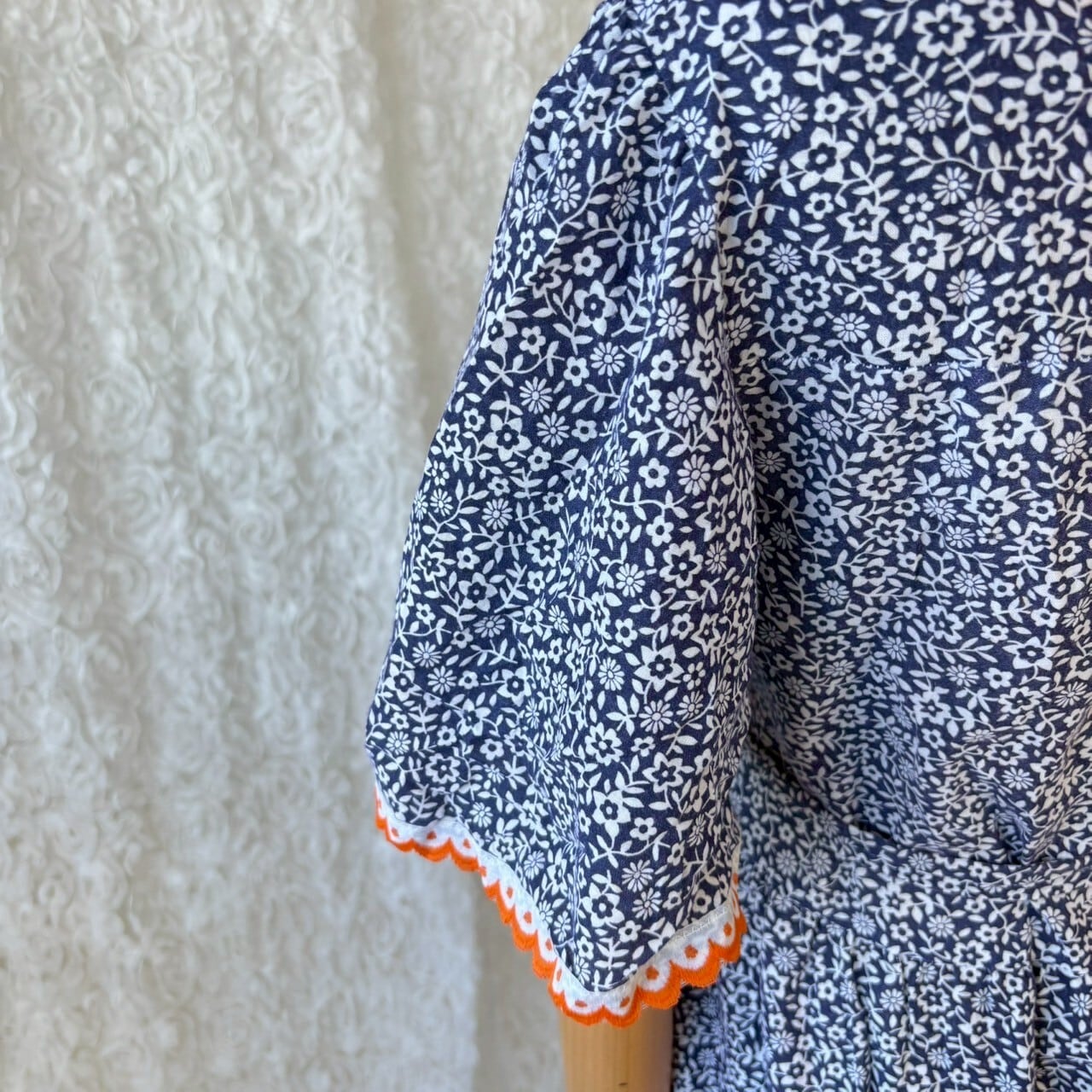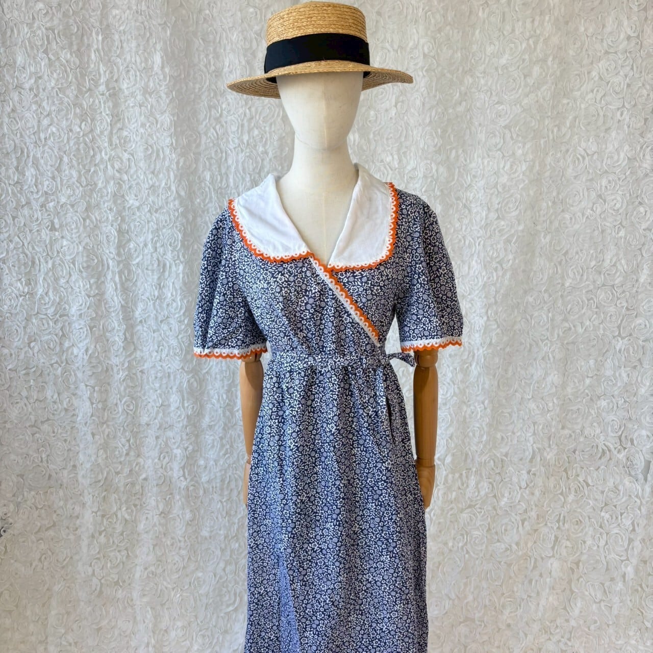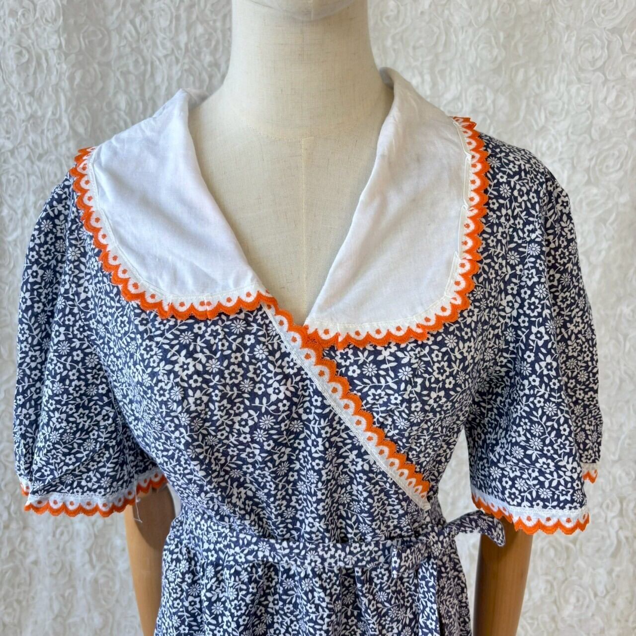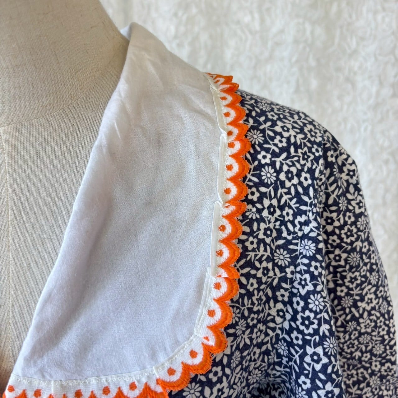 白い大きめ襟とオレンジのスカラップレースがアクセントになった、当時らしい遊び心のある一着です。