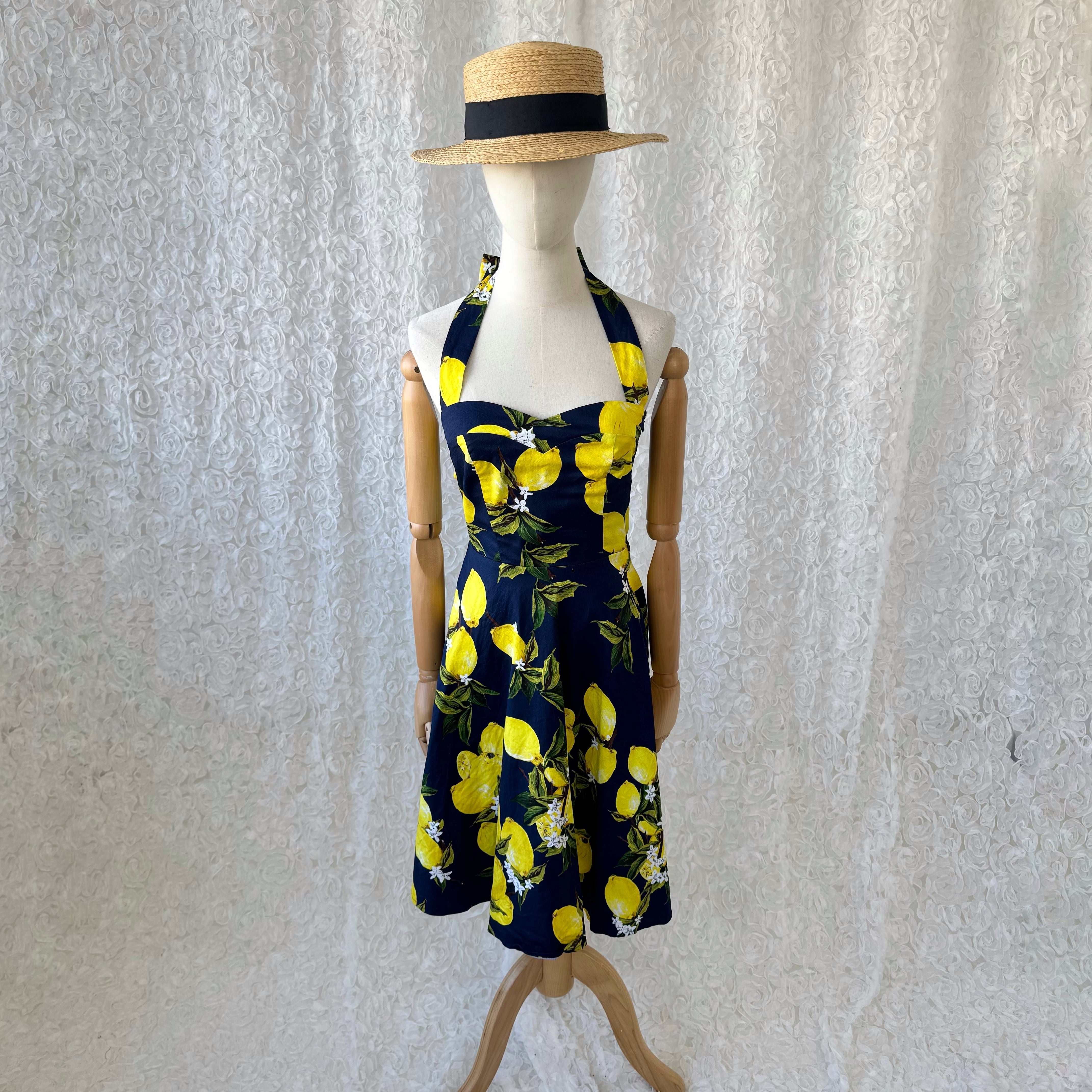 爽やかなレモンモチーフが目を惹く、夏らしいホルターネックワンピース。