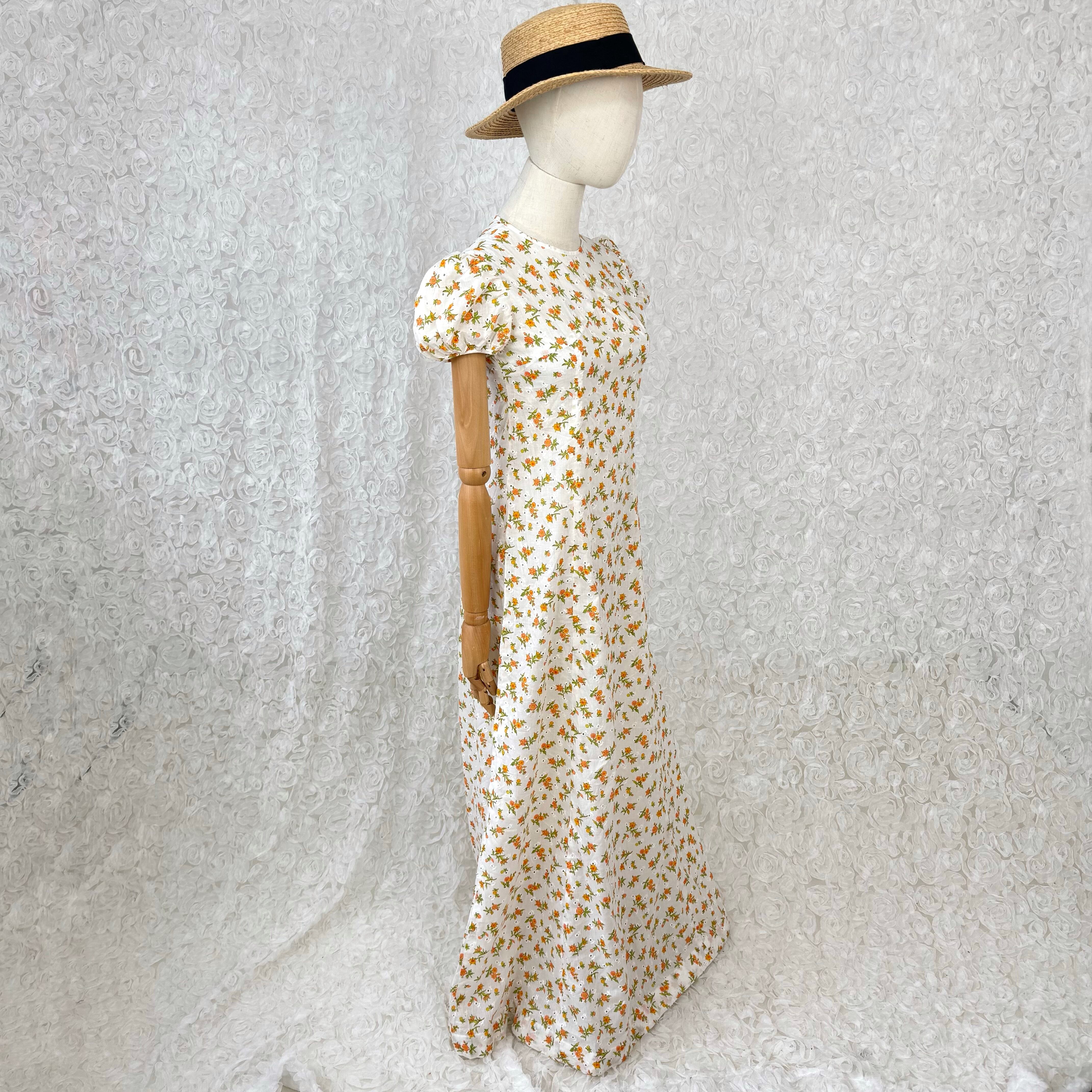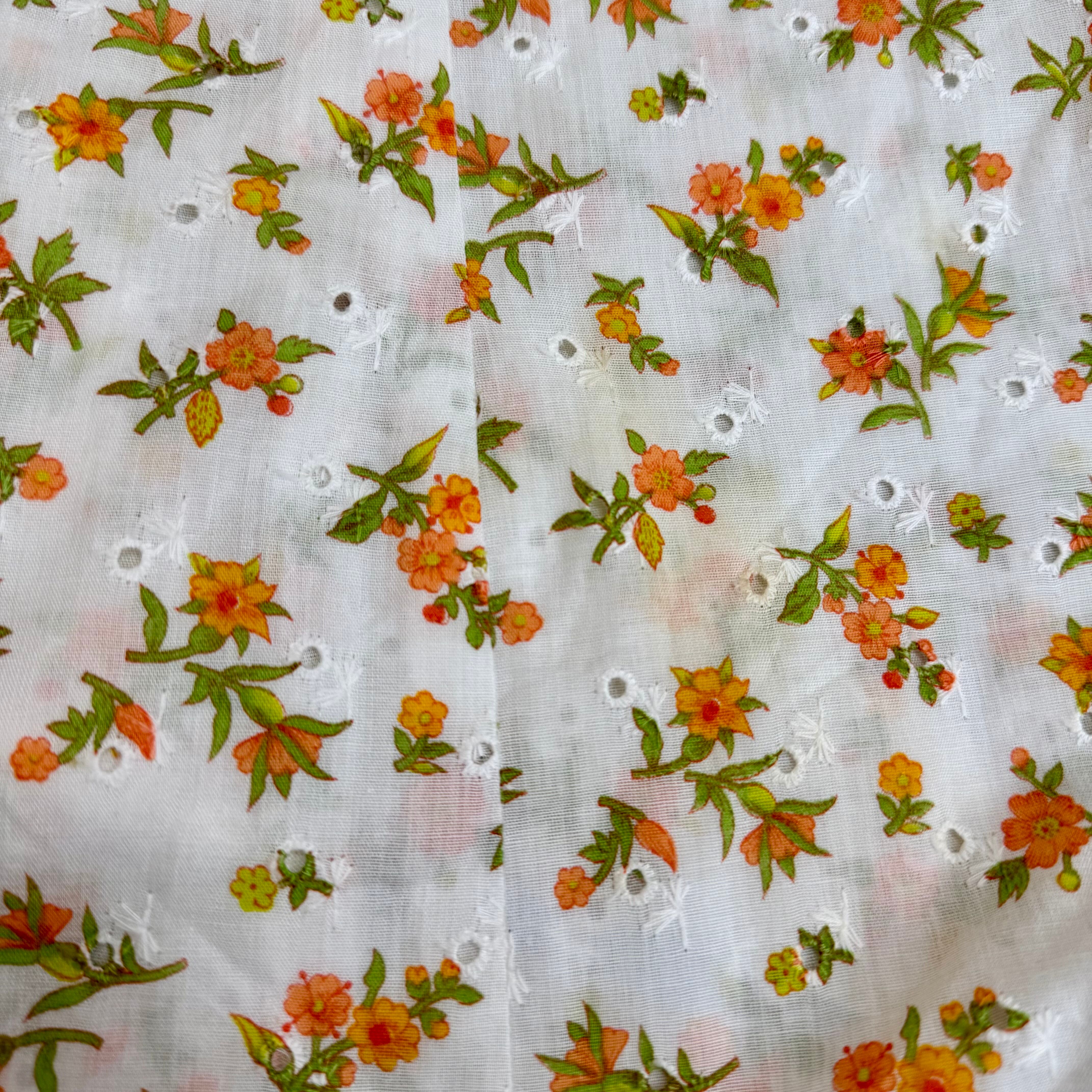 花柄カットワーク刺繍 コットンワンピース ホワイトxオレンジ 小花柄 パフスリーブ ロング丈 ヴィンテージ