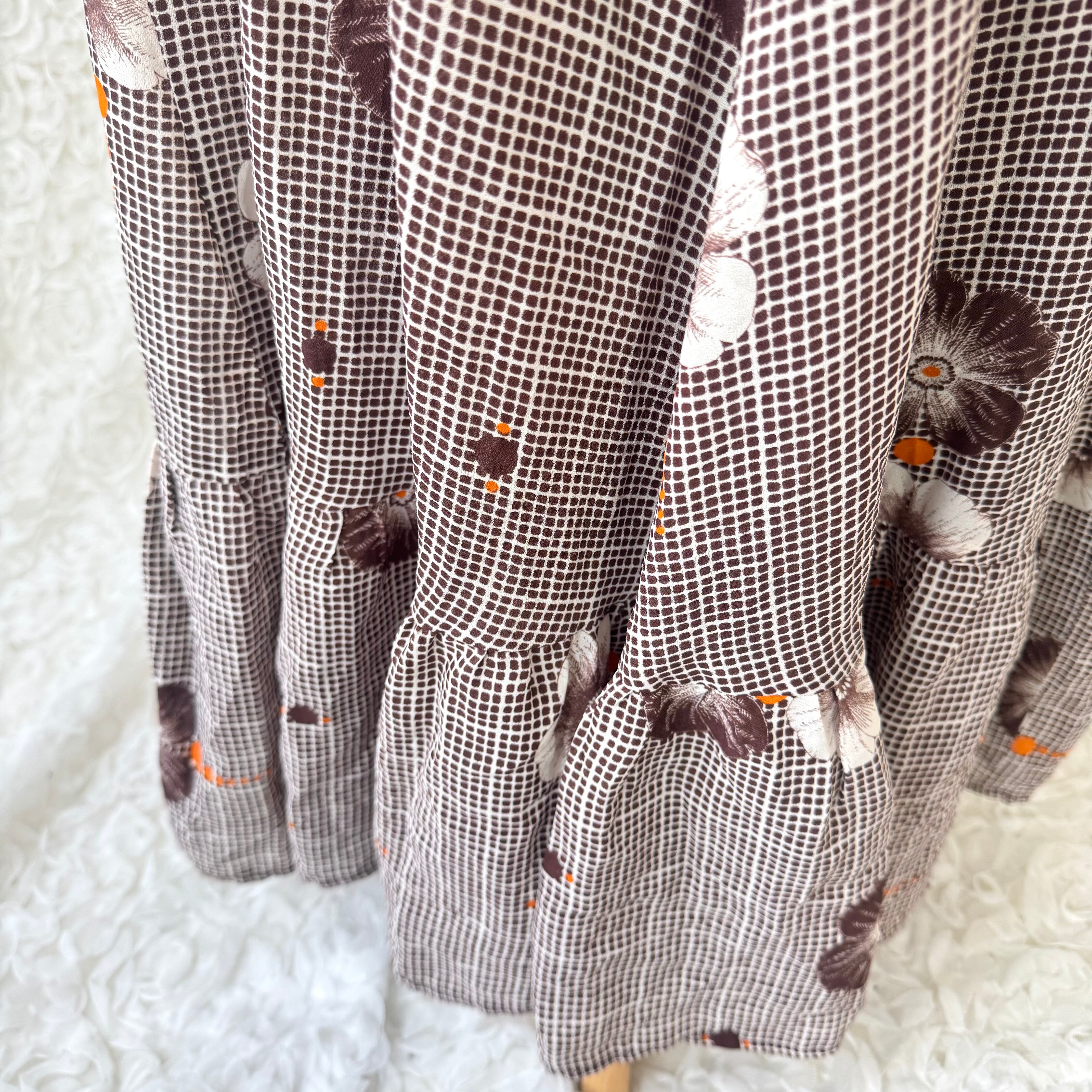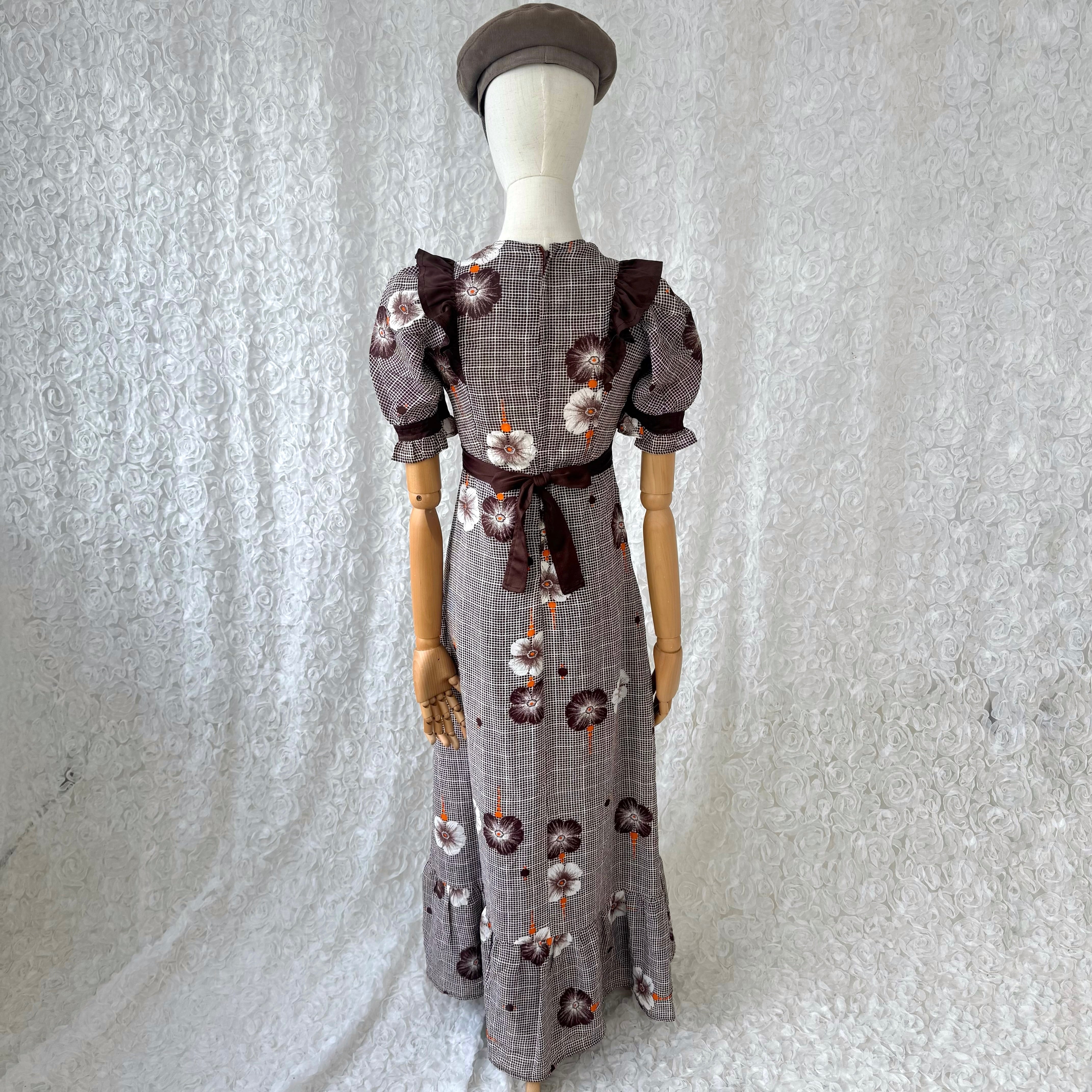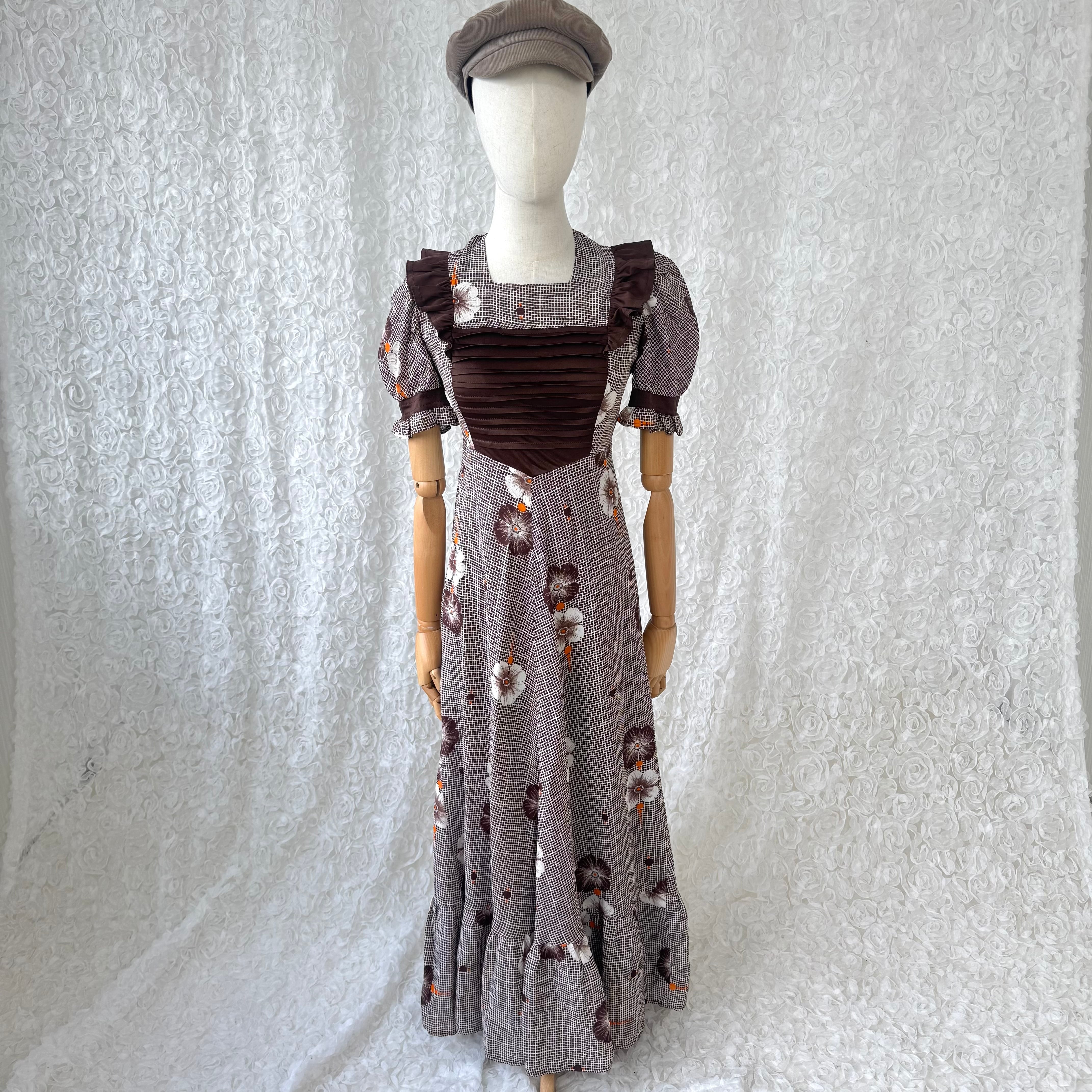 ヨーロッパ古着 花柄 ロングワンピース ブラウン スクエアネック フリルショルダー パフスリーブ ヴィンテージ