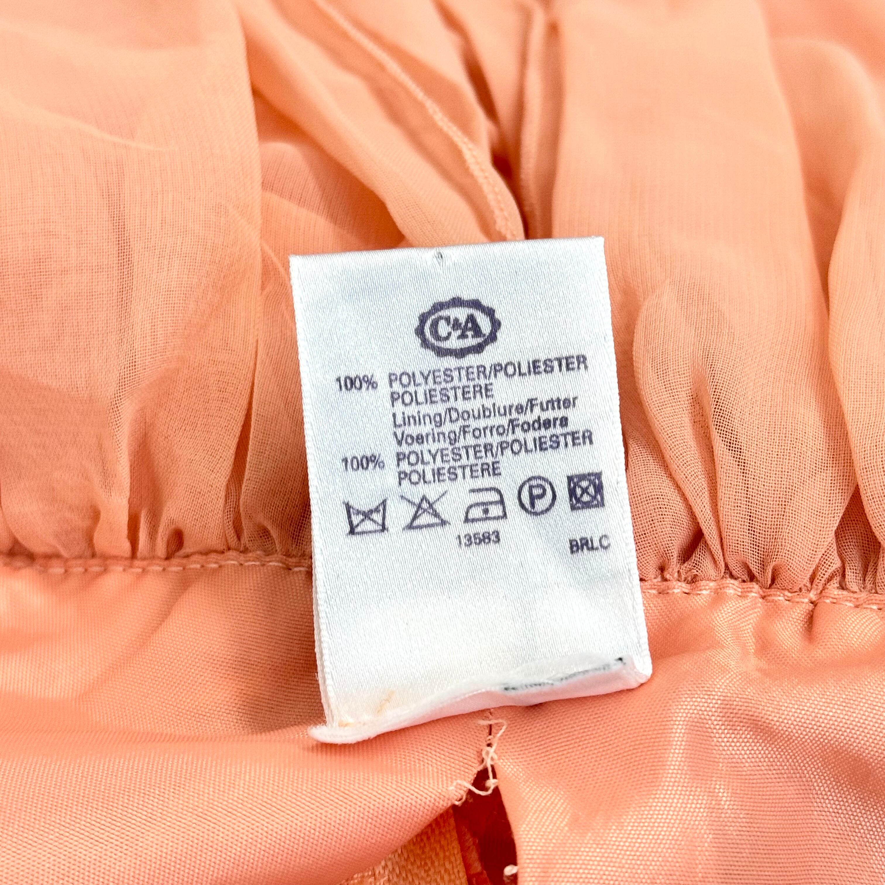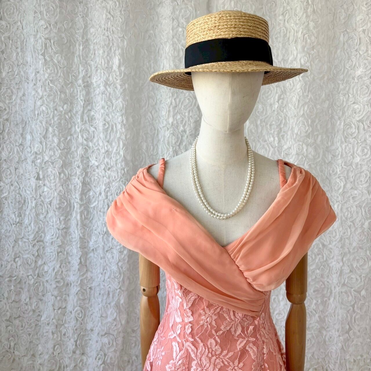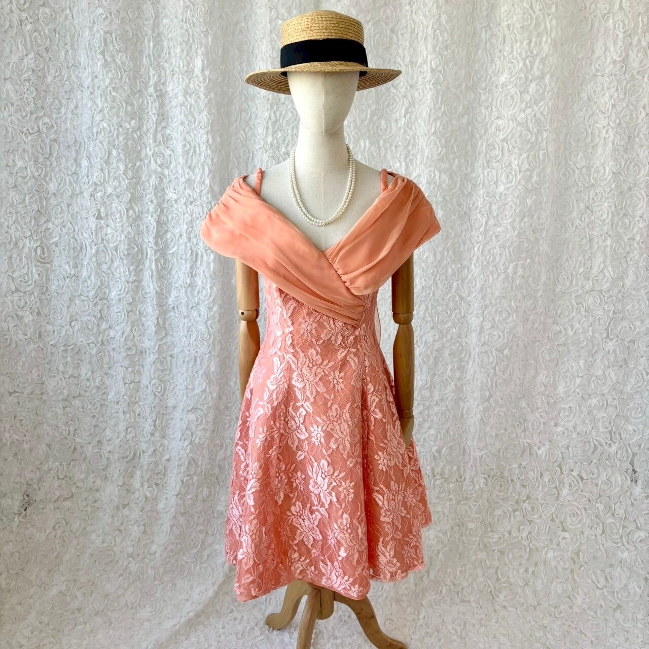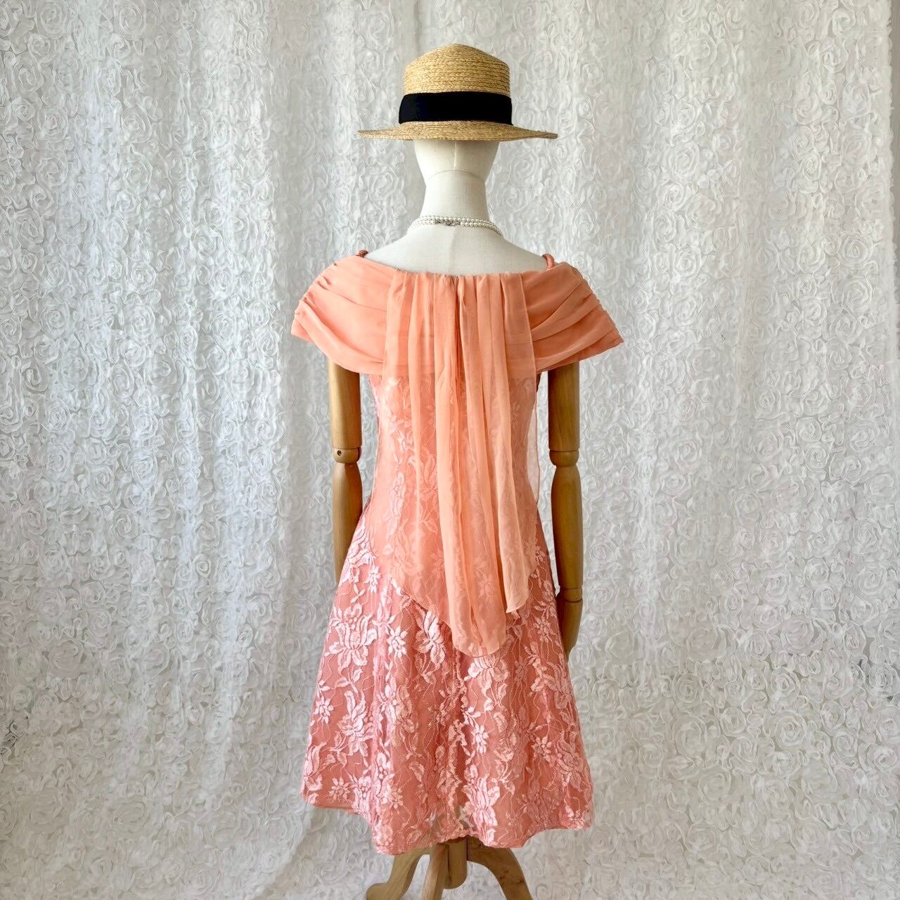 フランス製 ヴィンテージ サーモンピンク 刺繍レース×シフォン ワンピース|花刺繍 ドレープデザイン 結婚式・パーティーに