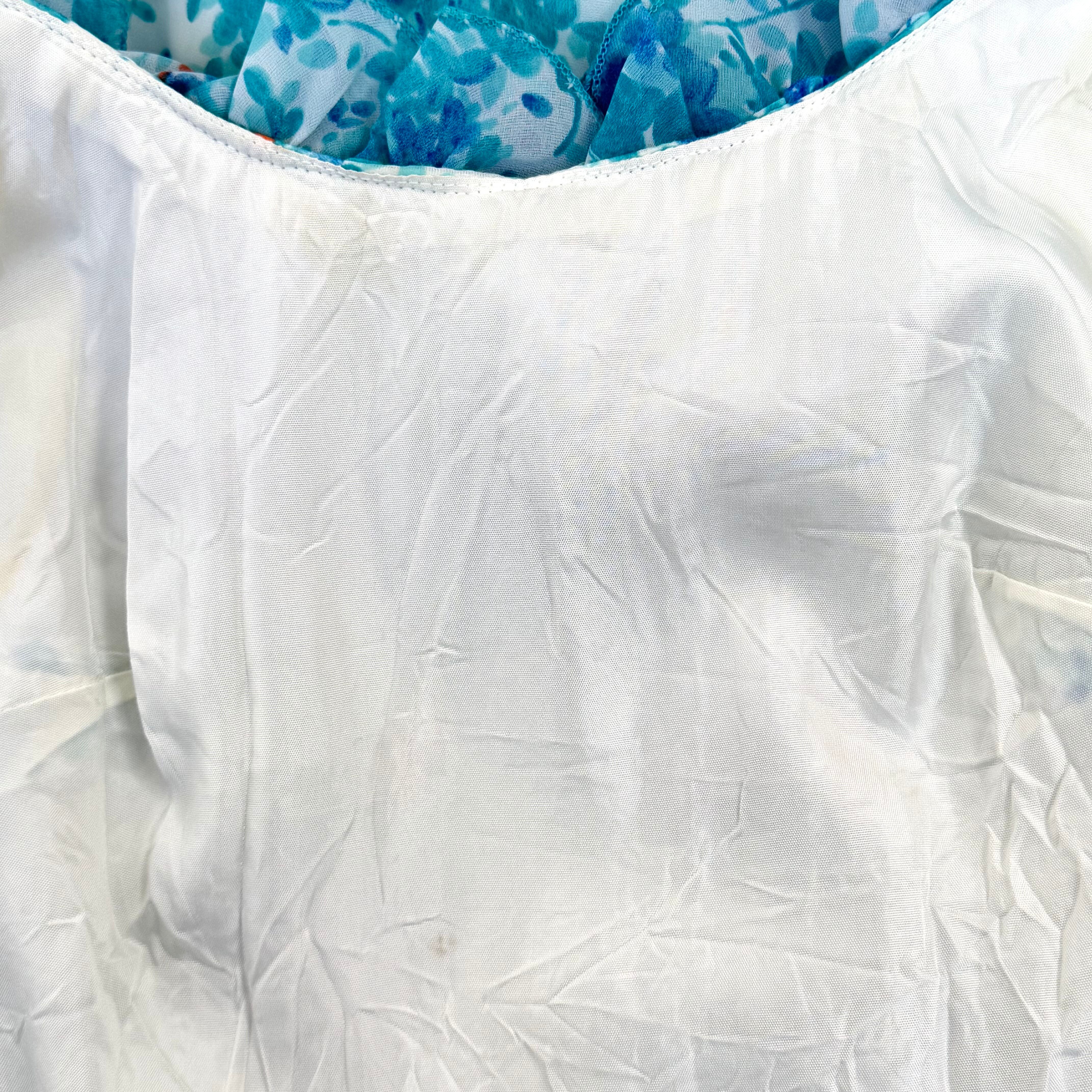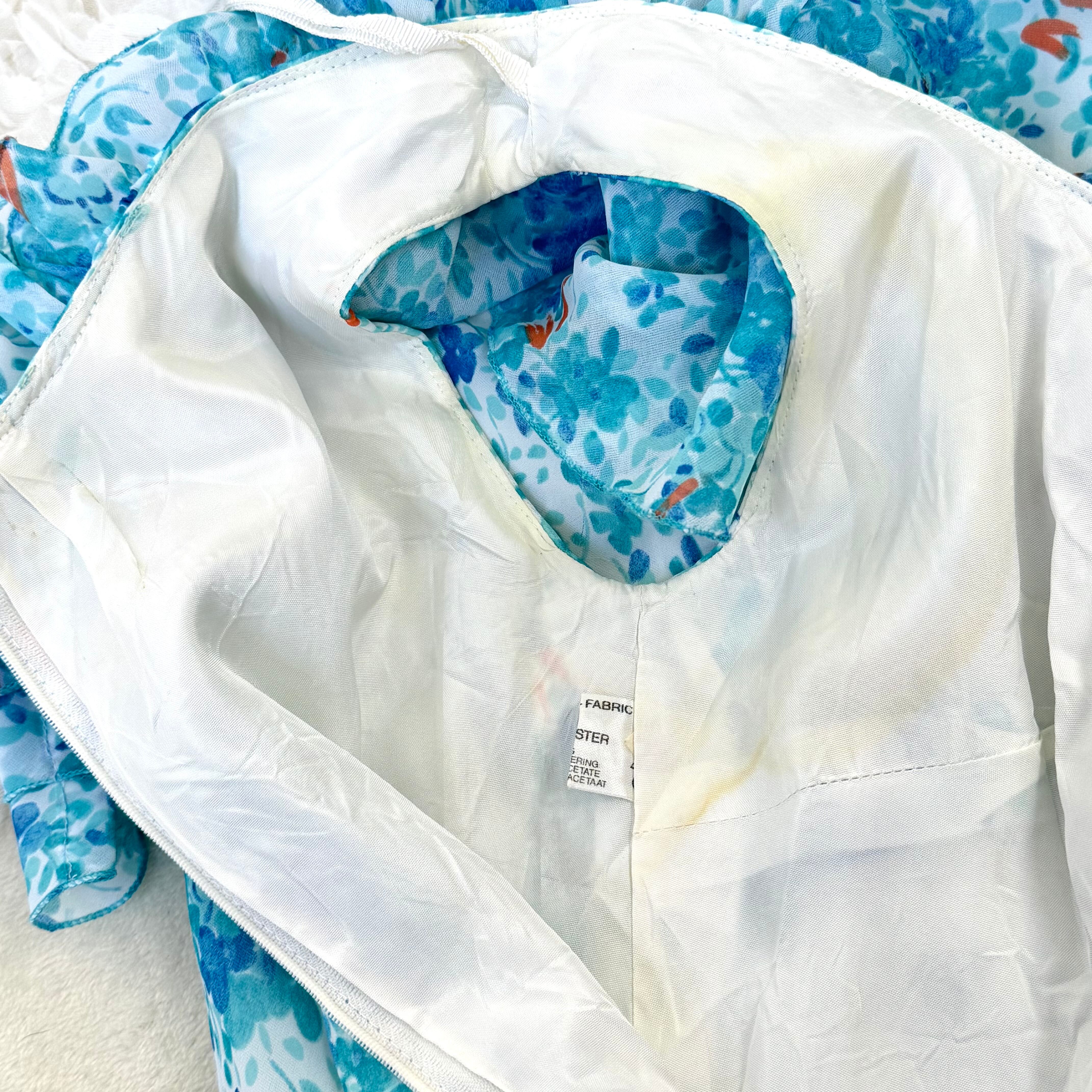 フラワープリント ティアードフリルカラー ロングワンピース ブルー系 ヴィンテージライク