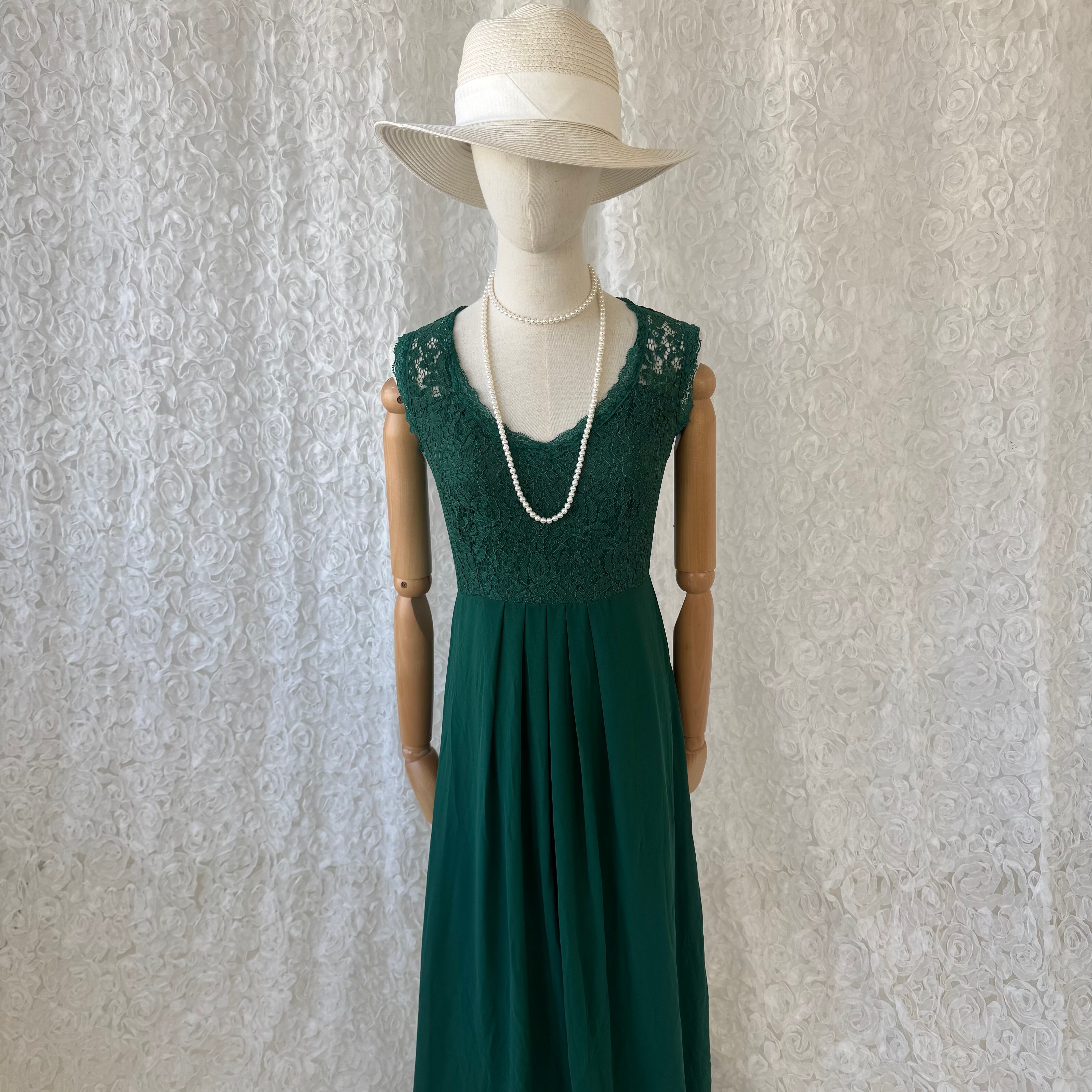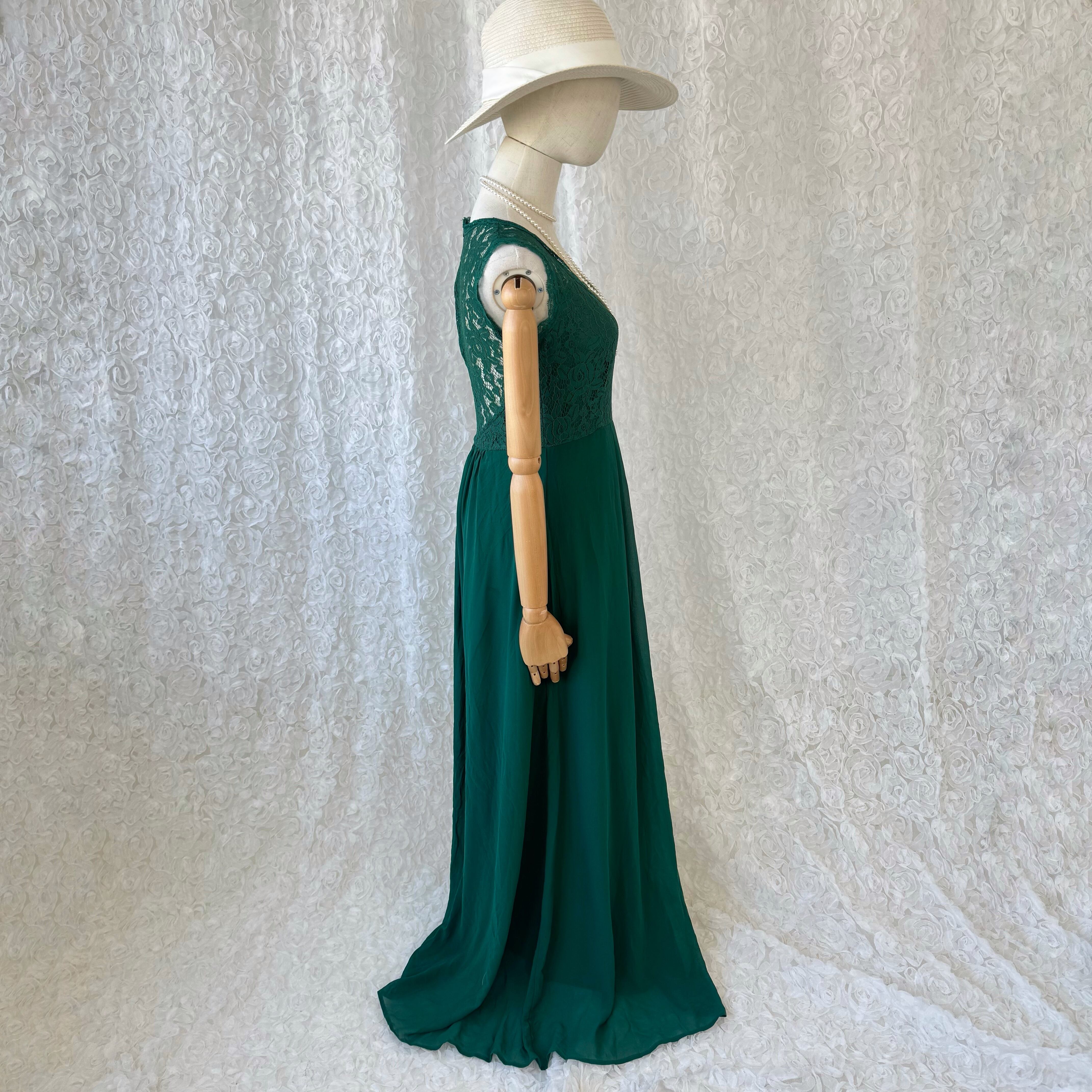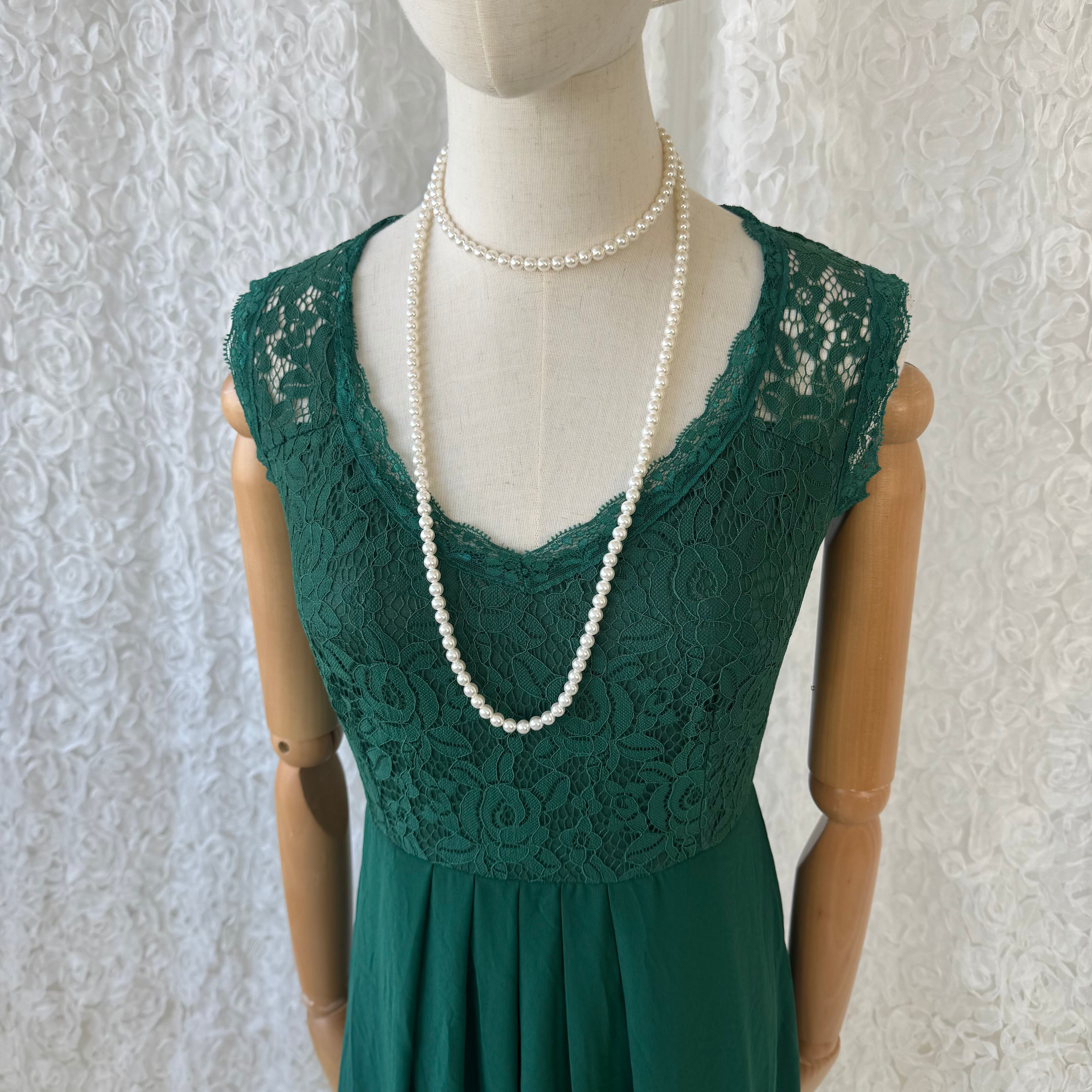 深みのあるエメラルドグリーンに、繊細な総レースとシフォンのドレープが映えるエレガントなロングドレス。