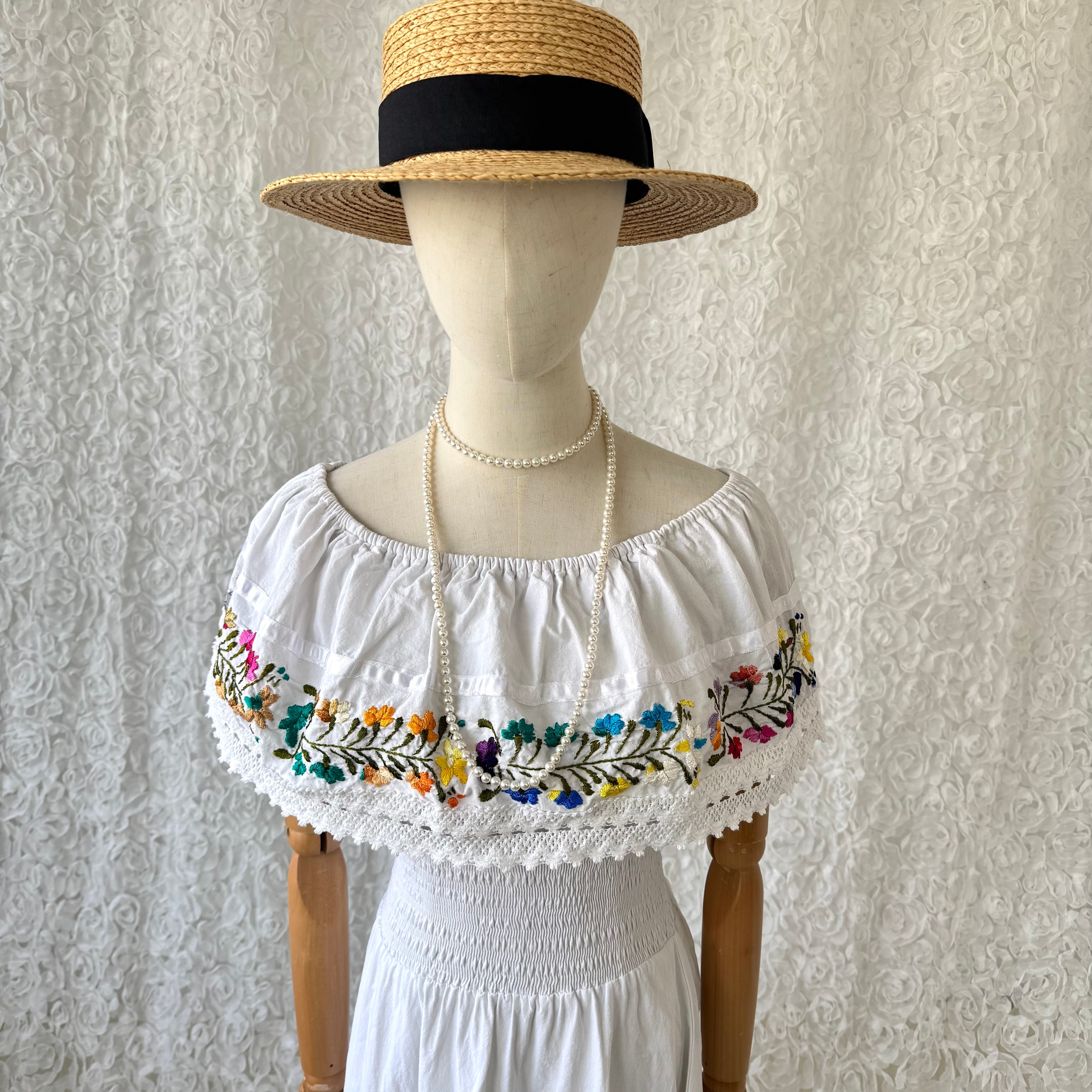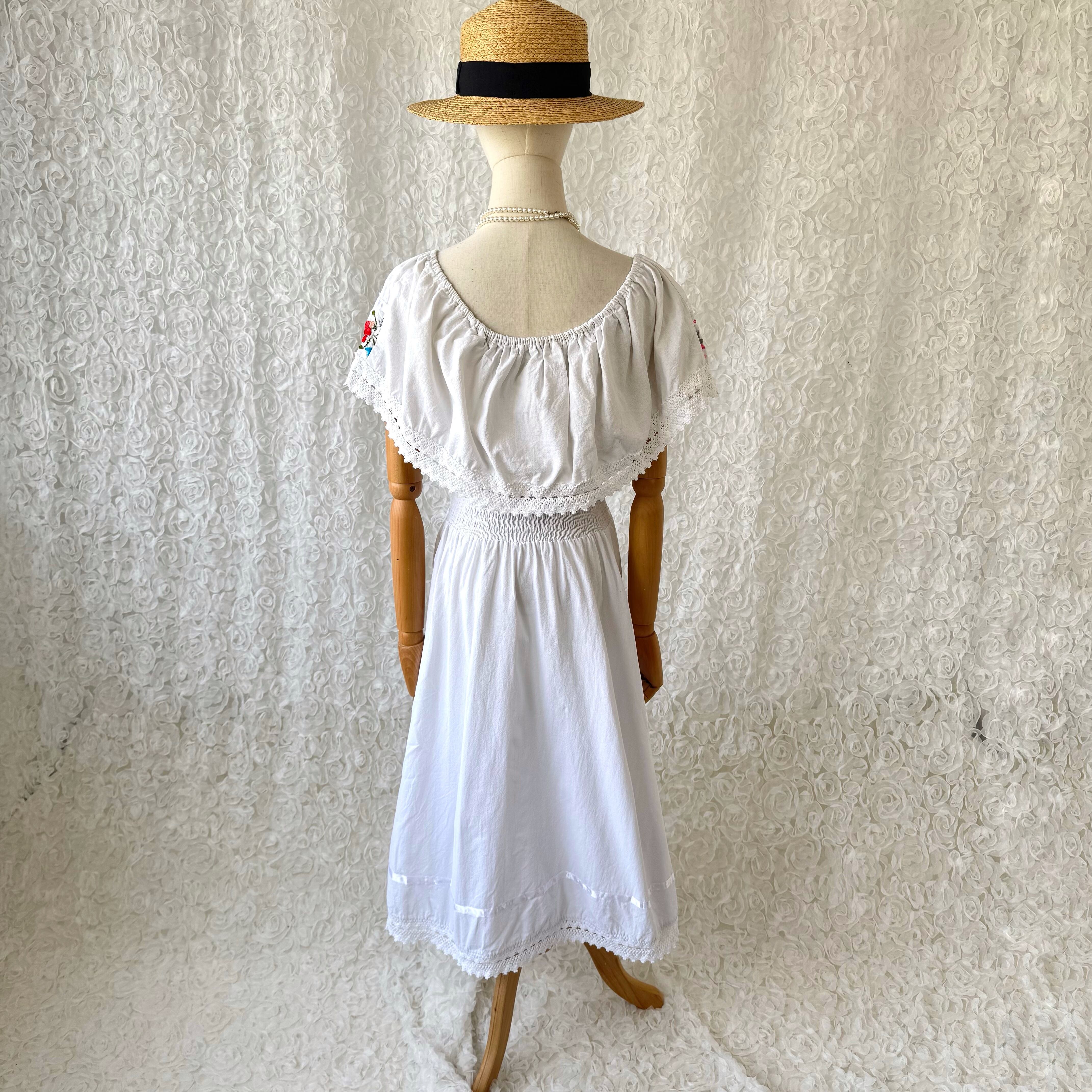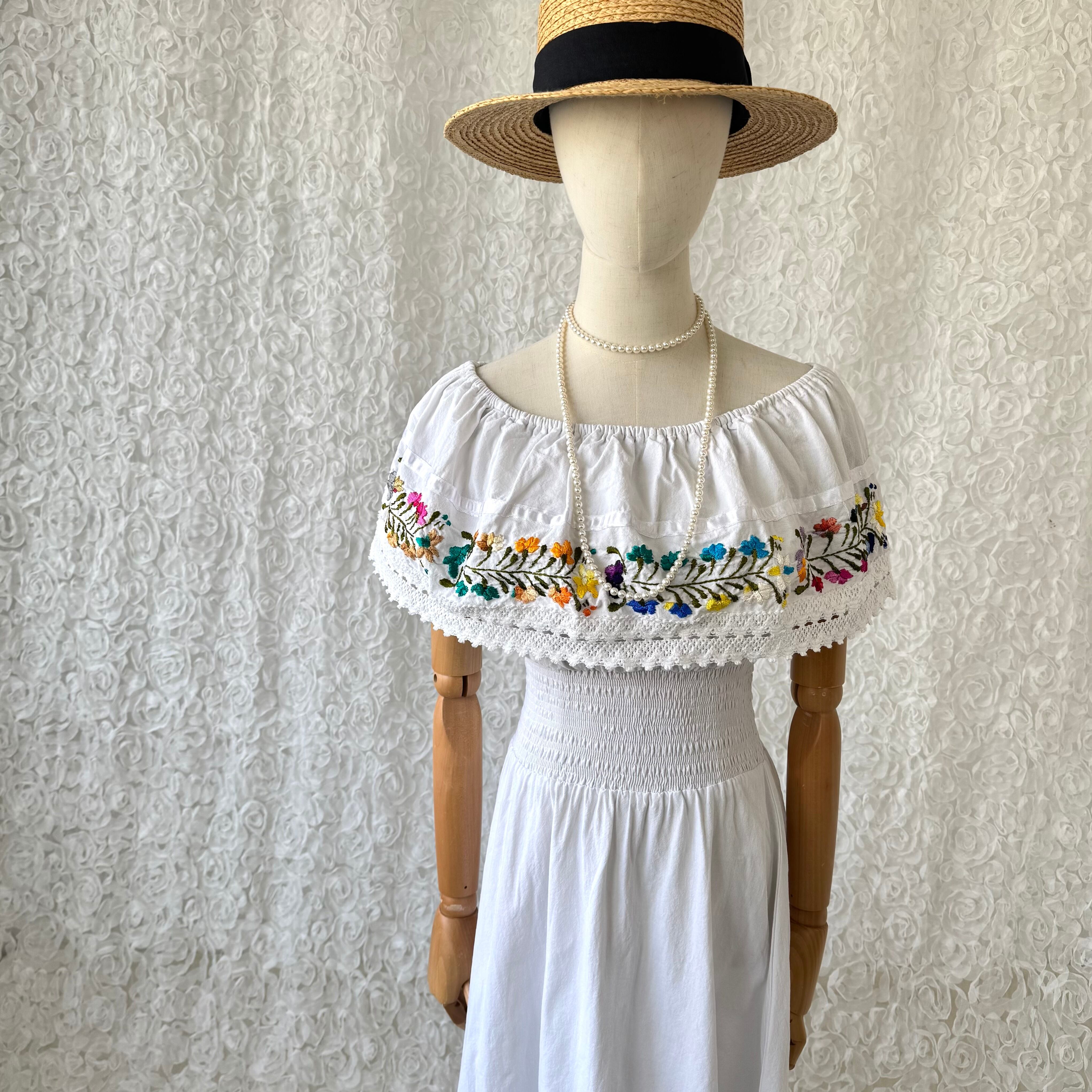 メキシカン刺繍風 オフショル白ワンピ ロング丈 リゾート