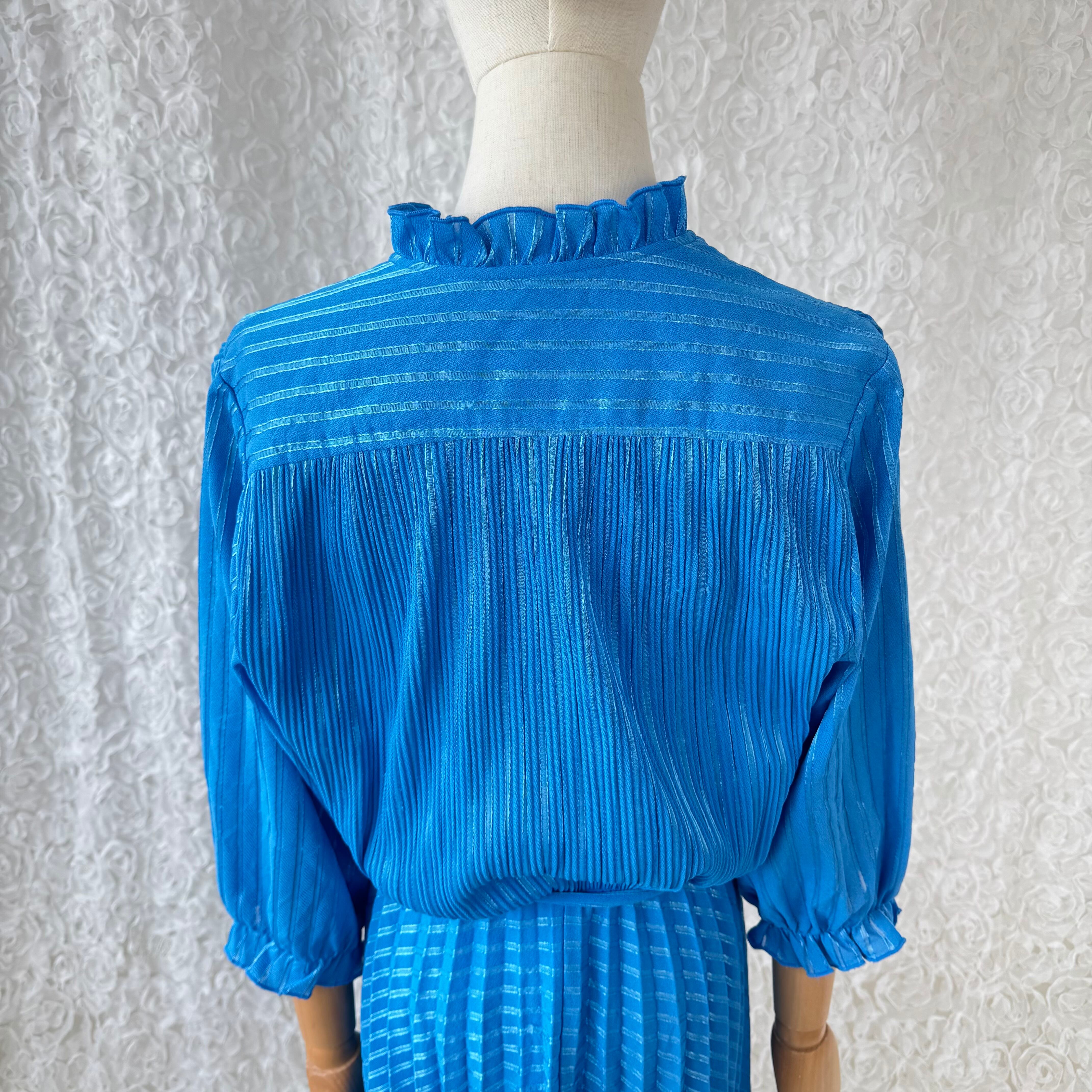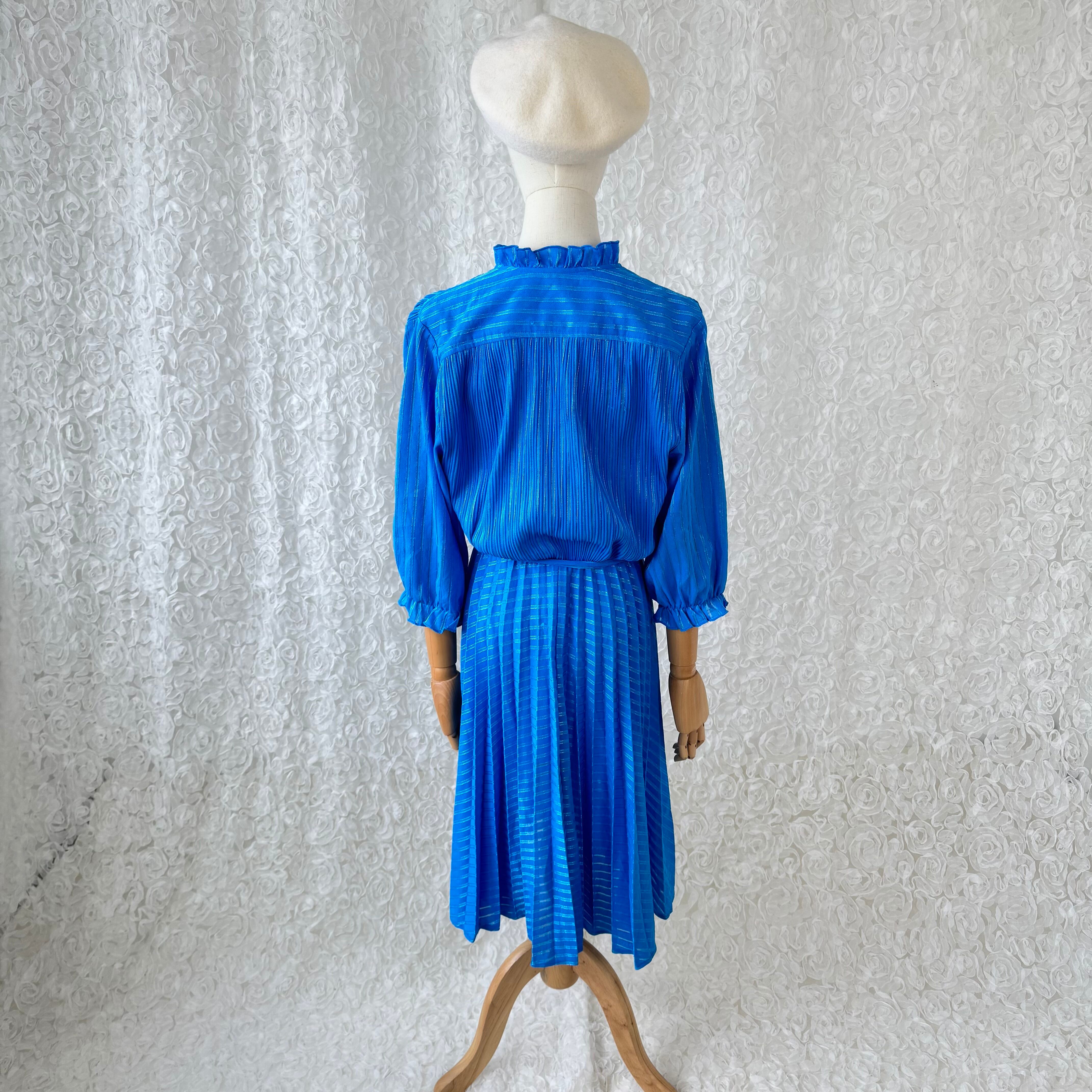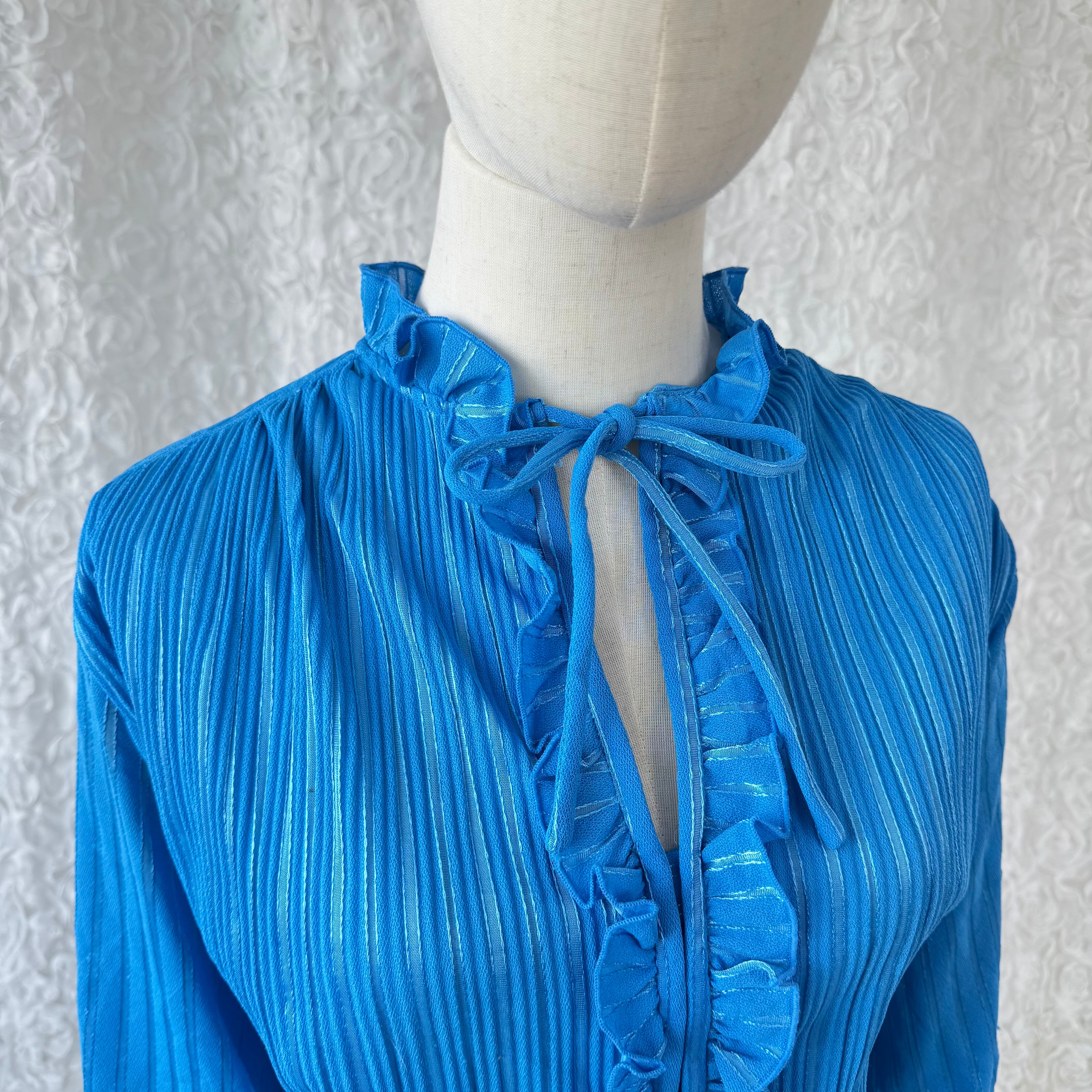 C&A フリルデザイン リボンタイ プリーツワンピース 七部袖 ベルト付き ターコイズブルー