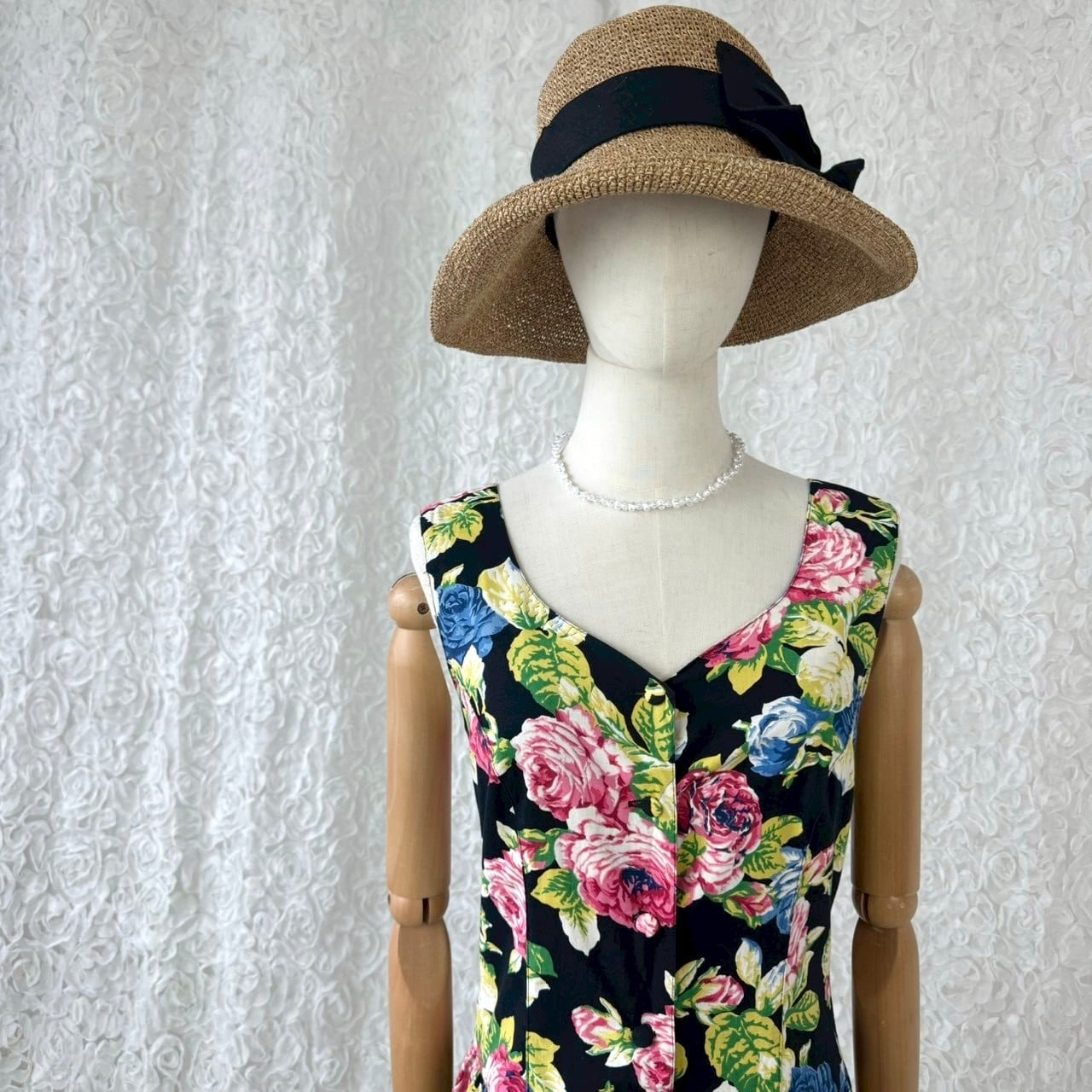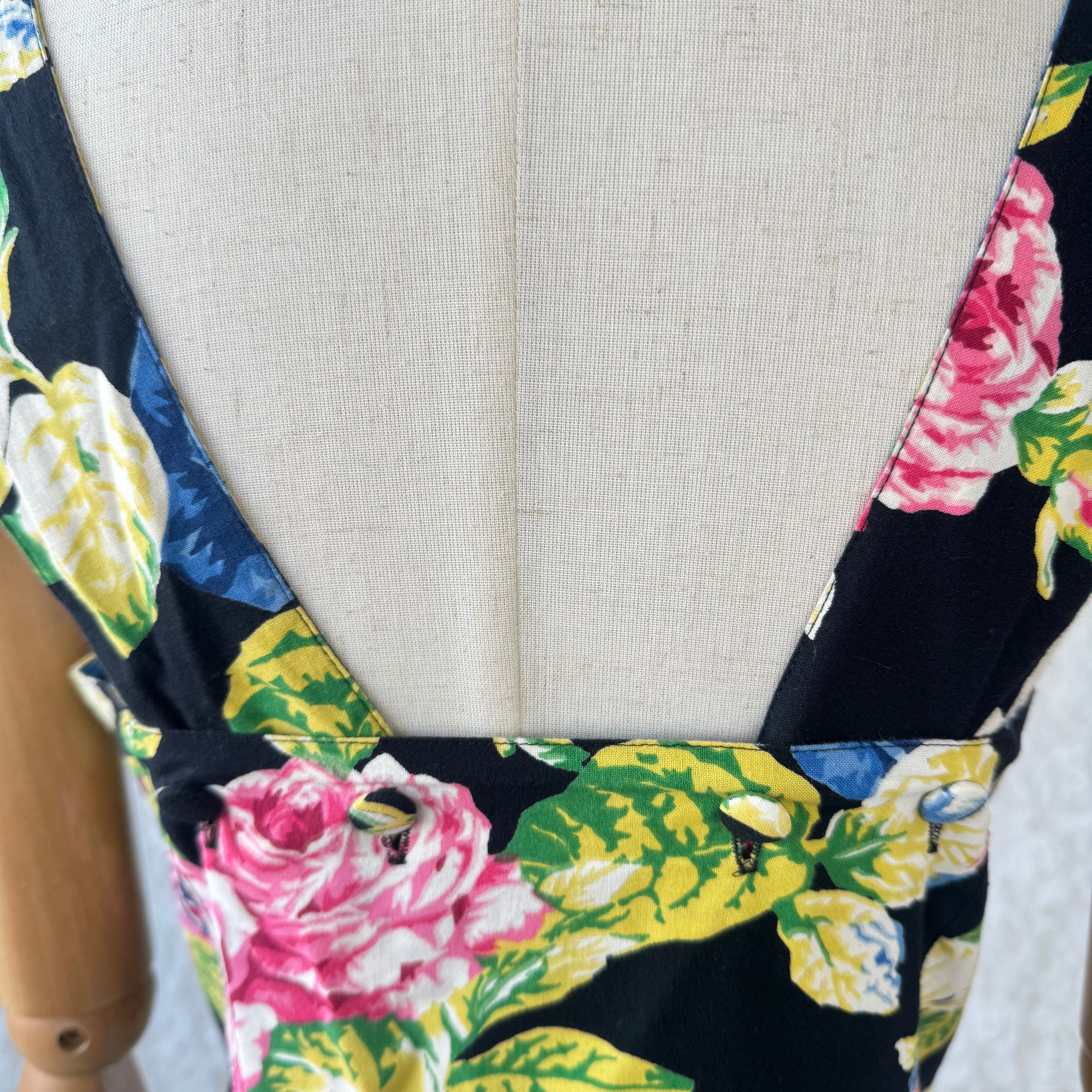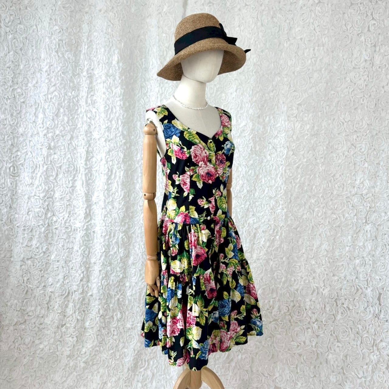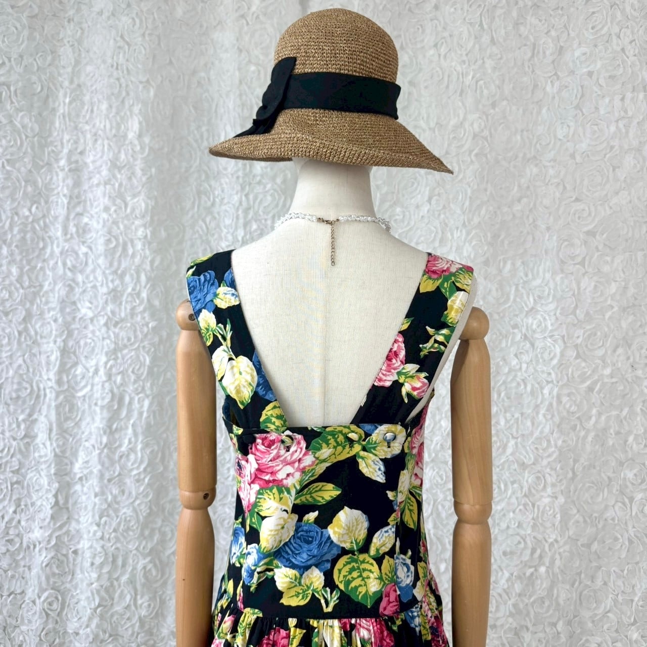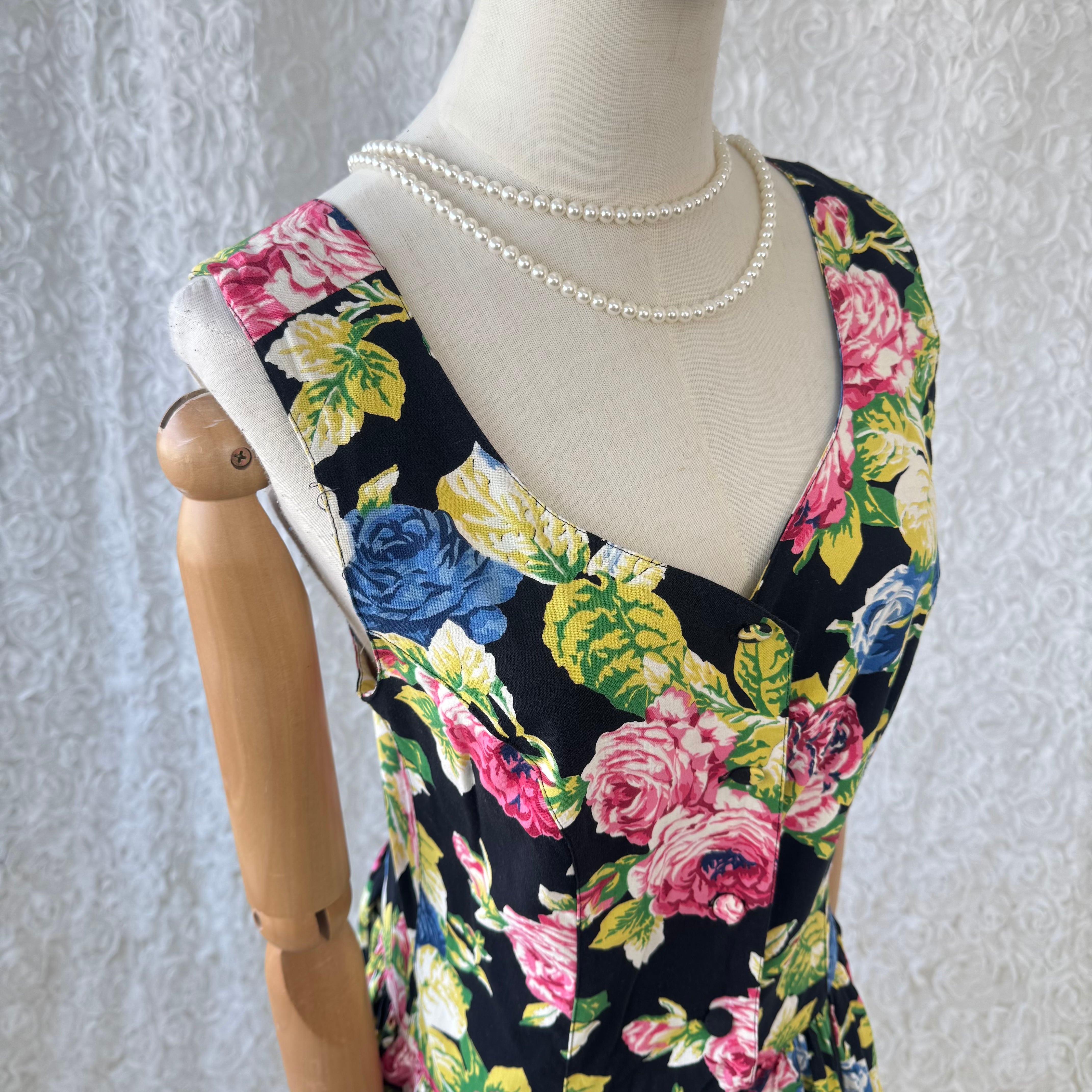 ブラックベースにカラフルなボタニカル模様が映える主役級ジャンパースカート。