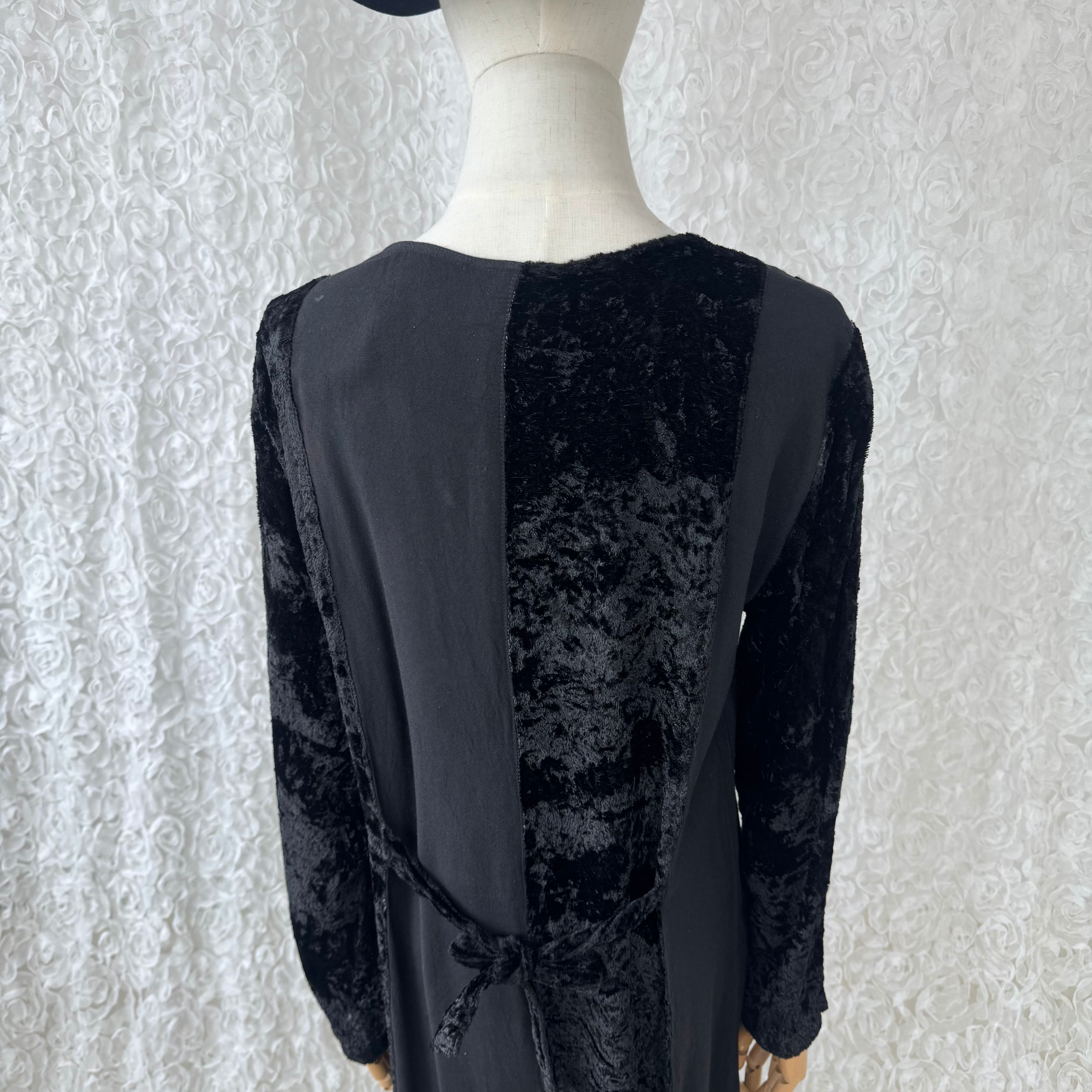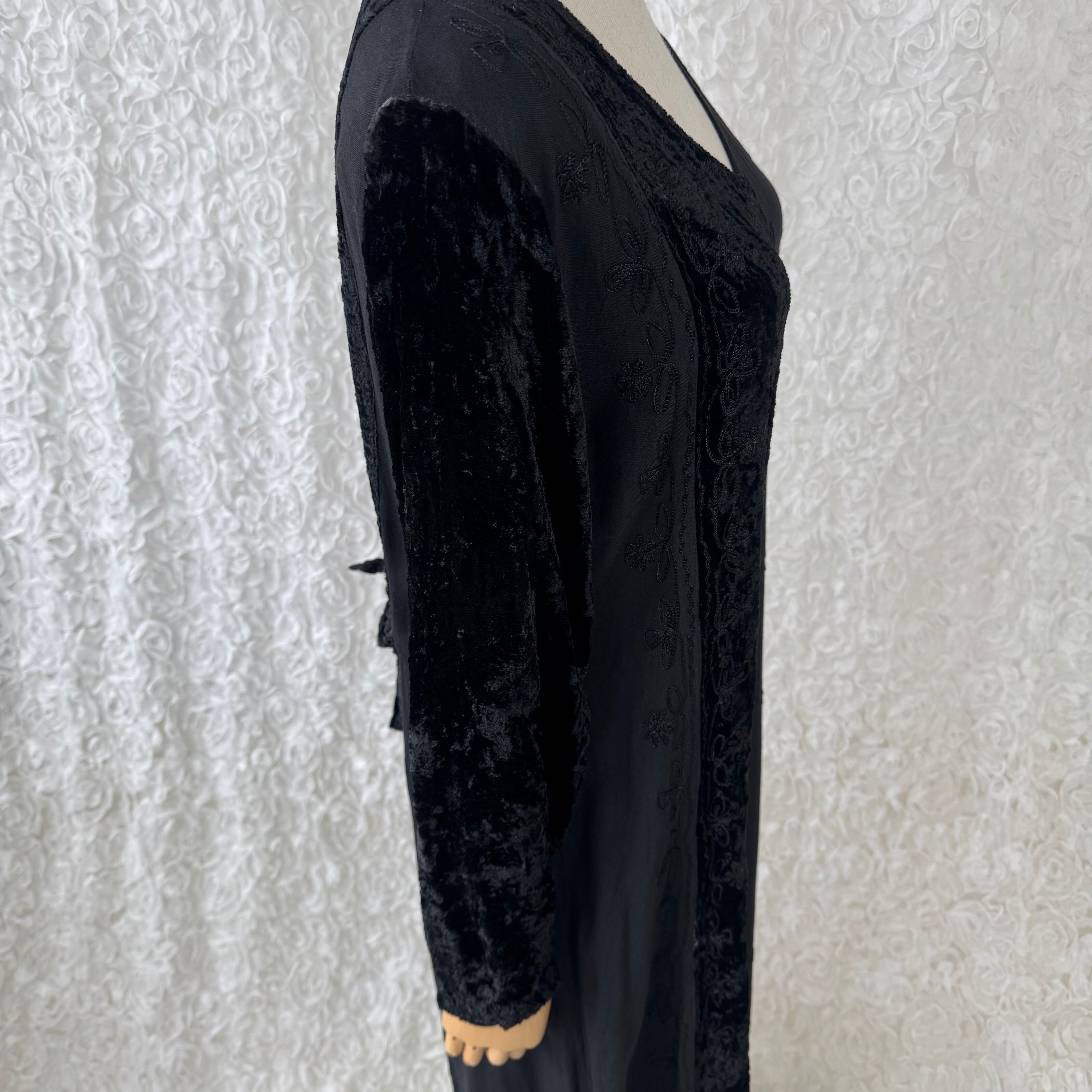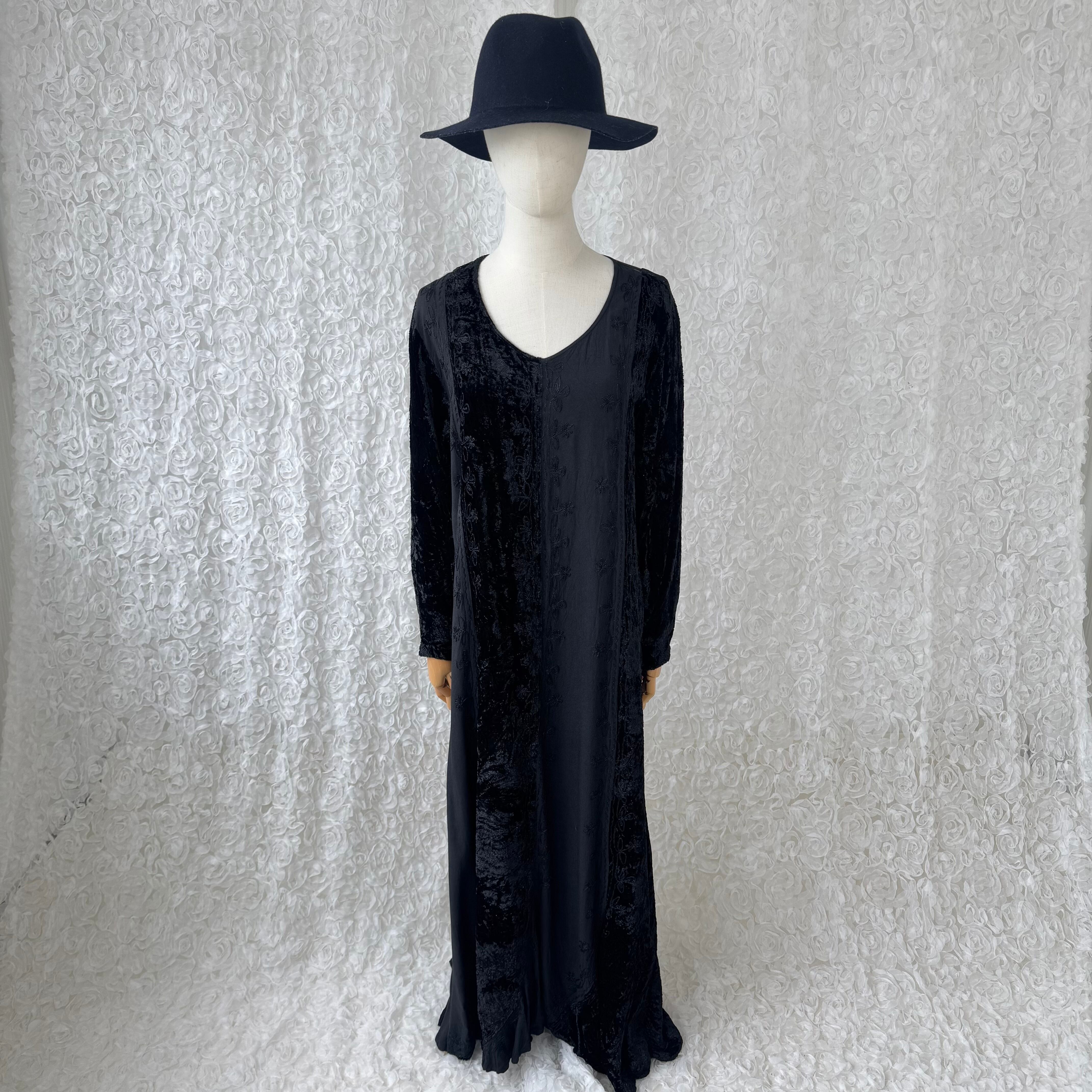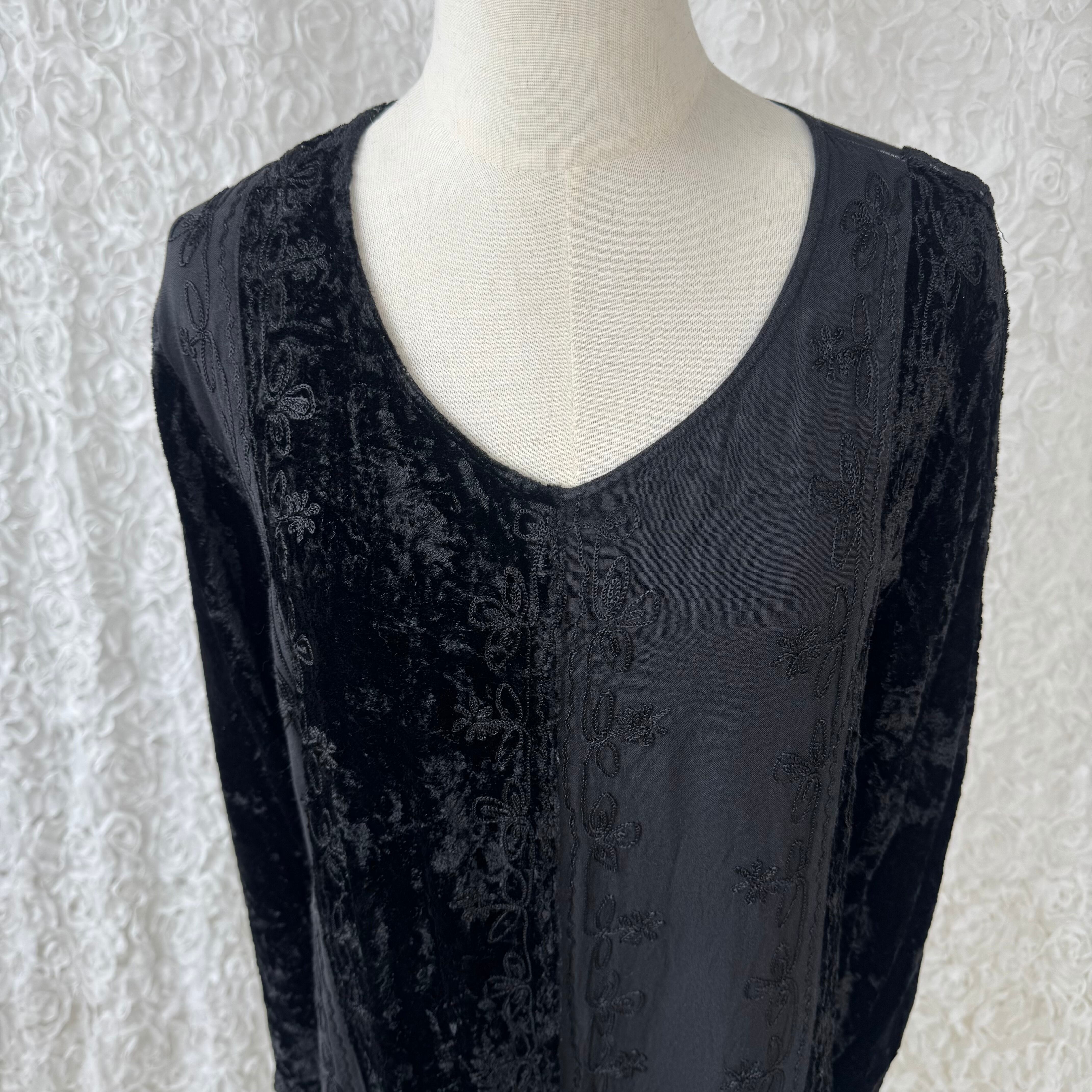 ヴィスコース100% 切替デザイン ベルベット生地 ボタニカル刺繍 ロングワンピース 黒