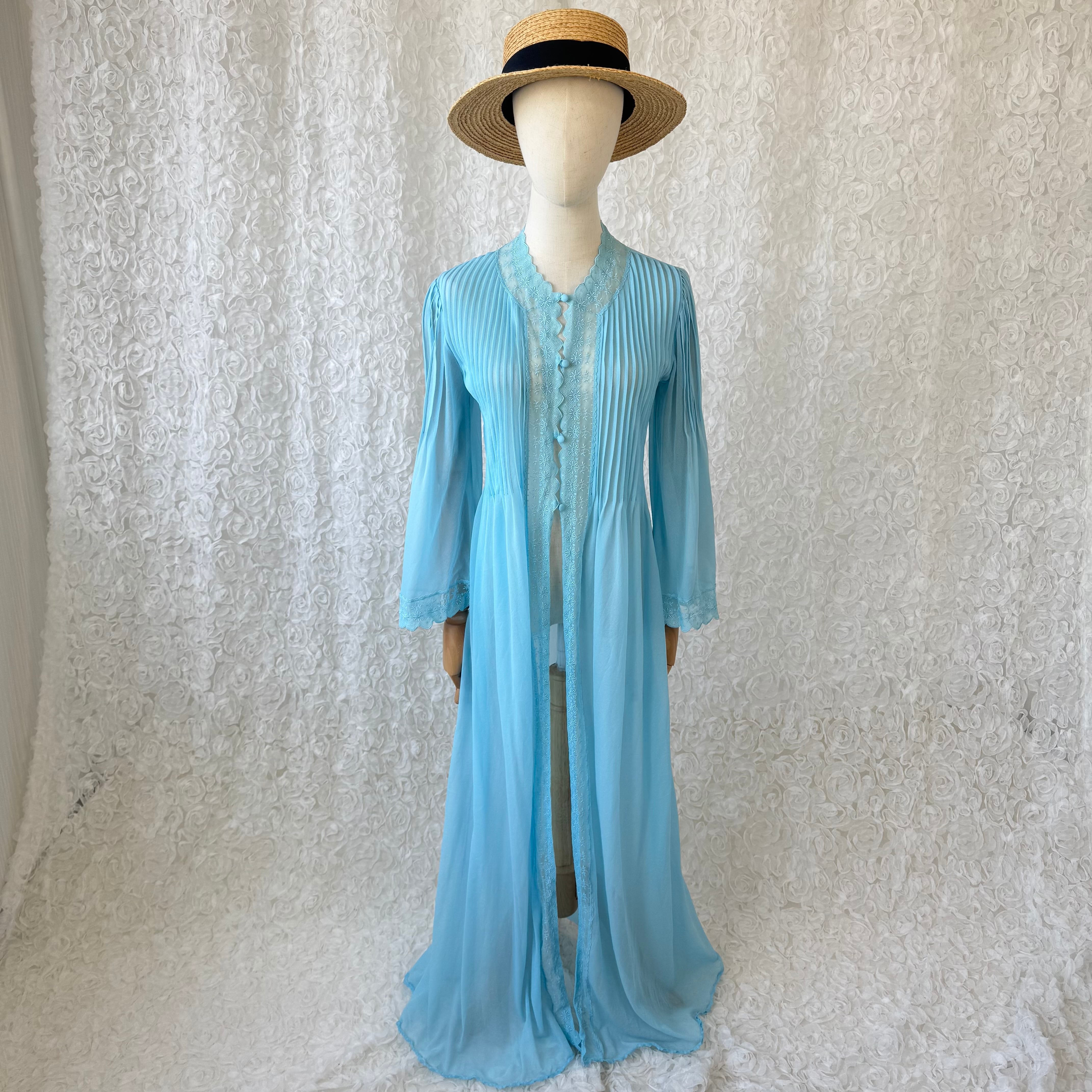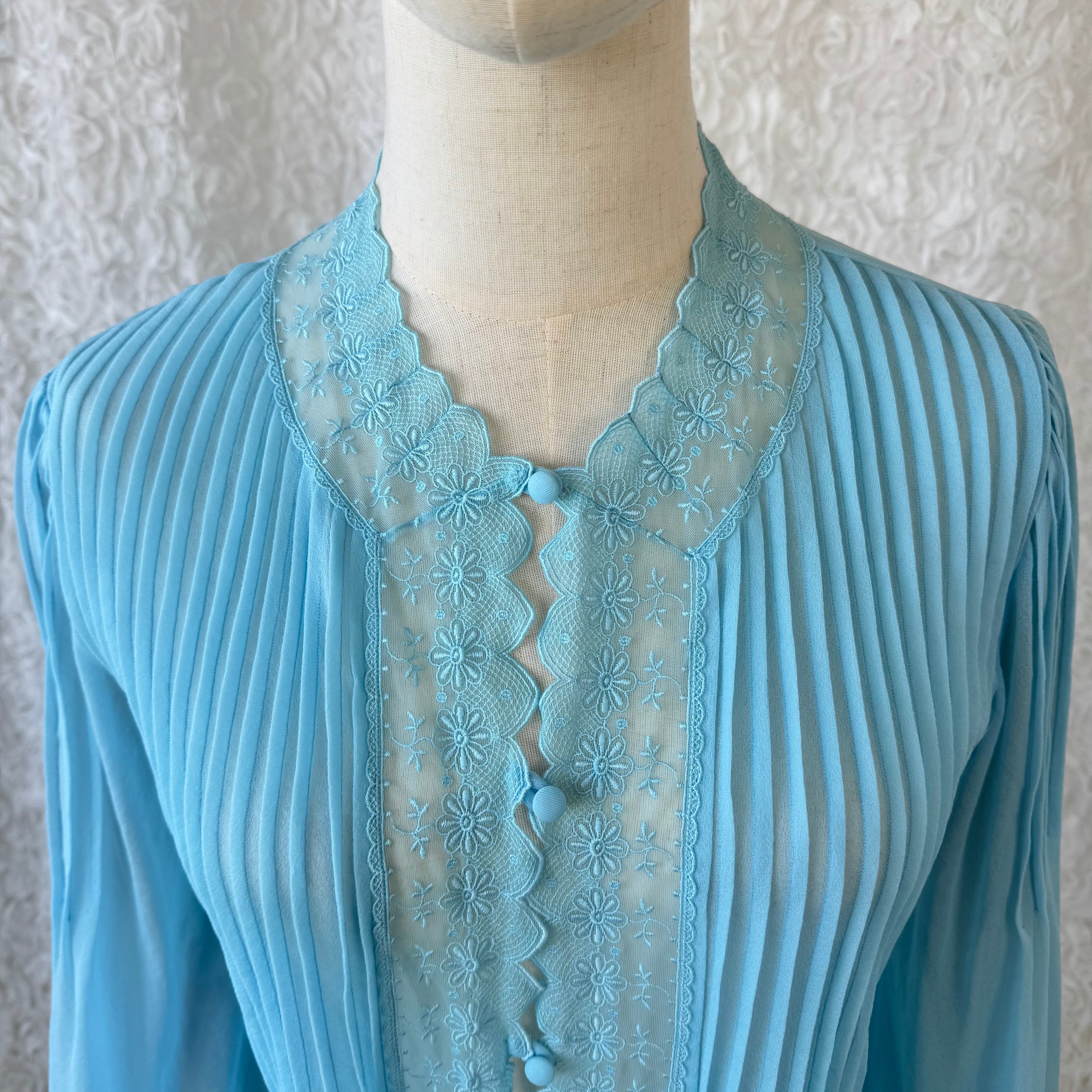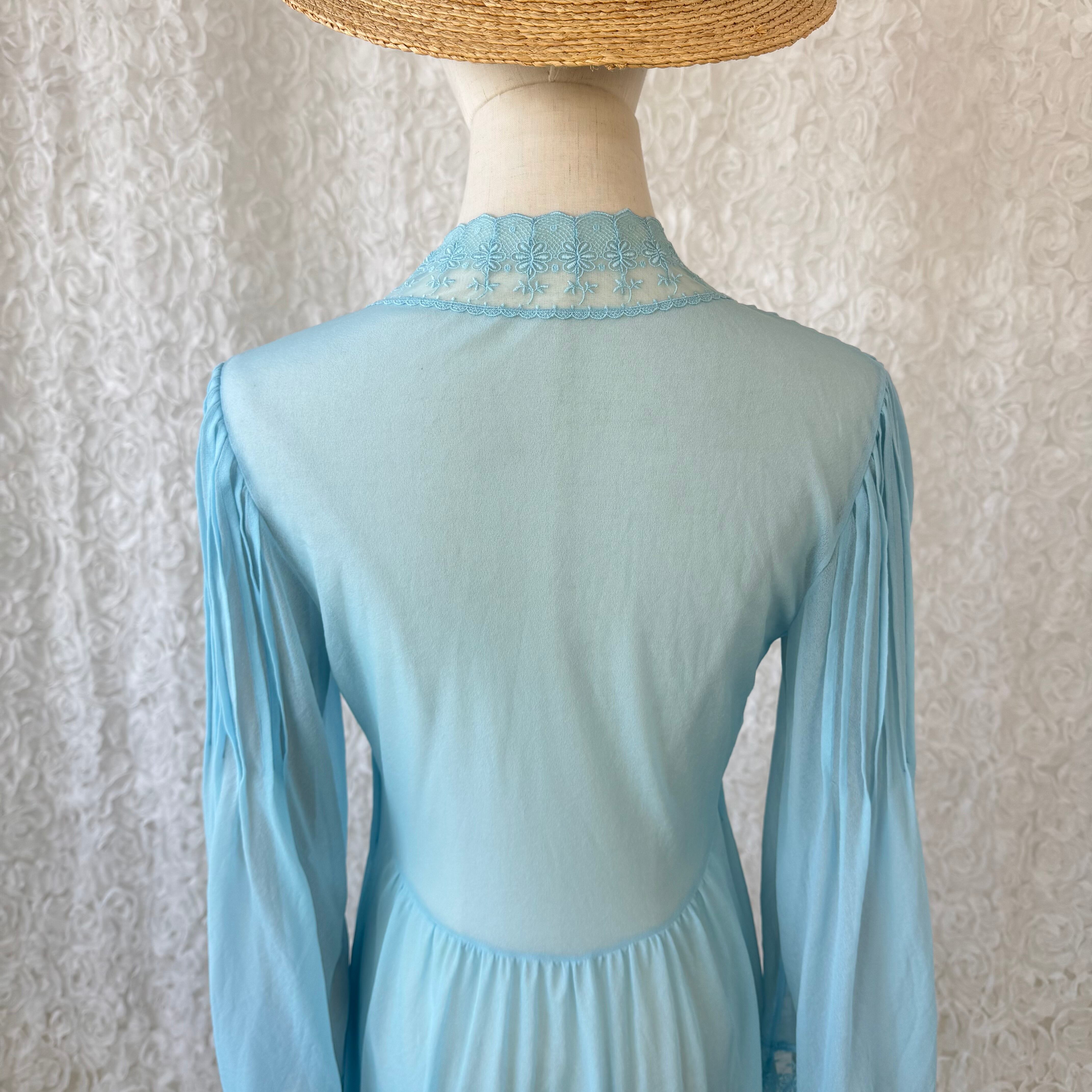 淡く澄んだブルーカラーが印象的な、シアー素材のロングガウンワンピース。