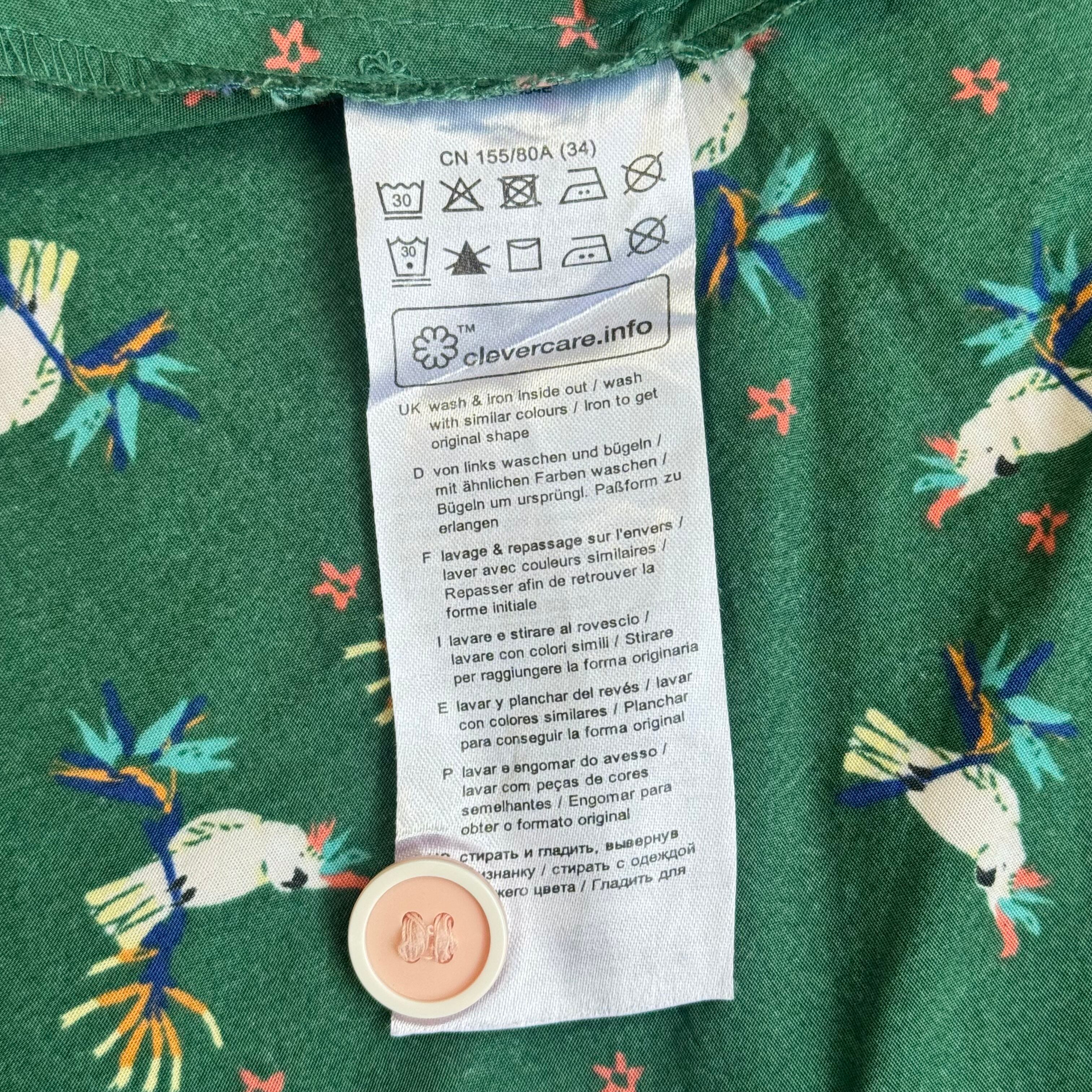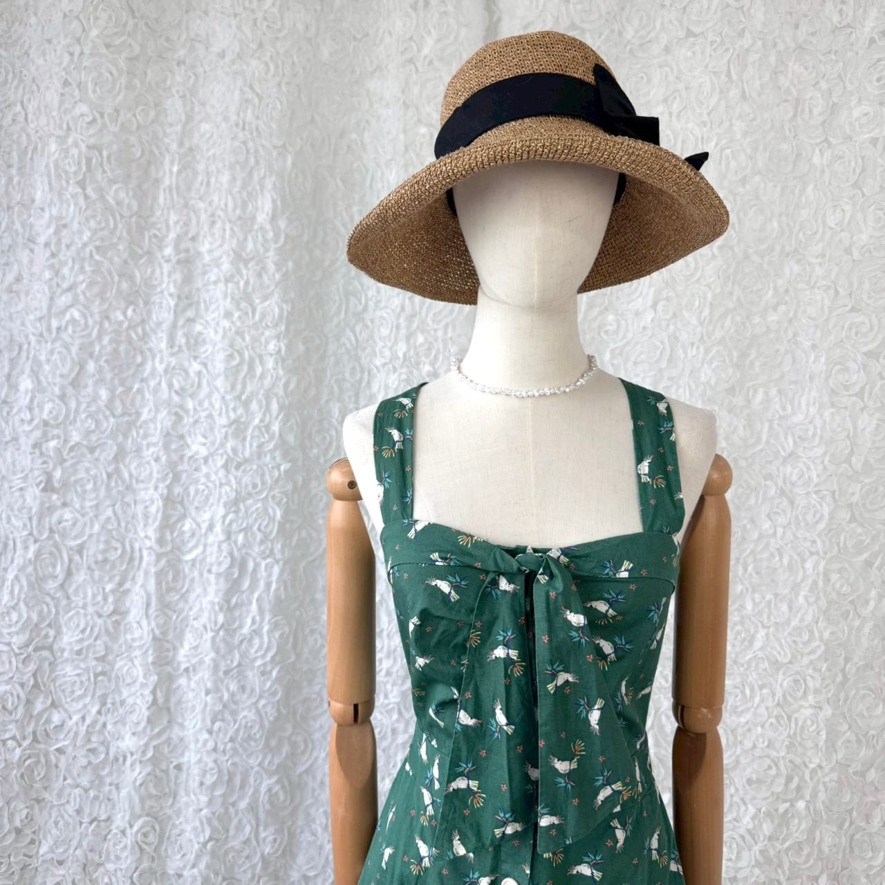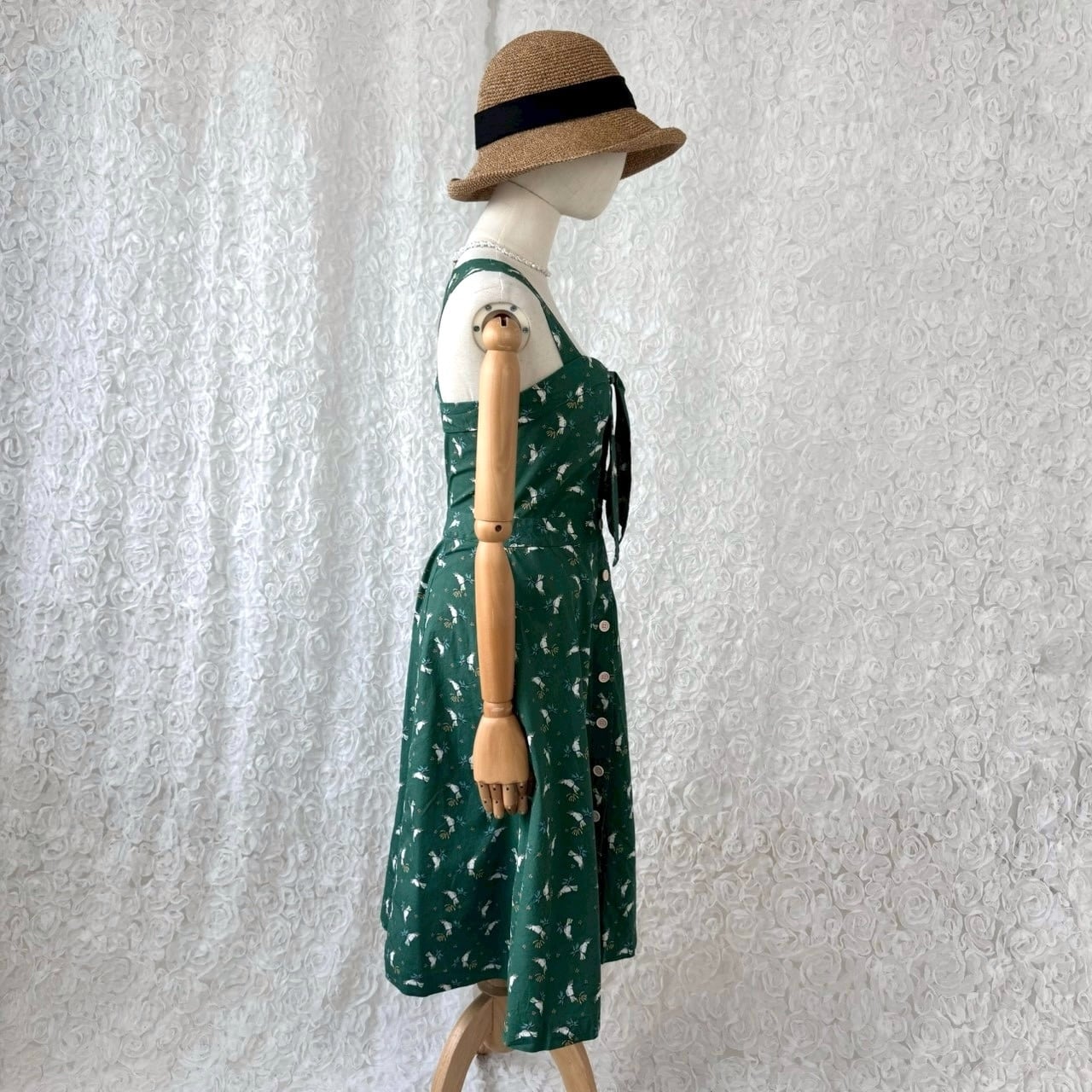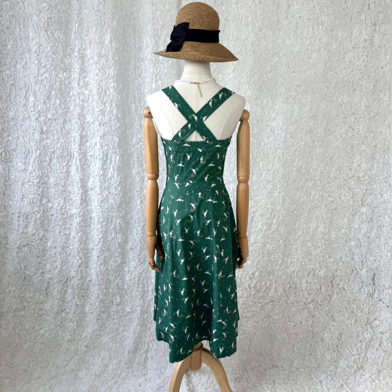 グリーンベースに遊び心のある鳥モチーフが散りばめられた、存在感たっぷりのプリントワンピース。