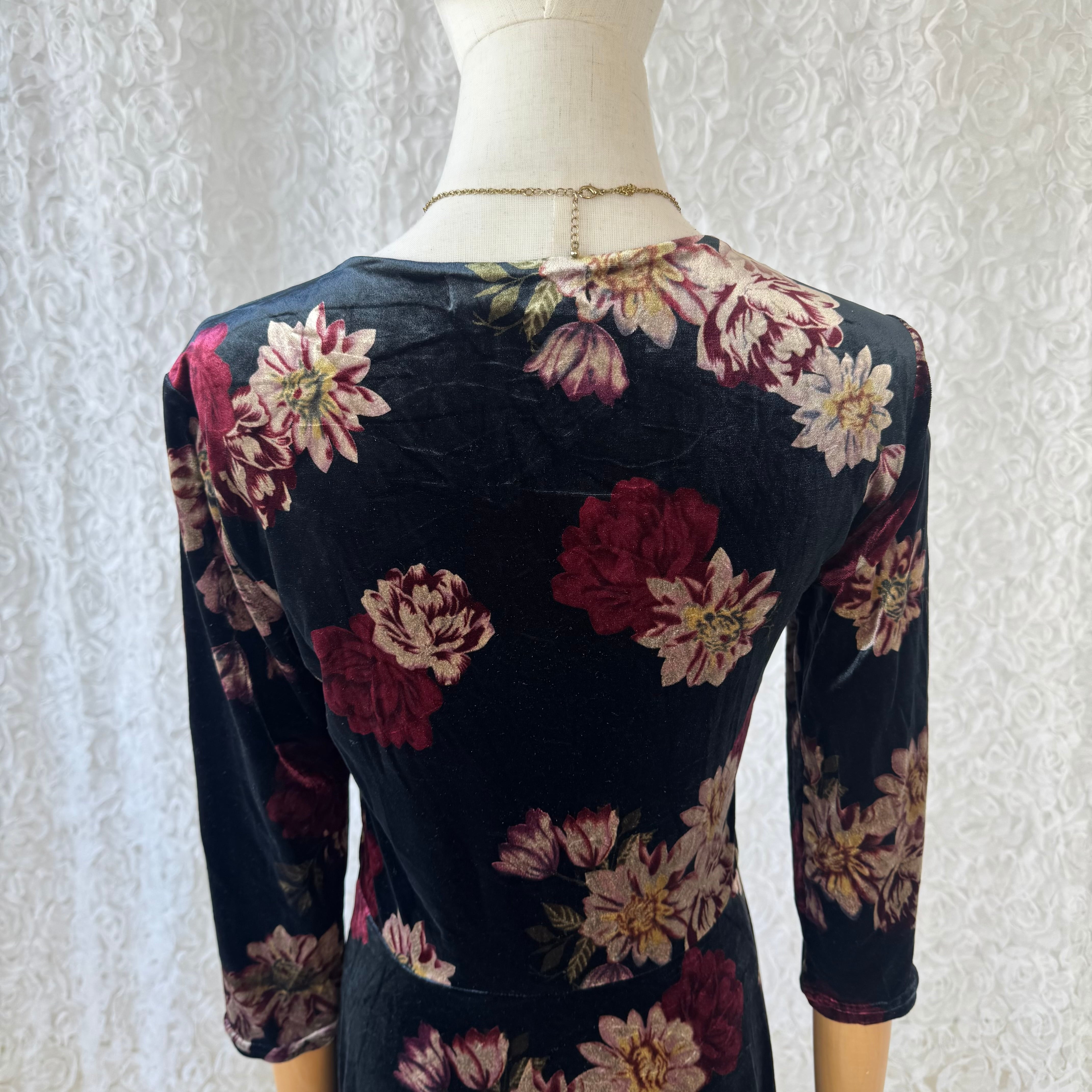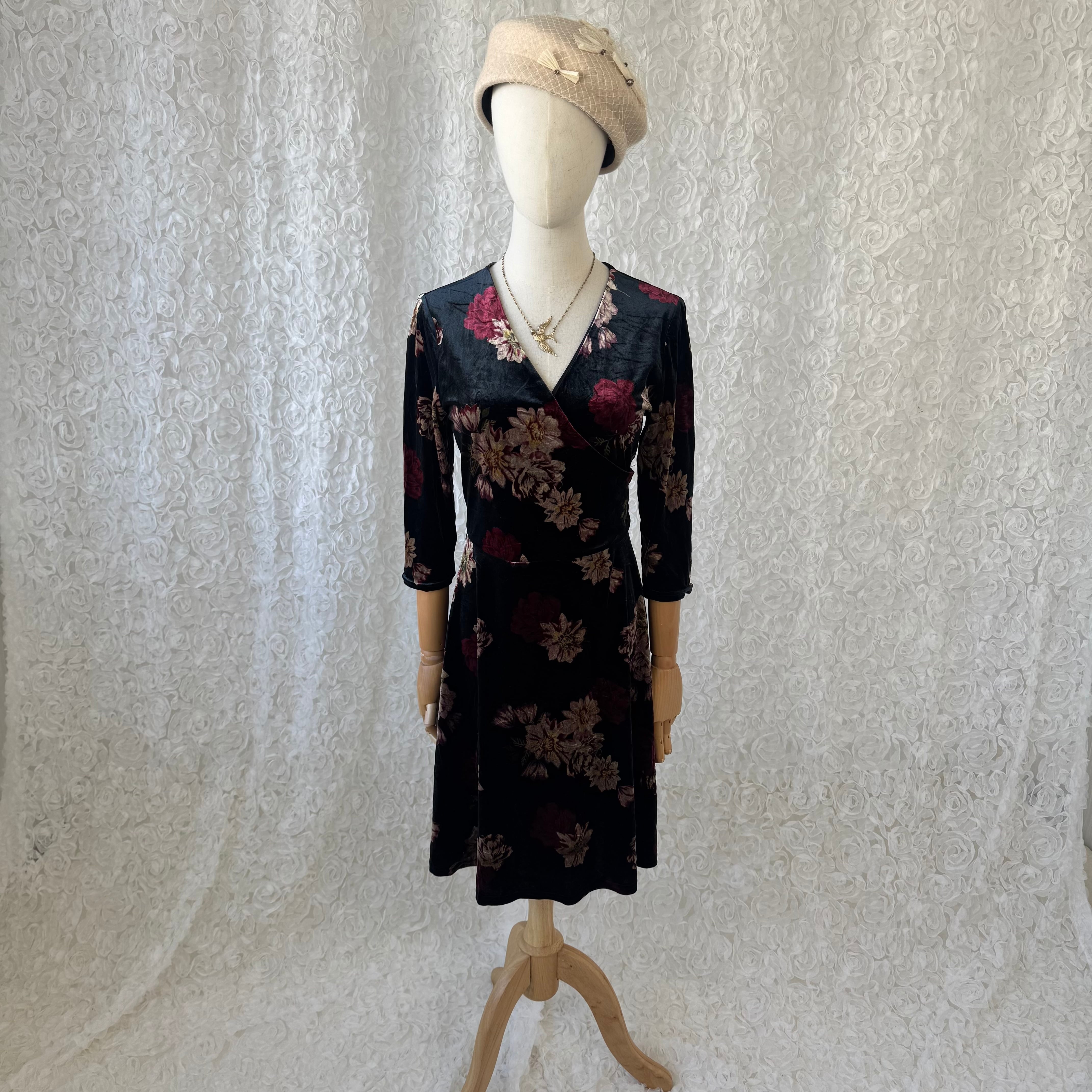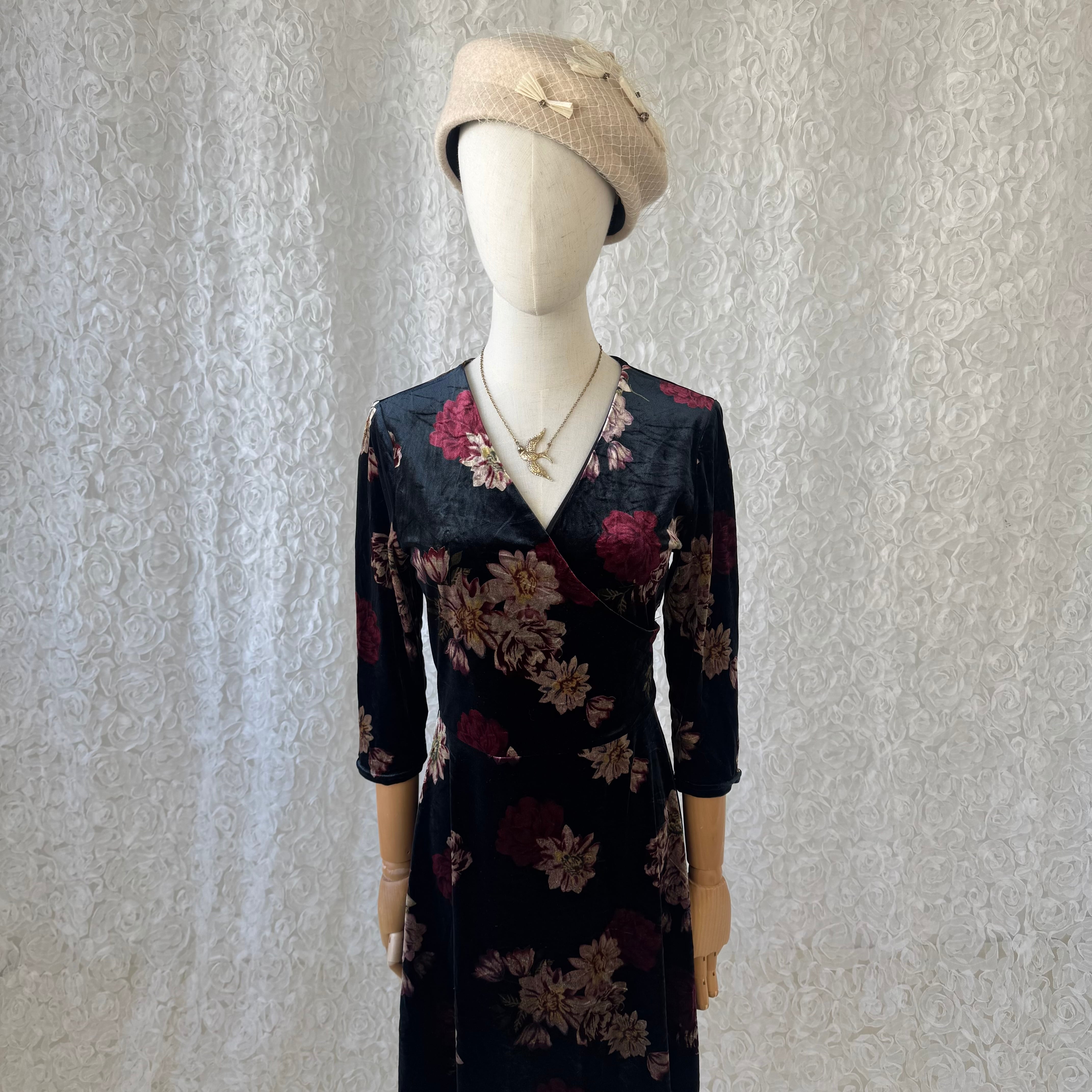 ボタニカル柄ワンピース 花柄ベロア カシュクール ブラック クラシカル