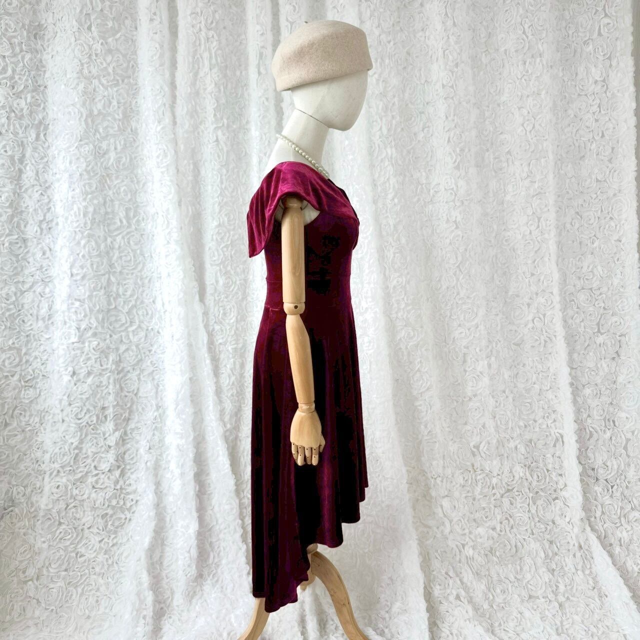 ラズベリーカラー ヴィンテージ ベロア ベルベット ショールカラー フレアワンピース イレギュラーヘム