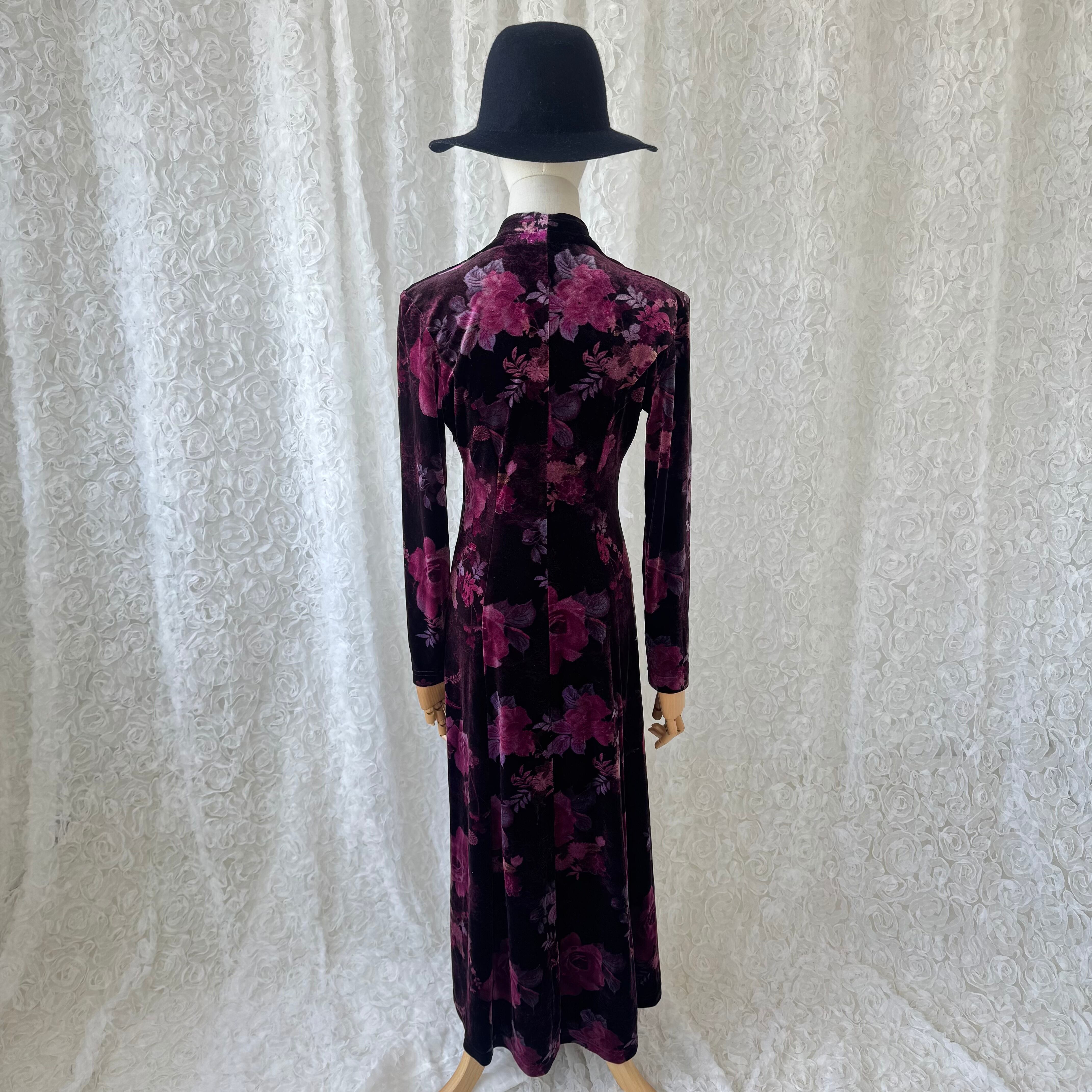 深みのあるパープル系カラーに花柄が映える、上品なベルベットロングワンピース。