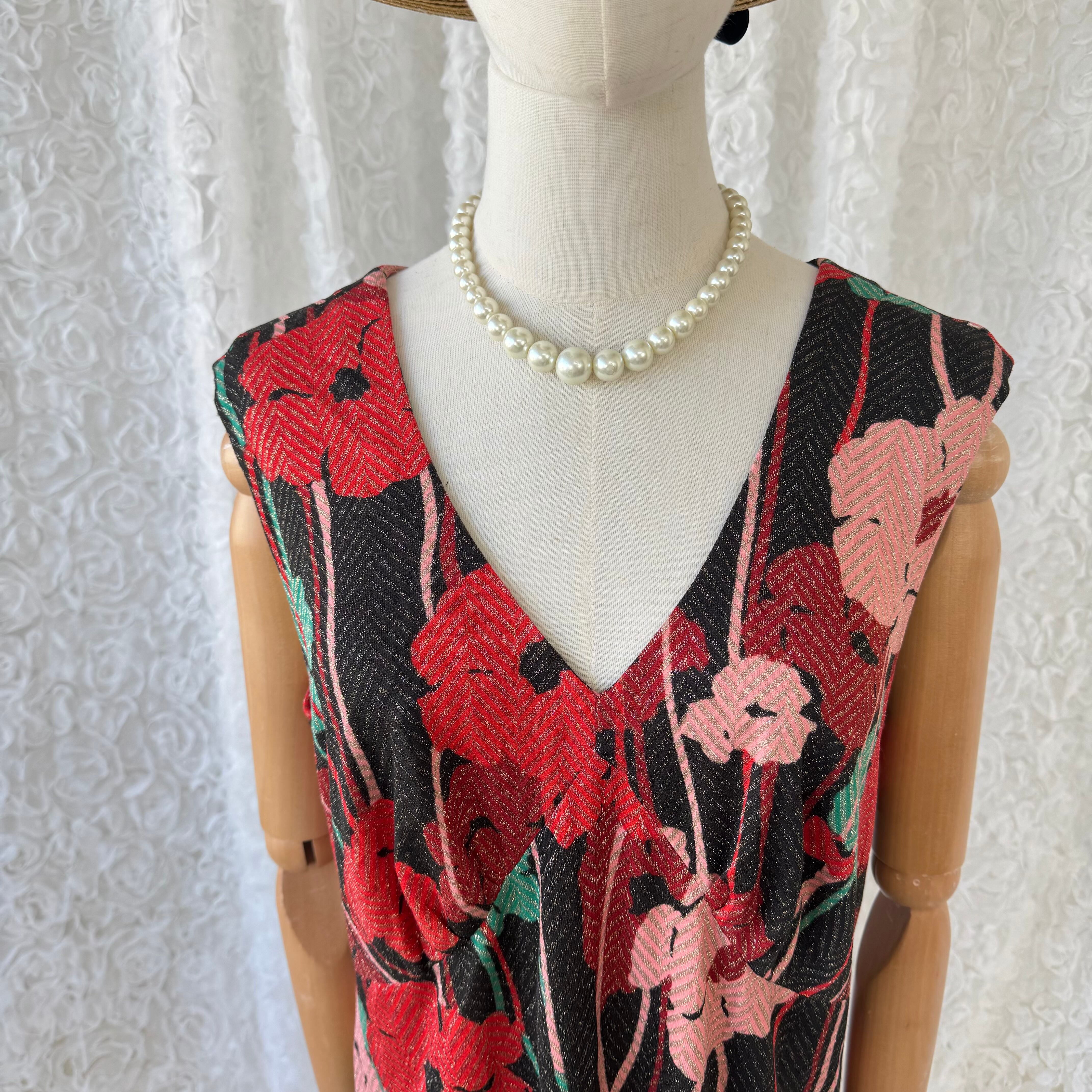 ヴィンテージ 花柄ロングワンピース Vネック ノースリーブ ブラック レッド 総柄