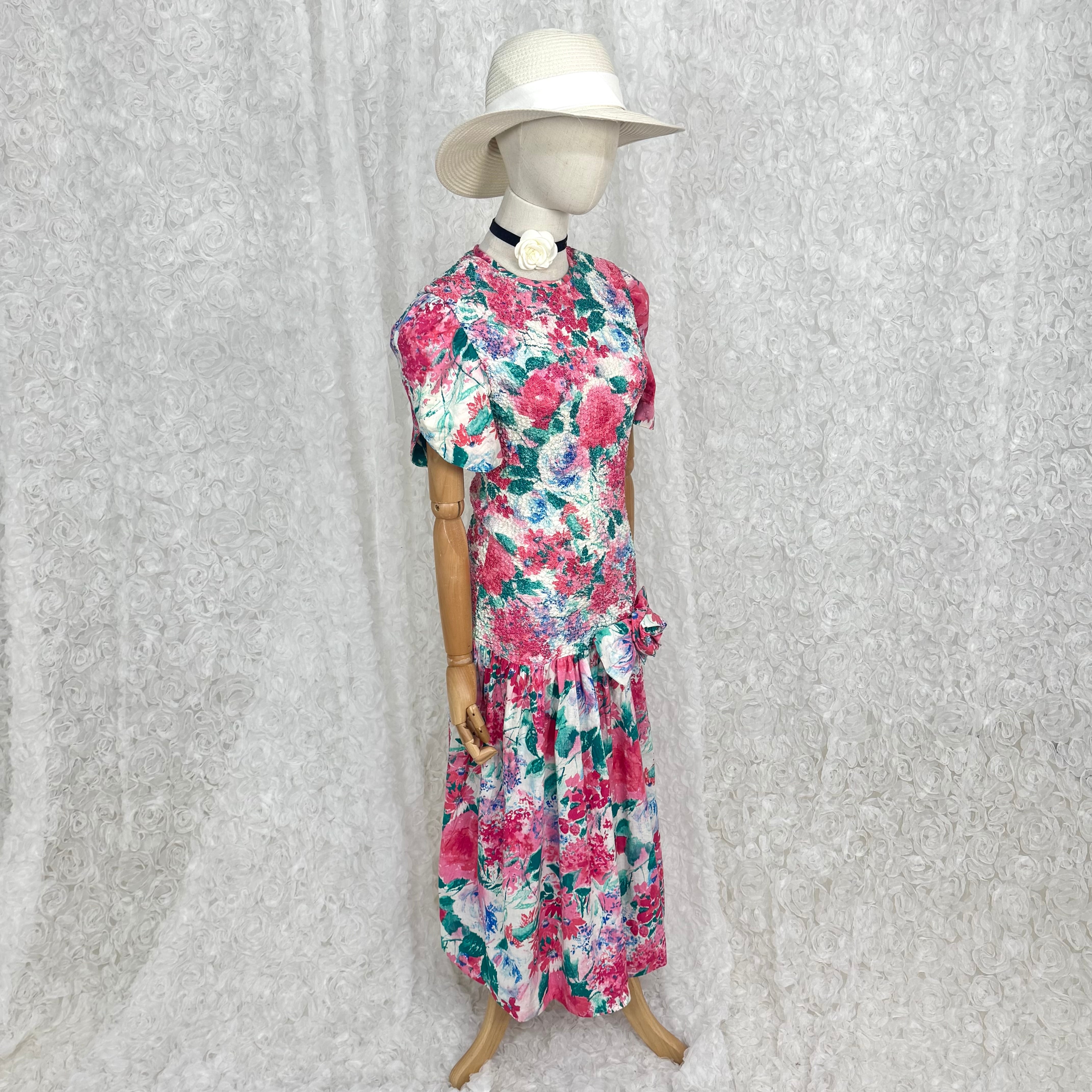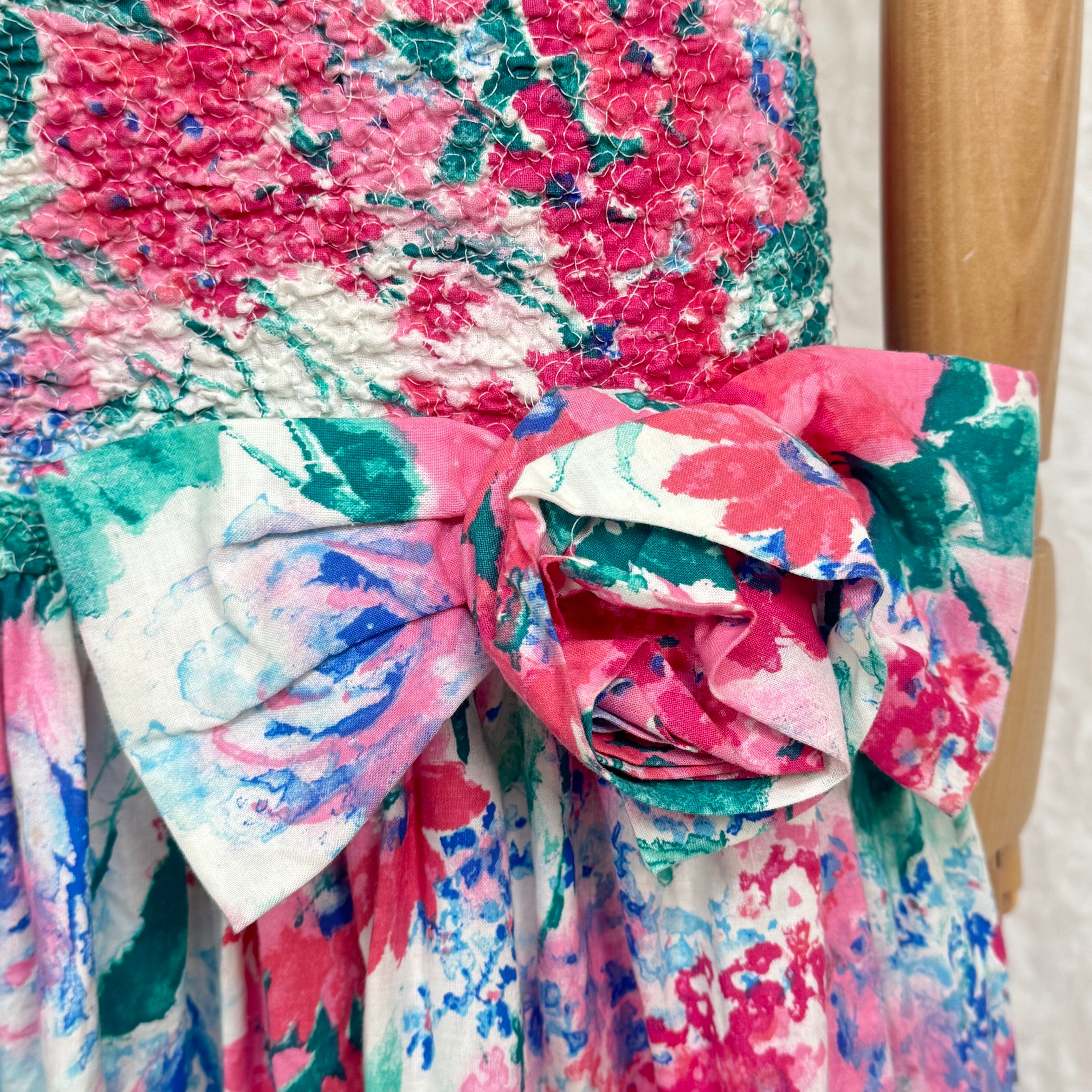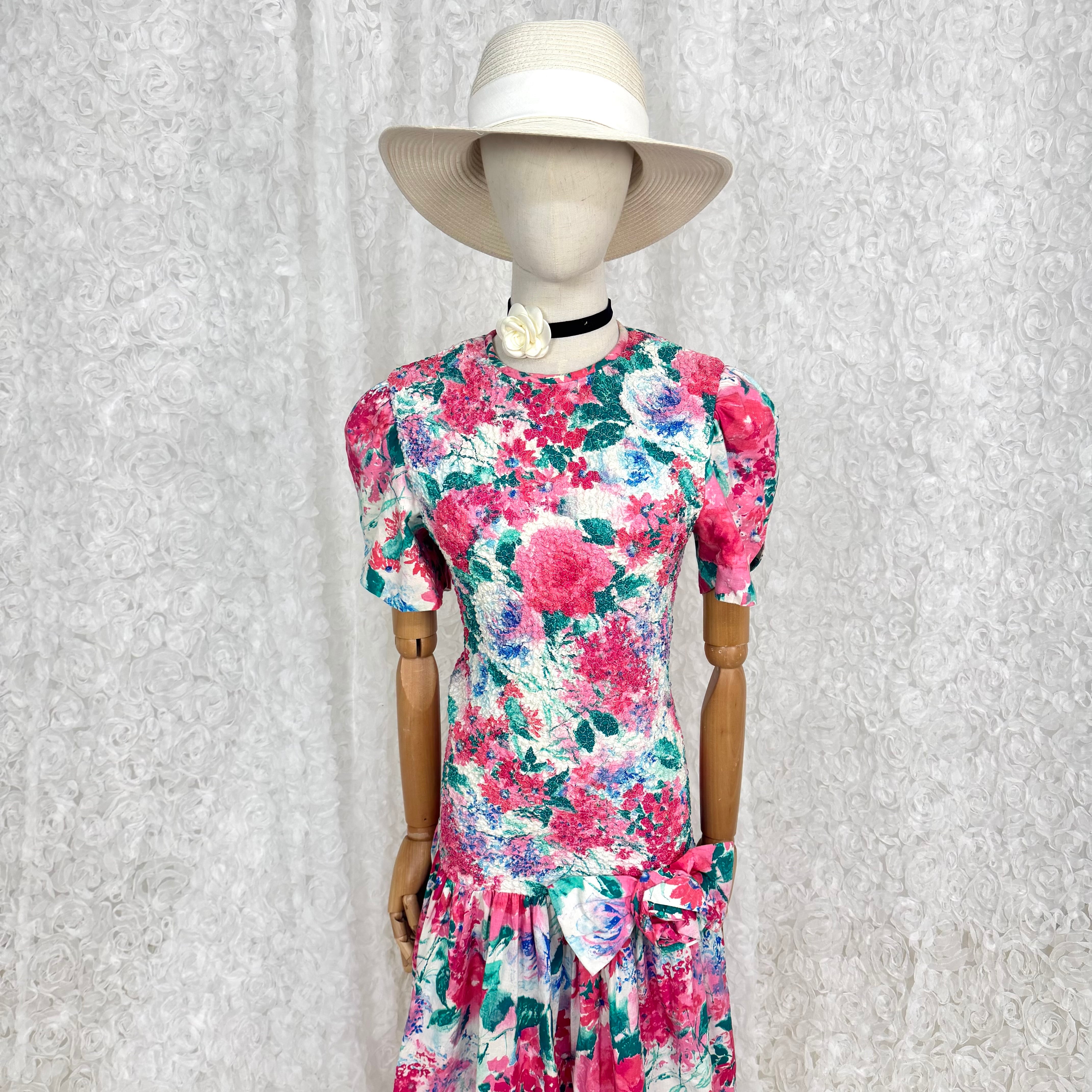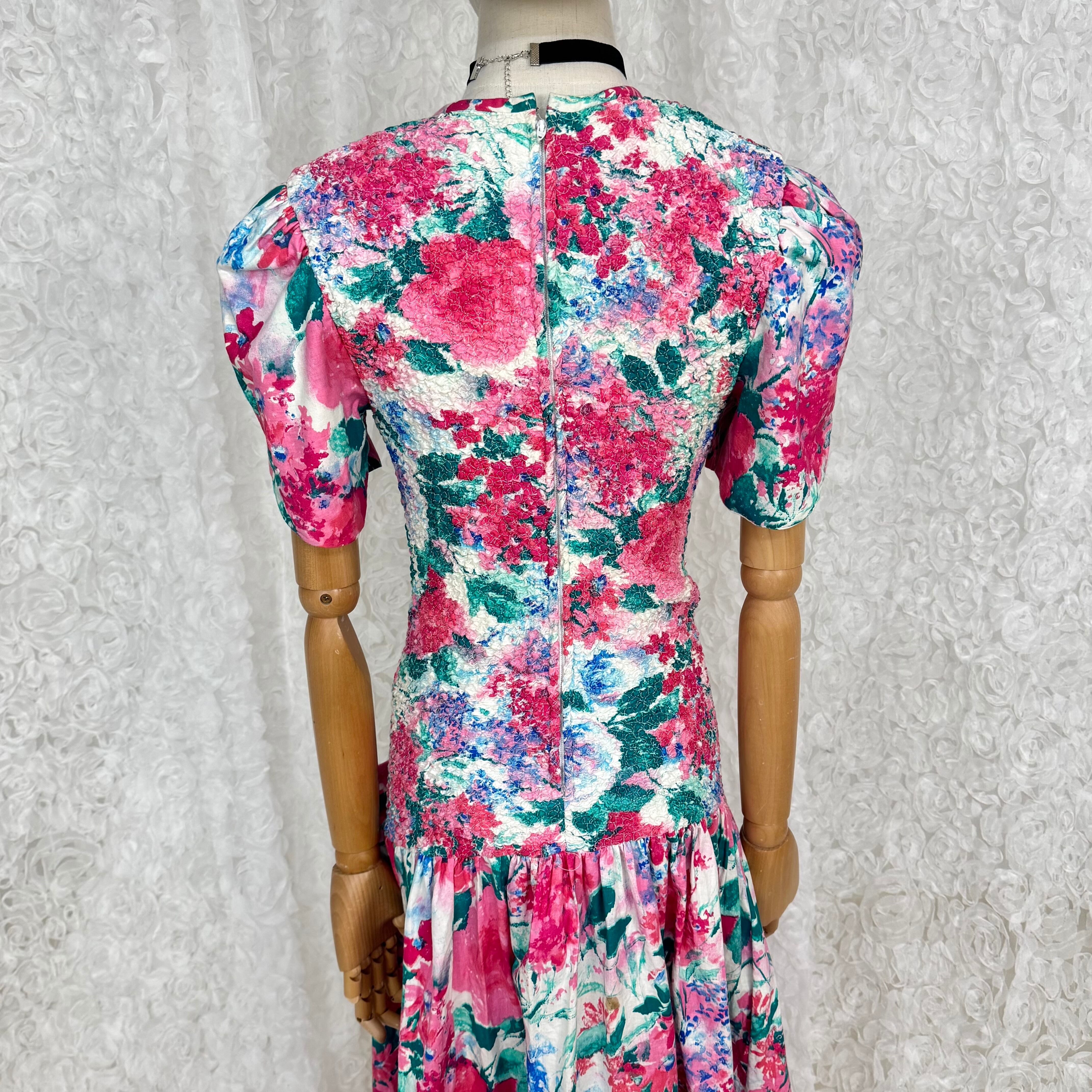 華やかなピンク×グリーンのフローラルプリントが目を惹くUSAヴィンテージワンピース。