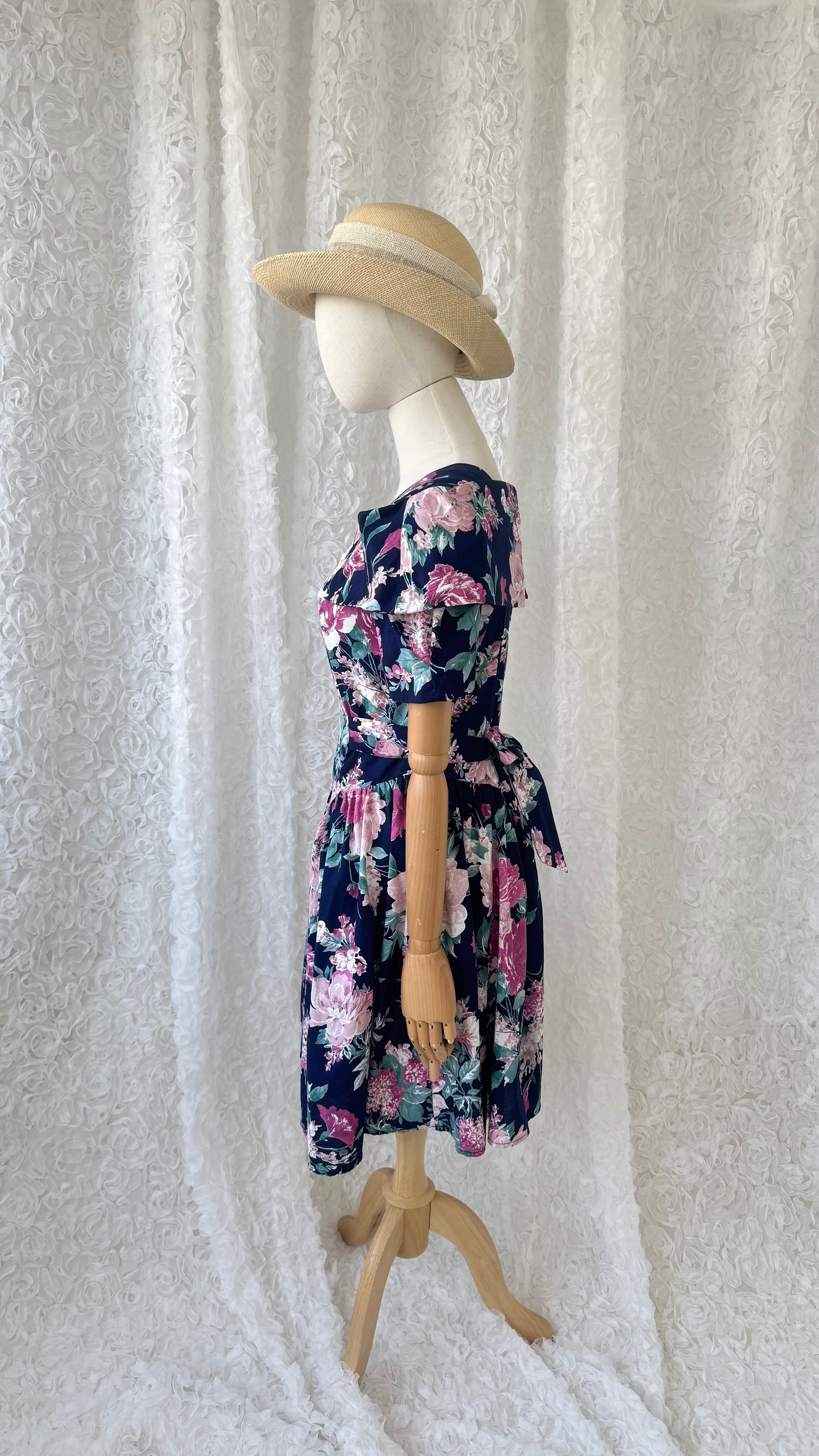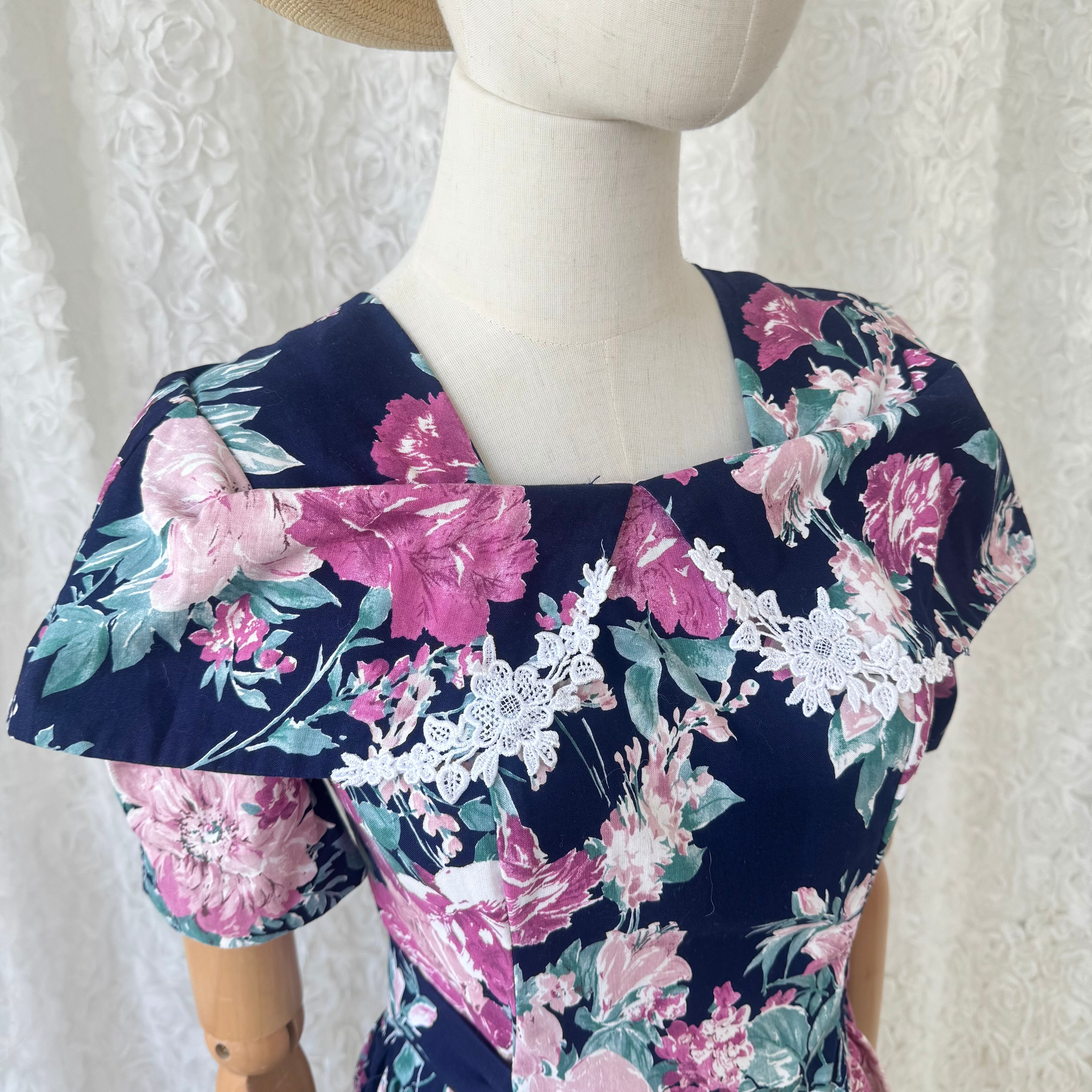 JESSICA STEVENS ヴィンテージ 花柄ワンピース ネイビー コットン フローラル 半袖 ワンピース USA古着 レトロ フレアワンピース