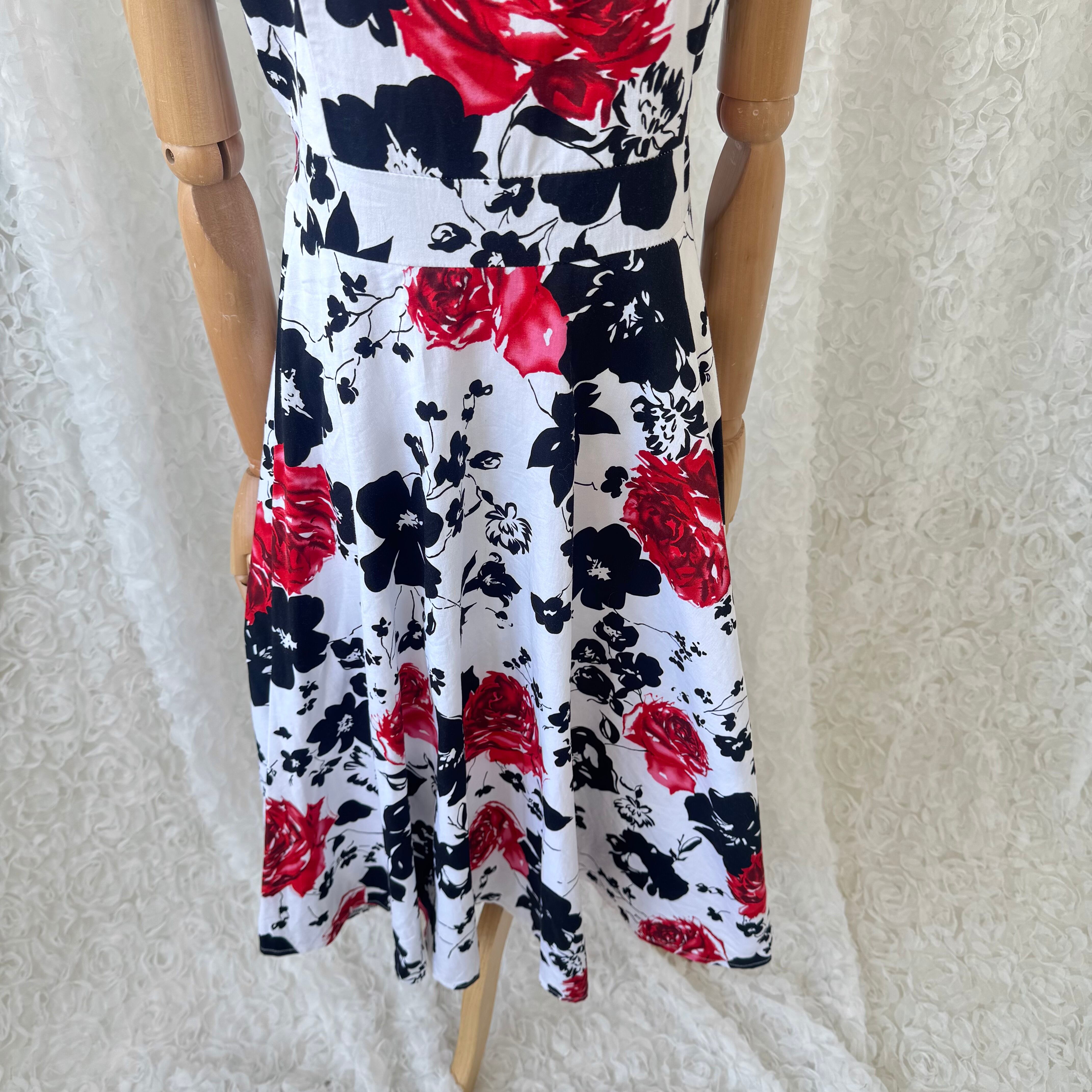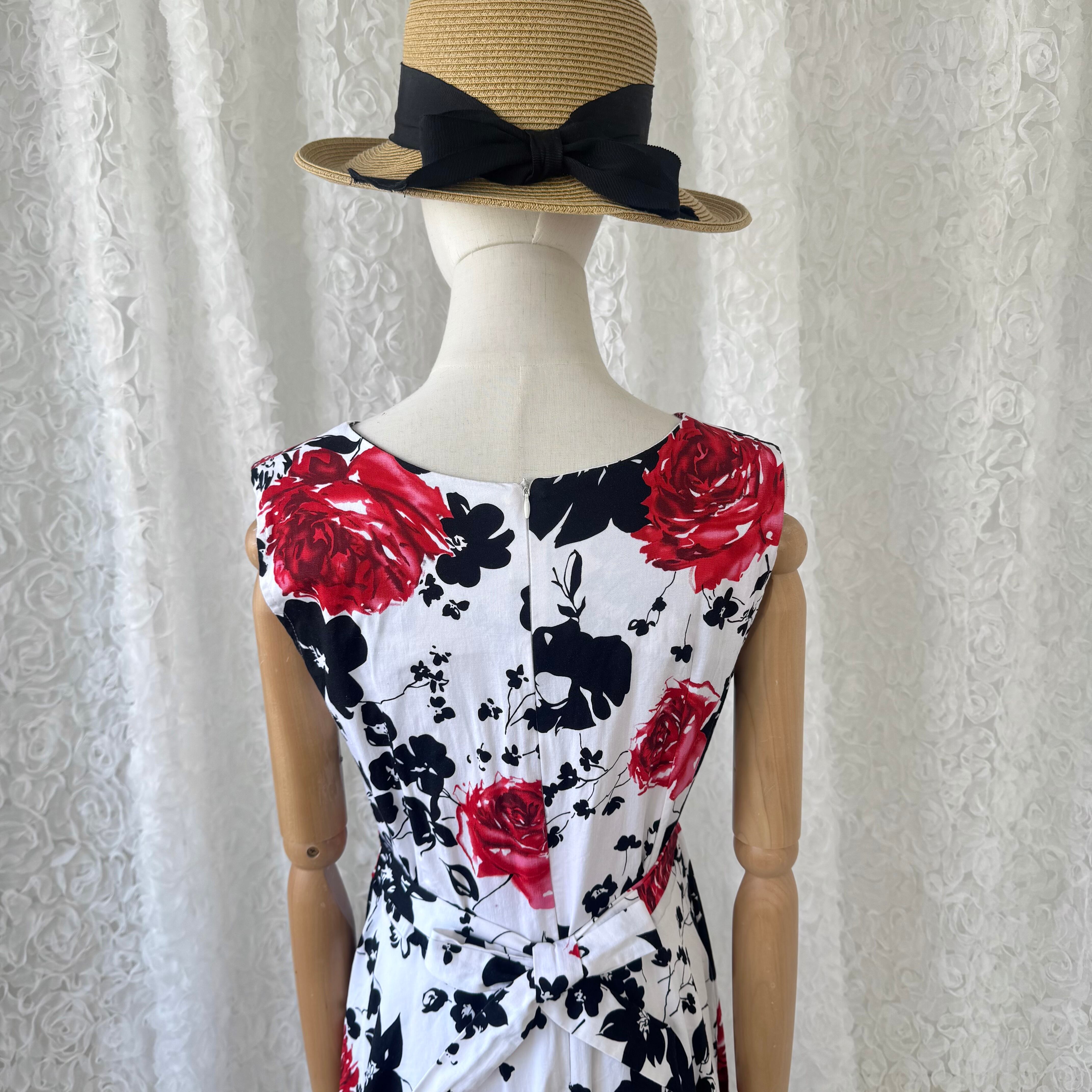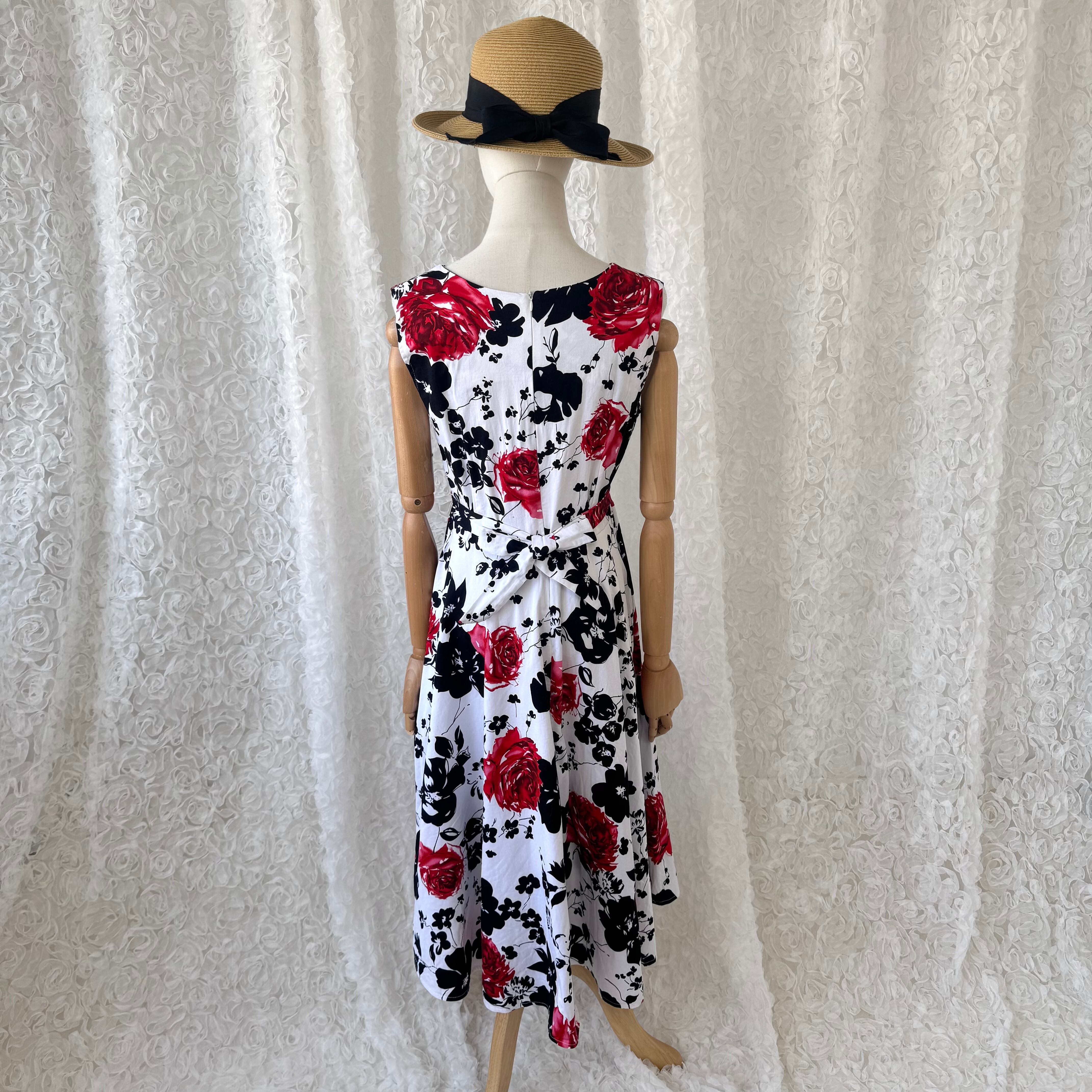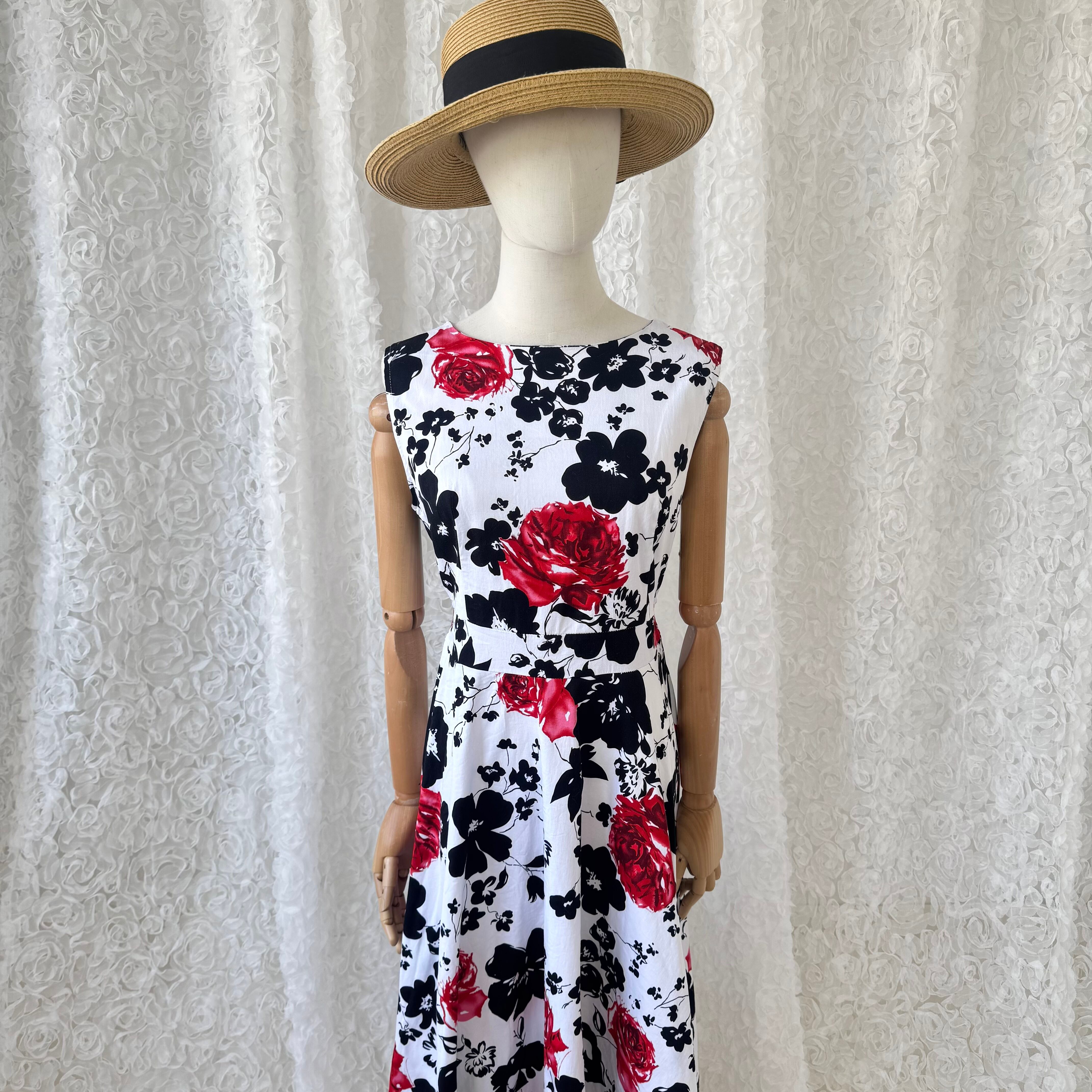 ヴィンテージ フラワープリント ワンピース ホワイト ブラック レッド 花柄 フレアワンピース ノースリーブ 薔薇柄 レトロ エレガント ミディ丈