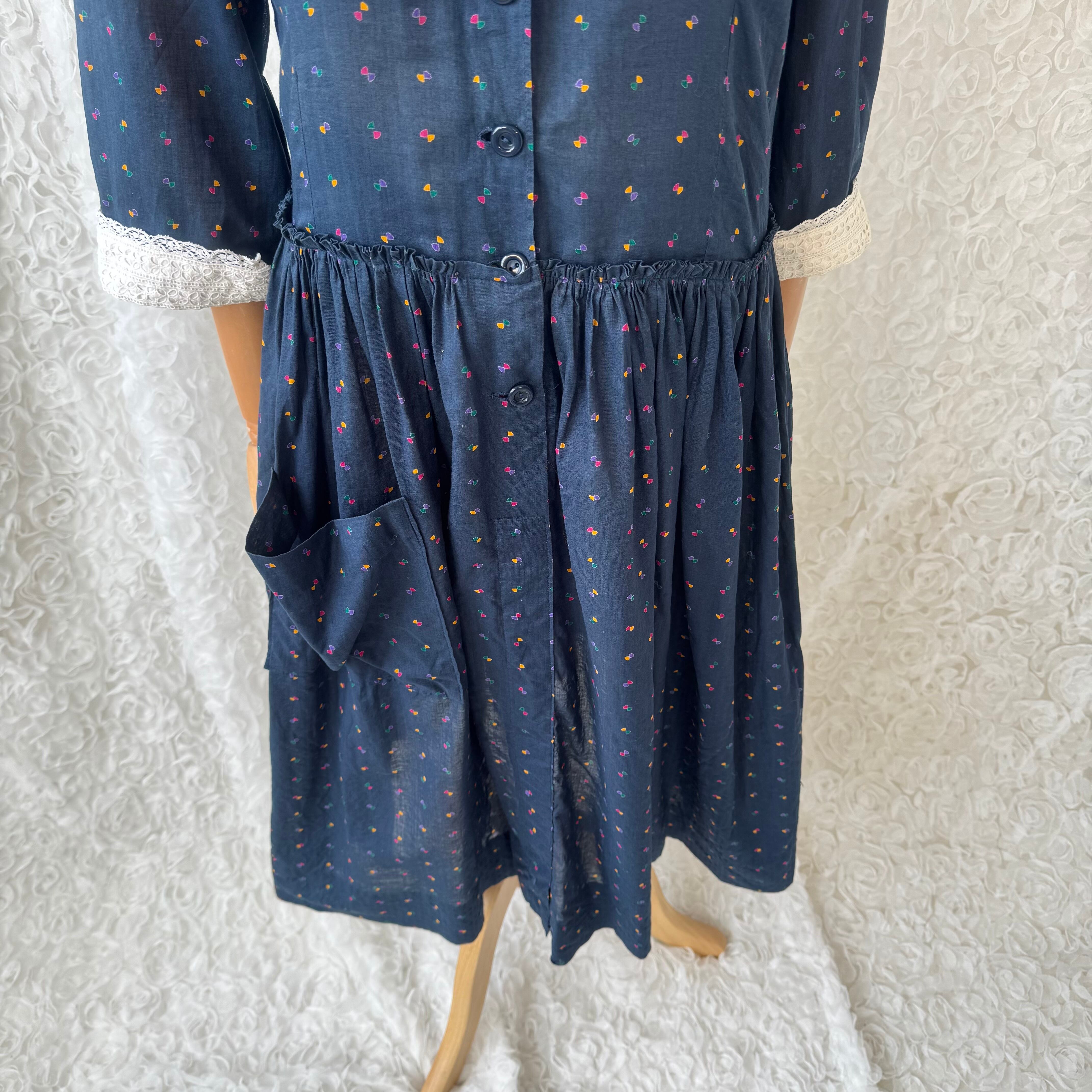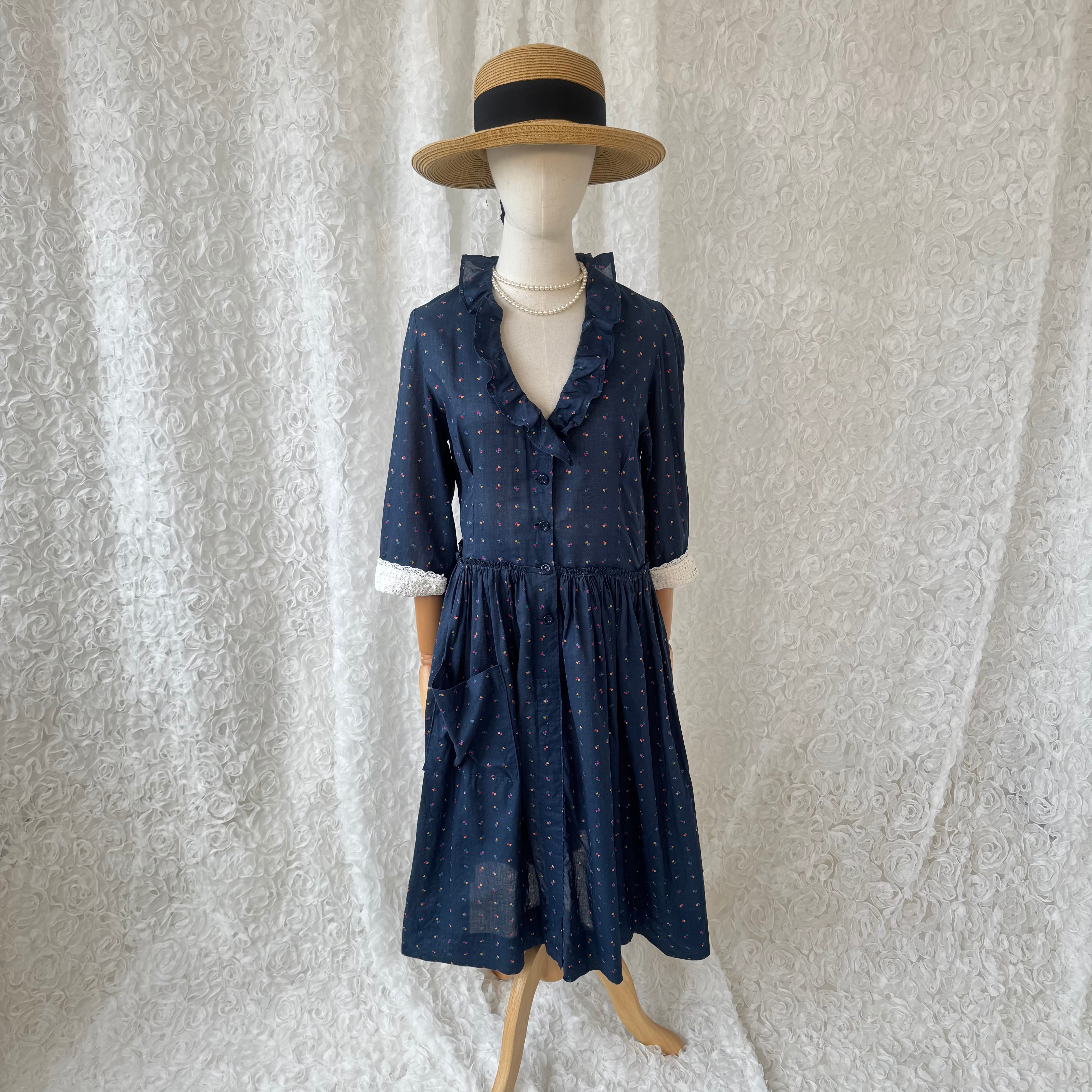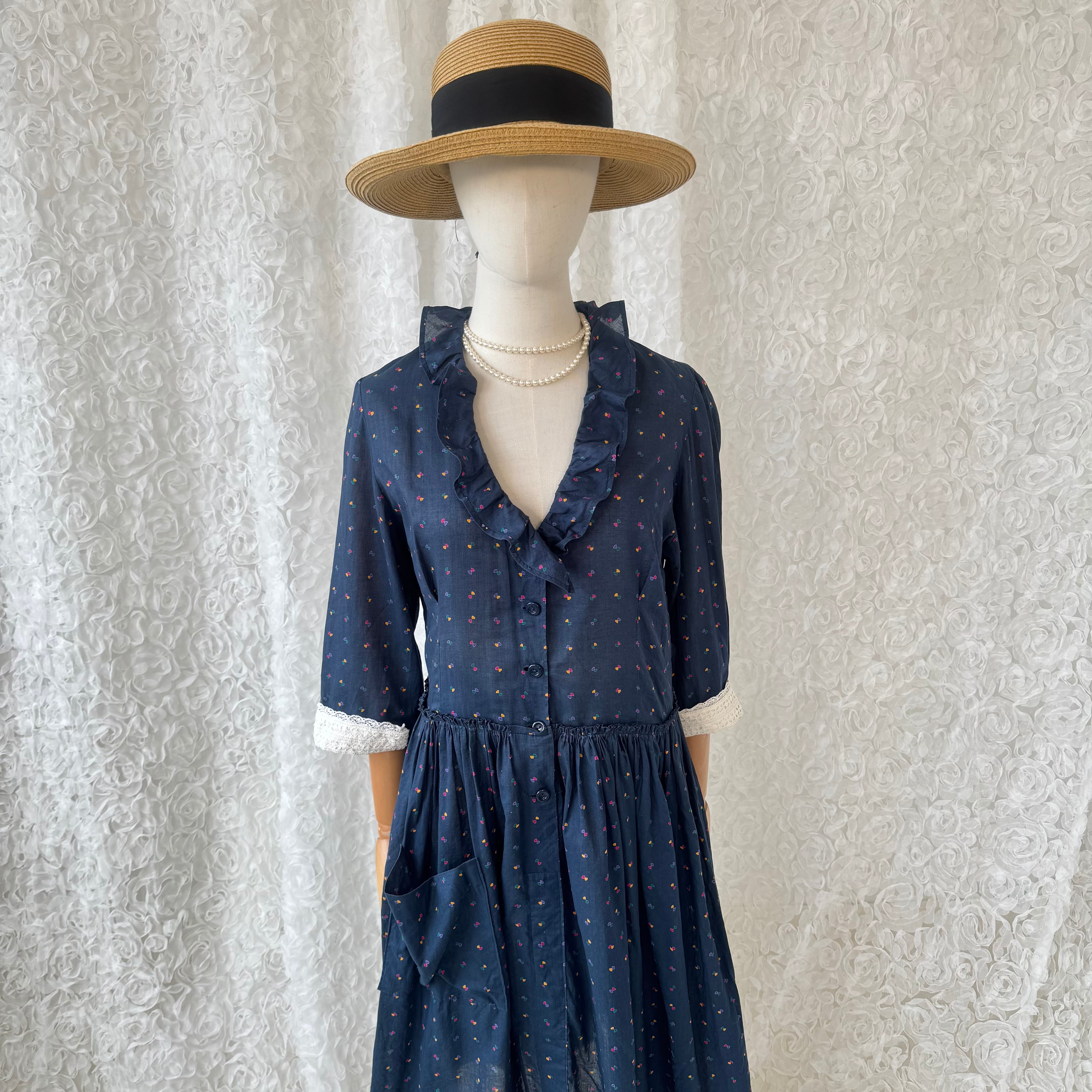 ネイビーカラーにカラフルな小さな小紋柄が散りばめられた可愛らしいレトロデザインのワンピース。