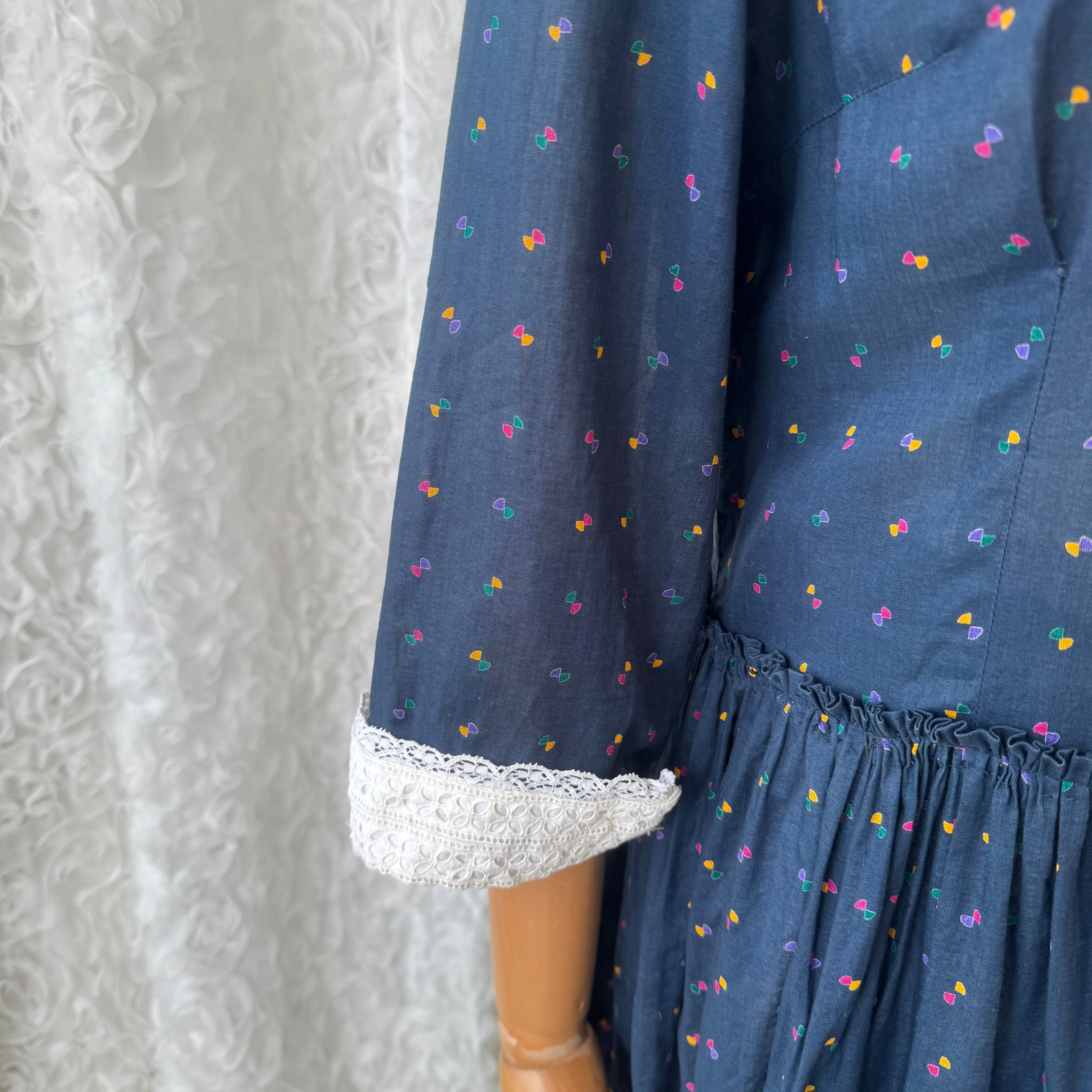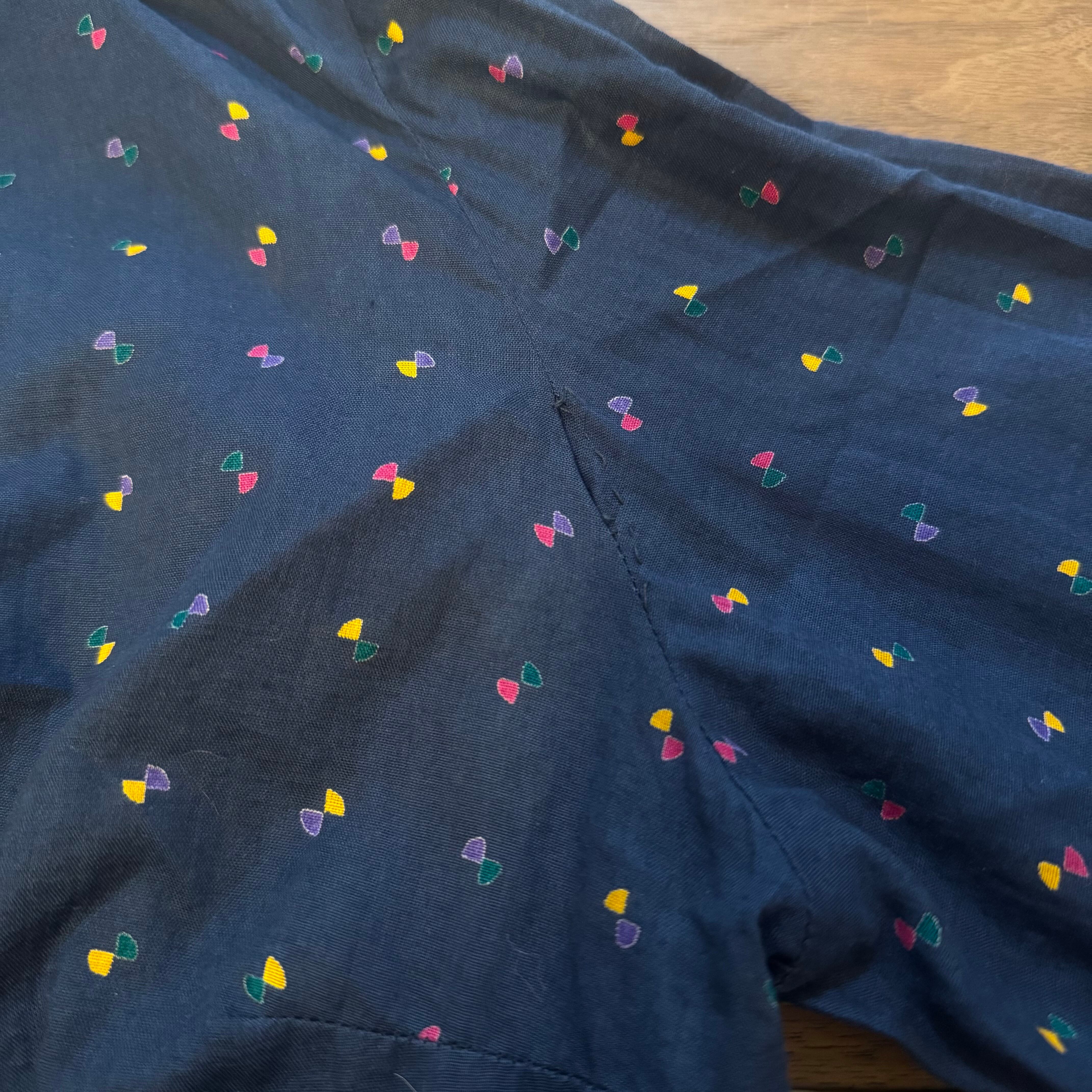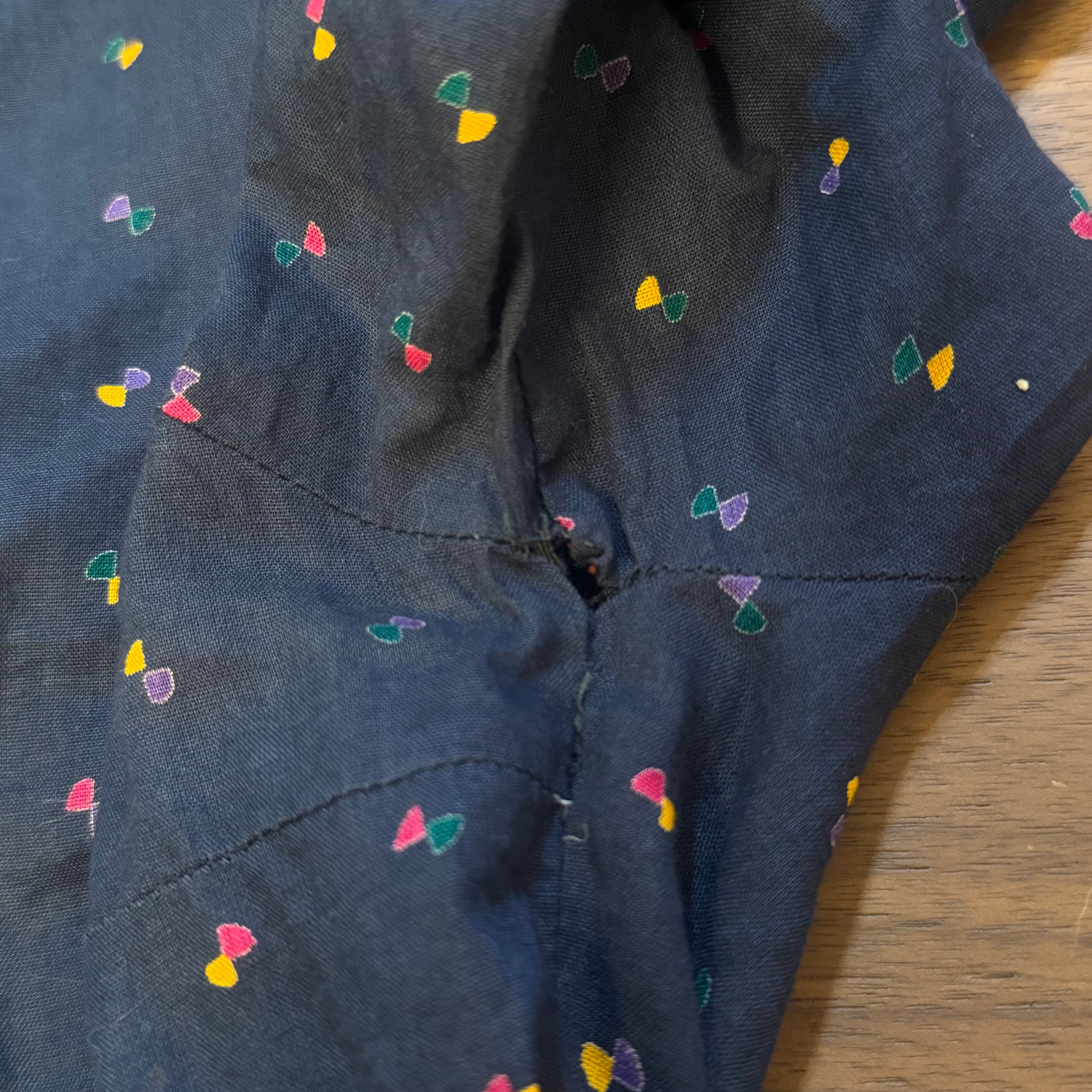 ネイビーカラーにカラフルな小さな小紋柄が散りばめられた可愛らしいレトロデザインのワンピース。