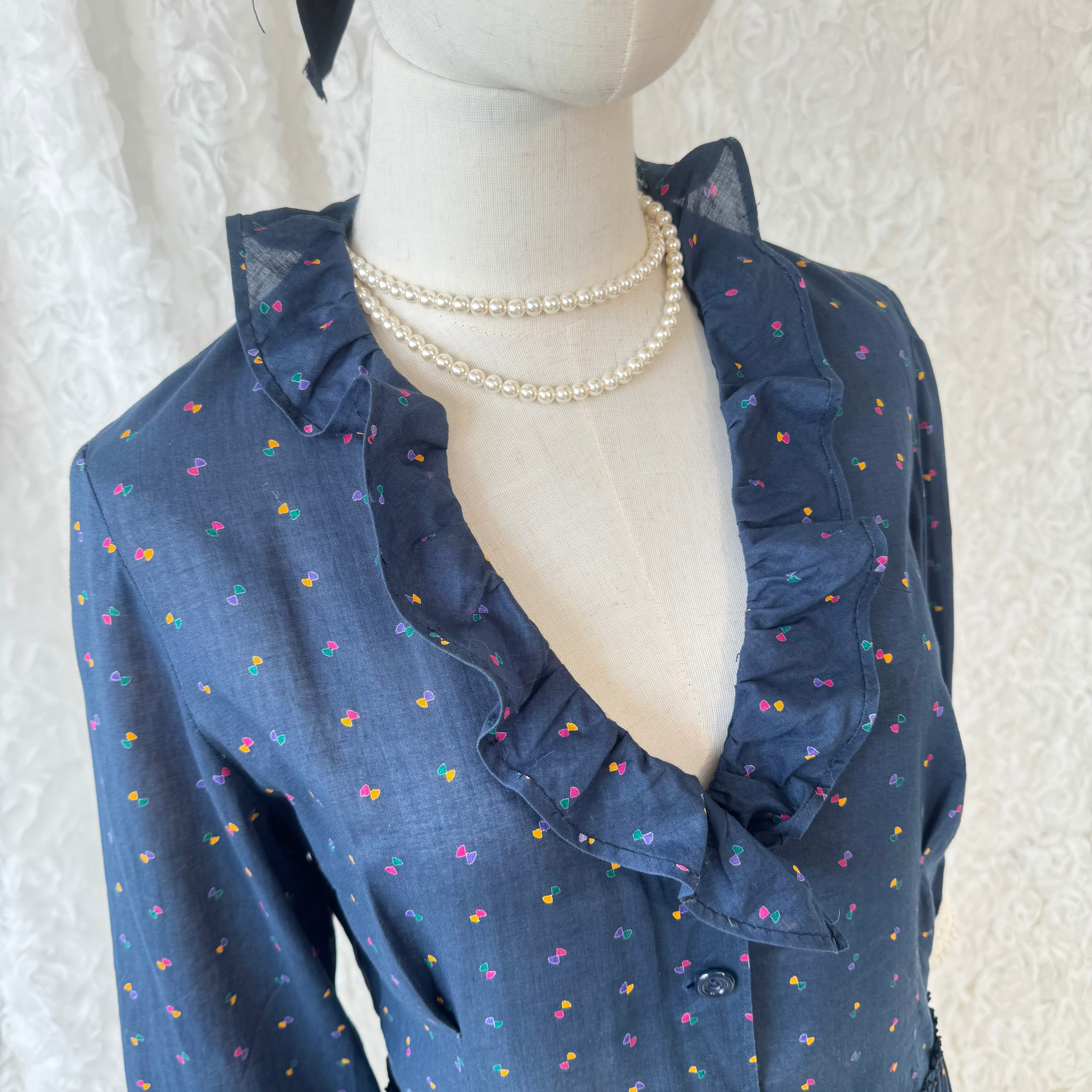レトロ 小紋柄ワンピース ネイビー フリル襟 ヴィンテージ風 フレアワンピース