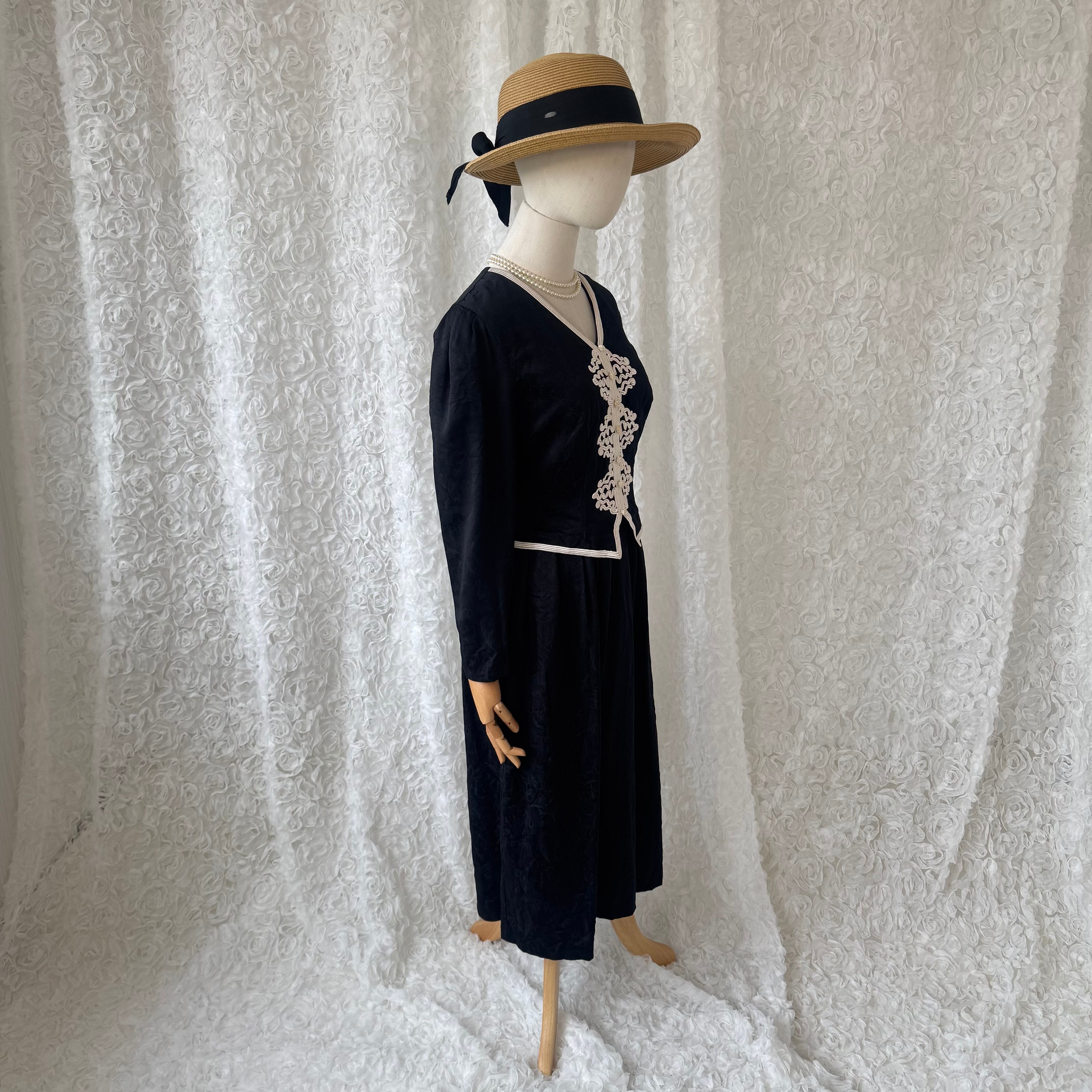 フロントにあしらわれた立体的なコード刺繍が目を惹く、クラシカルなヴィンテージワンピース。