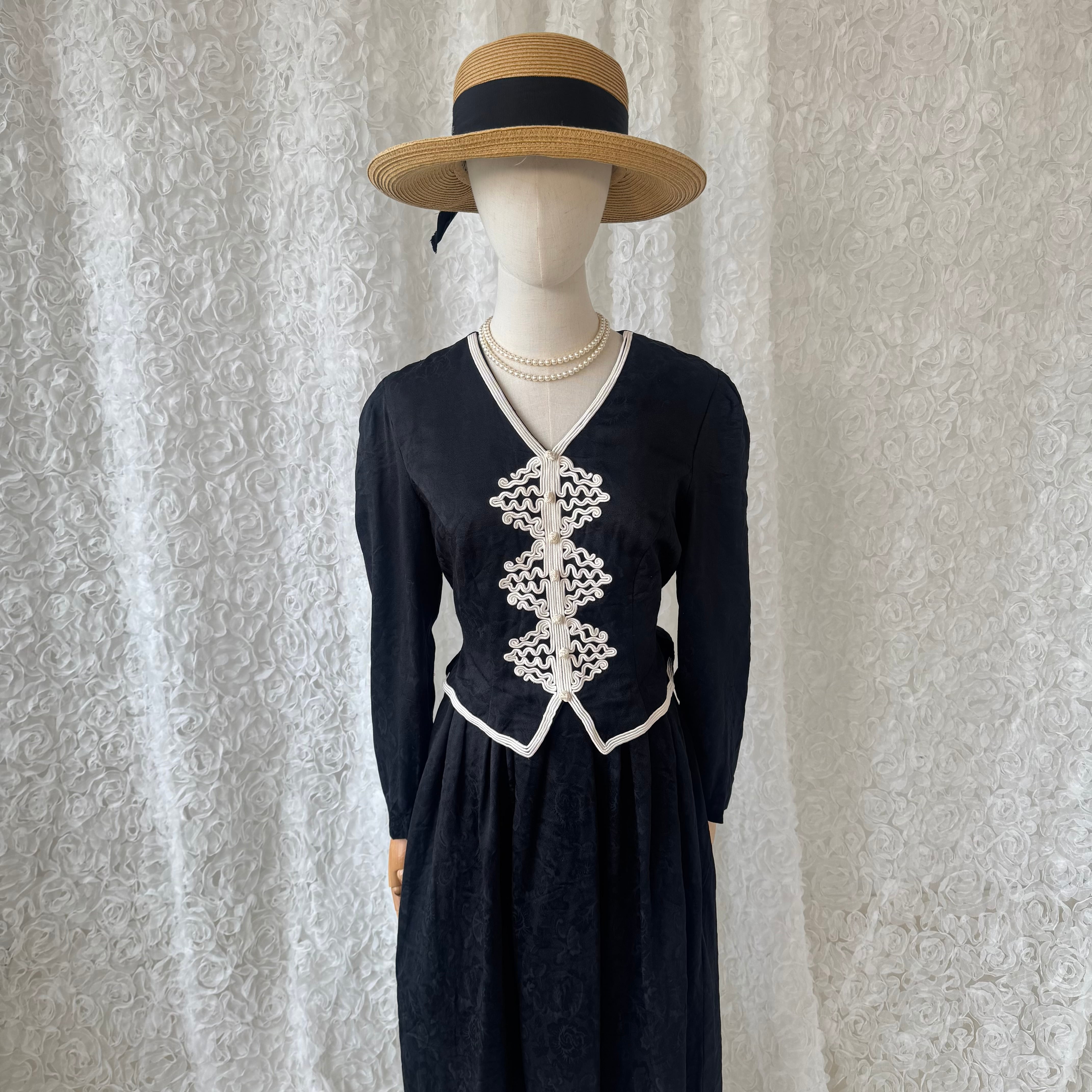 ヴィンテージ 刺繍デザイン モノトーンワンピース ブラック ホワイトコード装飾 長袖 レトロ クラシカル フレアワンピース