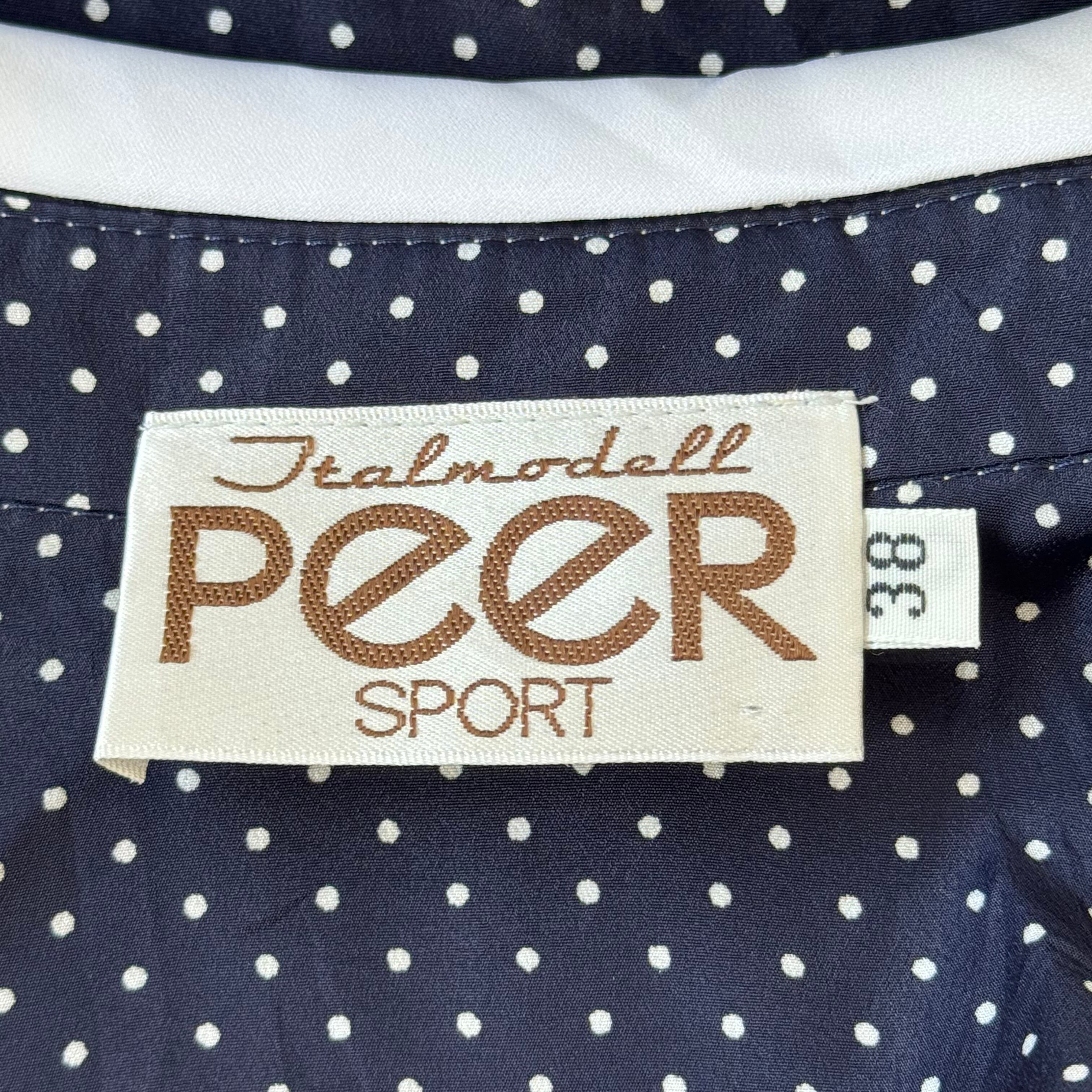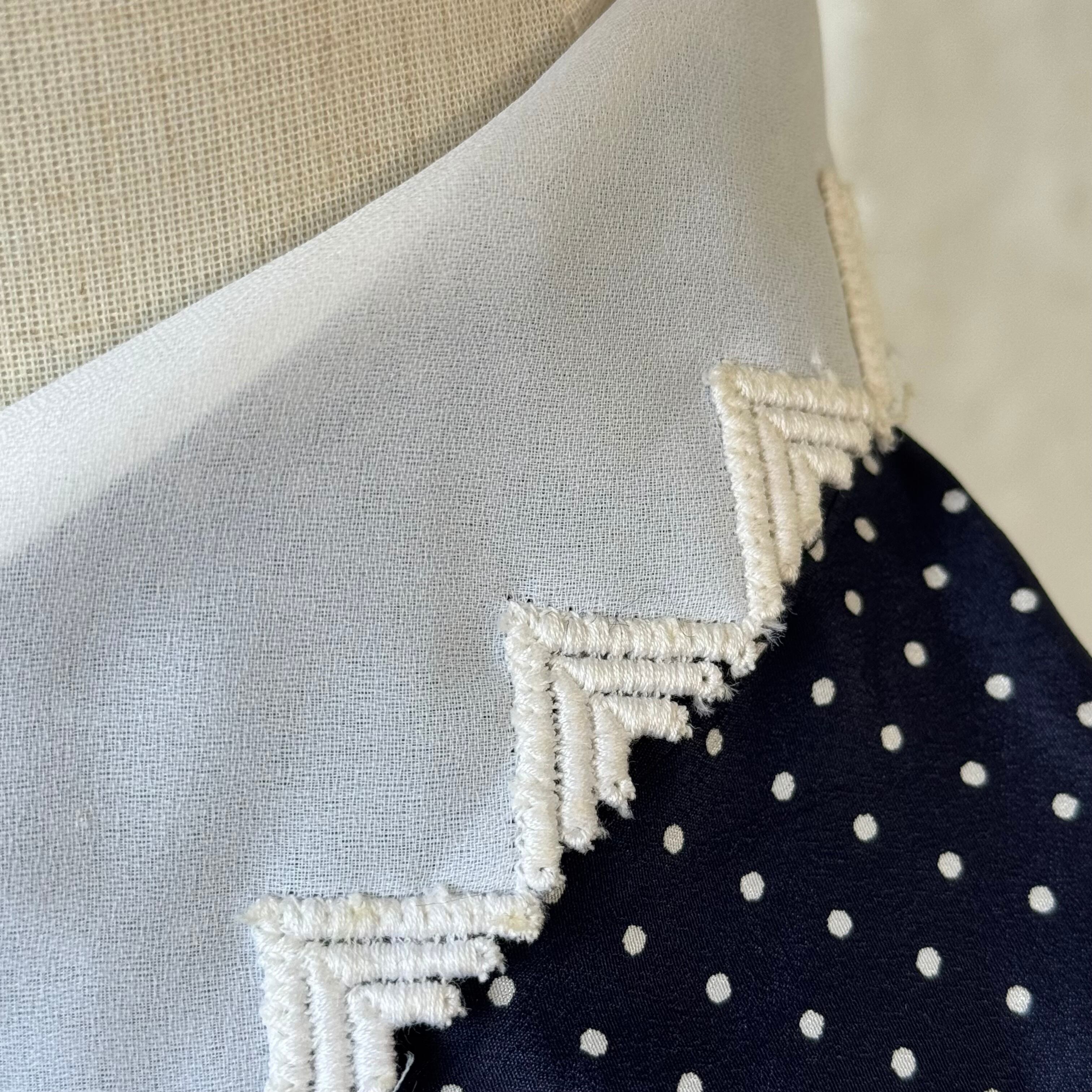 ネイビーベースに細かなドット柄、胸元には縦に並ぶフリルデザインが施され、上品でレトロな印象の一着です。